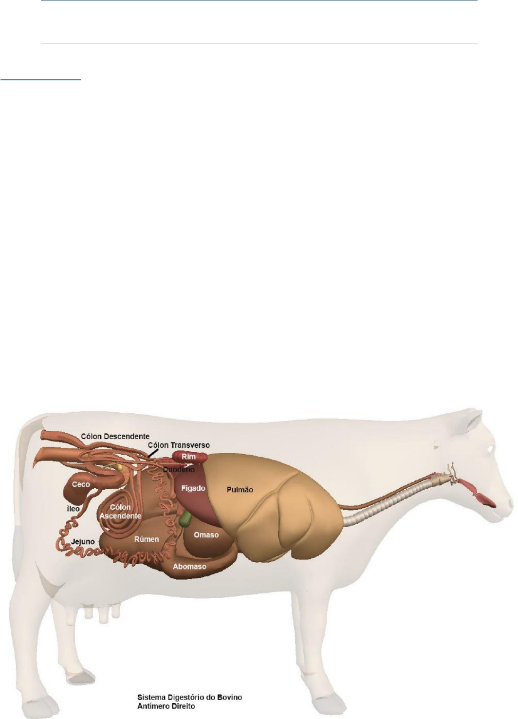 SISTEMA DIGESTÓRIO DE BOVINOS Anatomia • Rumen: fermentação microbiana e maceração. É o maior pré-estômago e é onde ocorre a fermentação microbiana. Os microrganismos presentes no rúmen são capazes de quebrar fibras vegetais complexas em substâncias simples, como ácidos graxos voláteis e gases. Esses produtos da digestão microbiana são absorvidos pelo animal como fonte de energia. • Reticulo: separação dos alimentos. Localizado ao lado do rúmen, o retículo ajuda a misturar o conteúdo alimentar e a formar bolos de alimentos chamando de “cud”. Este local é onde o animal onde o animal pode regurgitar o cud para mastigação adicional, conhecida como ruminação, antes de engoli-lo novamente para digestão final. • Omaso: absorção de água, minerais e maceração dos alimentos. Muitas vezes chamado de ‘filtro’ ou ‘estômago de água’ porque suas inúmeras dobras ajudam a absorver a água dos alimentos e a filtras partículas não digeríveis que o alimento passe para o abomaso. • Abomaso: digestão química. É o equivalente ao estômago dos humanos como outros animais monogástricos. Aqui ocorre a digestão final das proteínas, carboidratos e gorduras com a ajuda de enzimas digestivas ácidas secretadas pelas células do revestimento o estomago. • O ciclo motor dos reservatórios gástricos é dirigido principalmente pelo nervo vago, que é o maior responsável pela movimentação da musculatura gástrica. • O sistema nervoso autônomo é responsável pela inervação motora dos reservatórios gástricos. • Funções das contrações motoras dos reservatórios gástricos: mistura do liquido a alimentos sólidos, maceração dos alimentos fibrosos, distribuição do material alimentar para que haja absorção dos ácidos graxos voláteis no contato do líquido ruminal com a mucosa do rúmen, filtragem de partículas alimentares (as pequenas vão parao omaso e as maiores volta para o rúmen), eliminação de gases (eructação), regurgitação do material fibroso (nova mastigação e insalivação. • Quando o alimento não é mastigado de forma eficiente e é ingerido, quando chega ao rúmen e ao retículo são submetidos a maceração pelas contrações ruminais e pela degradação (microrganismos presentes no ambiente ruminal). Depois o conteúdo retorna para a cavidade bucal para ser novamente mastigado, insalivado e deglutido. Quanto mais fibrosa for a dieta do bovino, maior será o tempo destinado à ruminação. Cerca de 7h são gastas por dia para ruminar. • Causa de diminuição da ruminação: hipomobilidade ou atonia ruminal, depressão do sistema nervoso central, dor, dano mecânico ao retículo (peritonite) • Timpanismo (gasoso/espumoso) = acúmulo excessivo de gases no rúmen/retículo • As populações microbianas mais importantes que habitam o rúmen são as bactérias, protozoários e leveduras. • Sequência da estratificação do rúmen em um bovino sadio: embaixo líquido e fibras finas; no meio fibras finas; acima fibras longas/grosseiras; no topo conteúdo gasoso. Anamnese • Aspectos fundamentais: Importante analisar emagrecimento, tempo de evolução da doença, tipo de alimentação características macroscópicas das fezes. 1. O animal: histórico do animal e/ou rebanho; tratamento anterior; tempo de evolução. A idade é um dos aspectos mais importantes pois tem relação direta com o desenvolvimento do sistema digestório. Deslocamento de abomaso e reticulite traumática são mais comuns em vacas de leite e raro em bovino de corte. A história da doença é algo muito importante a ser levado em consideração. → Super aguda: 0 a 24h → Aguda: 24 a 96h → Subaguda: 4 a 14dias → Crônica: mais de 14 dias → Transtornos fermentativos (timpanismo espumoso e acidose) = são rápidos → Distúrbios motores e de origem parasitário = quadros longos 2. O ambiente: tipo de criação/manejo -> regime extensivo? Confinados? Por exemplo áreas íngremes e irregulares podem ser causas de ectopia abomasal. 3. A alimentação: tipo de alimentação; mudança no manejo alimentar; relação volumoso concentrado. A alimentação determina o tipo de fermentação, então é importante saber se houve mudança, qual tipo de mudança, há quanto tempo ocorreu... Exame clínico • Exame clínico geral → Atitude e postura: se possível durante alimentação e defecação → Condição dos pelos e pele → Respiração → Corrimentos (ânus, boca...) → Mucosa, linfonodos → Parâmetros vitais: temperatura, FC, FR, frequência dos ruídos ruminais → Estação x decúbito → Escoiceamento do abdômen – DOR! → Apetite e condição nutricional: anorexia, apetite seletivo/pervertido → Ruminação • Suspeita de afecção no TGI: sinais e sintomas indicadores -> não existem sinais/sintomas patognomônicos que determinem com exatidão o comprometimento primário do sistema digestório. a) Assimetria do contorno abdominal: a inspeção a distância é o primeiro passo da conduta do exame. O aumento de volume da cavidade abdominal em um animal com história de anorexia ou inapetência há 2 dias é indicativo de envolvimento do sistema digestório. Deve olhar o animal dos dois lados e determinar o grau de simetria -> pode ser unilateral, bilateral, dorsal, ventral. Em bovinos sadios o lado esquerdo é mais proeminente que o direito. Principais materiais que podem promover alteração no contorno abdominal: o Gás: timpanismo. Deforma na porção ventral do abdômen direito. o Líquido: ascite, uroperitônio. Fica com aspecto caído. o Sólido: ingestão acidental de grande quantidade de grãos de uma única vez, causando acidose ruminal (alteração da flora) e alterações no nervo vago. Deforma na porção ventral do abdômen esquerdo. Se persistir pode afetar a porção superior do flanco esquerdo e lado direito do abdômen. A presença de um feto grande ou dois fetos também pode deixar o abdômen abaulado