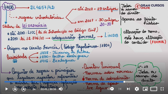 LINDB, LEI DAS LEIS, LEX LEGUM (Decreto Lei 4657/42) Regras introdutórias – até 2018 = 19 artigos (todos os ramos do direito). Em 2018 – Artigos de 20 a 30 (aplicam-se apenas ao Direito Público) Possui status de Lei Ordinária *até 2010 chamava-se LICC (LEI DE INTRODUÇÃO AO CÓD. CIVIL) *2010 – A lei 12.376/10 – adequação formal deu-lhe o nome de LINDB (APENAS ALTERAÇÃO DO NOME, NÃO CONTEÚDO) ORIGEM: Direito Francês (Código Napoleônico de 1804) A LINDB é um conjunto de normas e princípios que regulam aspectos referentes a outras leis (vigência, aplicação, interpretação, direito internacional, questão transitória) É uma lei autônoma que tem caráter universal. Normas sobre normas ou Norma de sobredireito, norma de apoio, Lex Legum. Curiosidade: 1858 – Teixeira de Freitas; 1890 – Coelho Rodrigues; 1916 – Bevilaqua (ideias de lei preliminares) Norma aplicada a todo o ordenamento jurídico Art. 1 – Lei vigora 45 dias após publicada oficialmente, salvo disposição contrária. Par1 – no estrangeiro é obrigatória, inicia 3 meses depois de publicada Par2 – Leis estaduais autorizadas pelo Governo, depende de aprovação do Governo e começa no prazo que a lei estadual fixar. Par3 – Havendo nova publicação de texto, corrigindo a lei, o prazo de 45 dias deste artigo e dos parágrafos anteriores começará o correr da nova publicação. Par3 – As correções a exto de lei já em vigor consideram-se lei nova. Art. 2 – Se não for temporária, a lei terá vigor até que outra modifique ou revogue. Par1. a) Revoga anterior quando declarado expressamente; b) quando há incompatibilidade; c) quando regule inteiramente a matéria de que tratava a lei anterior. Par2. a) Lei nova que estabeleça disposições gerais ou especiais já existentes na anterior, não revoga nem modifica a anterior Par. 3. a) Salvo disposição em contrário, a lei revogada não se restaura por ter a lei revogadora perdido a vigência. Art. 3. – Ninguém se escusa (se desobriga) de cumprir a lei, alegando desconhecimento dela. Art. 4. – Quando a lei for omissa, o juiz decidirá o caso de acordo com a: ANALOGIA, OS COSTUMES E OS PRINCÍPIOS GERAIS DE DIREITO. Art. 5. – Na aplicação da lei, o juiz atenderá aos FINS SOCIAIS a que ela se dirige e às EXIGÊNCIAS DO BEM COMUM. Art. 6. – A lei em vigor terá efeito imediato e geral, respeitados o ato jurídico perfeito, o direito adquirido e a coisa julgada Par.1 – Reputa-se ato jurídico perfeito o já consumado segundo a lei vigente ao tempo em que efetuou. Par.2 – Direitos adquiridos aqueles que o titular, ou alguém por ele, possa exercer, como aqueles cujo começo do exercício tenha termo prefixo, ou condição preestabelecida inalterável, a arbítrio de outrem. Par.3 – Coisa julgada ou caso julgado a decisão judicial de que já não caiba recurso. image1.png