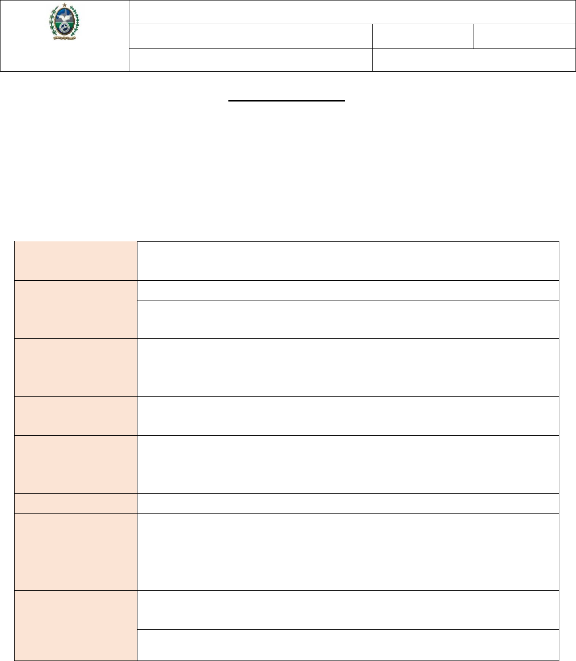 Instituto de Educação Carmela Dutra Nome: Disciplina: Nº: Turma: Professor(a): Data:______/ ______ /______ PLANO DE AULA Um plano de aula é um documento que contém informações detalhadas sobre como um professor planeja ensinar uma determinada matéria ou tópico em uma determinada aula. É uma ferramenta importante para garantir que os objetivos de aprendizagem sejam alcançados de forma eficaz e que o tempo da aula seja utilizado de maneira eficiente. Referências Bibliográficas: Plano de aula (como fazer, modelo e exemplos). Disponível em: <https://www.todamateria.com.br/plano-de-aula/>. Tema Com base no plano de ensino, planejamento que envolve tarefas e objetivos docentes para um ano letivo completo, o professor deve escolher um tema. Público-alvo O grupo que será destinado à atividade Habilidades na BNCC Competências gerais segundo a Base Nacional Curricular Comum. Cada uma delas é identificada através de um código, que deve ser indicado no plano de aula. Objetivos de aprendizagem O que os alunos devem ser capazes de fazer ou saber ao final da aula. O objetivo é aquilo que o professor deseja que os alunos aprendam com a aula. É importante frisar que não existe um limite de objetivos por plano de aula. Descrição da aula O roteiro, as técnicas e métodos que o professor usará para ajudar os alunos a alcançar os objetivos de aprendizagem. Recursos necessários Os materiais e equipamentos que serão necessários para a aula. Os recursos didáticos são materiais de apoio que auxiliam o professor de forma pedagógica, facilitando o desenvolver da aula. Avaliação Como o professor avaliará se os alunos alcançaram os objetivos de aprendizagem Cronograma Uma agenda detalhada que inclua o tempo estimado para cada atividade na aula. A duração da exploração de determinado tema fica a critério do professor, tendo em conta o conteúdo programático que ele deve seguir. Não é obrigatório que cada tema seja explorado em uma única aula. Referências Bibliográficas Fonte utilizada para montar o plano de aula (site, revistas, livros...) Observações Campo para preencher caso queira acrescentar alguma informação adicional. Exemplo de Plano de Aula: Tema Animais domésticos Faixa etária Crianças bem pequenas (1 ano e 7 meses a 3 anos e 11 meses) Habilidades na BNCC • (EI02TS03) Utilizar diferentes fontes sonoras disponíveis no ambiente em brincadeiras cantadas, canções, músicas e melodias. • (EI02EF06) Criar e contar histórias oralmente, com base em imagens ou temas sugeridos. • (EI02ET03) Compartilhar, com outras crianças, situações de cuidado de plantas e animais nos espaços da instituição e fora dela. Objetivos de aprendizagem • Identificar diferentes animais domésticos e seus nomes. • Desenvolver habilidades motoras através de atividades com animais. • Estimular a criatividade e a imaginação dos alunos. Descrição da aula • Apresentação de imagens de diferentes animais domésticos e seus nomes. • Contação de histórias sobre animais domésticos. • Atividades com recortes e colagem para construção de animais de papel. • Atividades de movimento, como imitar o som e o movimento dos animais, andar como um cachorro, pular como um coelho etc. Recursos necessários • Imagens de animais domésticos. • Papel, tesoura e cola para as atividades de recortes e colagem. • Músicas infantis com sons de animais. Avaliação • Observação direta das habilidades motoras e criatividade dos alunos durante as atividades. • Conversa em grupo sobre o que foi aprendido sobre os animais domésticos. Cronograma • Apresentação das imagens dos animais domésticos e seus nomes (10 minutos) • Contação de história sobre animais domésticos (10 minutos) • Atividade de recortes e colagem para construção de animais de papel (20 minutos) • Atividades de movimento imitando os animais (20 minutos) • Conversa em grupo sobre o que foi aprendido (10 minutos) Referências Bibliográficas https://www.educlub.com.br/atividades-sobre-animais-domesticos- para-educacao-infantil/ Observações: (Nenhuma)