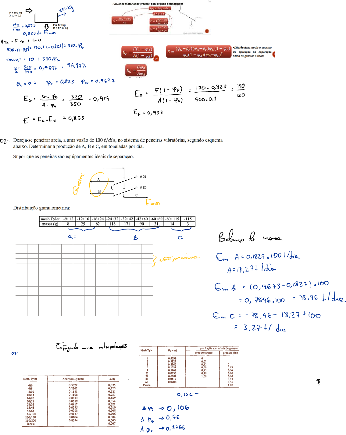1. Uma peneira é alimentada com 500 kg de cevada moída que apresenta 30 % da fração desejada (partículas menores que a abertura da peneira em análise). Após o processo de peneiramento, verifica-se que o produto apresenta uma massa de 170 kg com uma quantidade de partículas desejadas de 140 kg. Calcular a eficiência da peneira mesh Tyler -9+12 -12+16 -16+24 -24+32 -32+42 -42+60 -60+80 -80+ 115 -115 -D 2000 1400 1000 710 500 355 250 180 125 +D 1400 1000 710 500 355 250 180 125 Di 1700 1200 855 605 427,5 302,5 215 152,5 Massa (g) 8 25 62 116 171 90 31 14 3 520 xi 0,0153 846 0,0481 0,1192 0,2231 0,3288 0,1731 0,0596 0,0269 2 0,0058 1 Xi 0,9846 15 0,9692 0,9212 0,8019 0,5788 0,25 0,0769 0,0173 1 4,6 Fraçã o retida acum ulada 0,0153 846 0,0635 0,1827 0,4058 0,7346 0,9077 0,9673 0,9942 3 1 3. Refaça o exercício dado na Aula 8 sobre peneiramento, supondo que o gráfico não tenha sido dado, ou seja, você não teria os valores de , . Como você resolveria nesse caso? Uma areia de fundição, apresentando a análise granulométrica diferencial da tabela 1, foi separada mecanicamente por peneiramento. Uma peneira com 10 malhas por polegada (feita com fios de 0,04” de diâmetro) foi utilizada, resultando as análises acumuladas de retidos apresentadas na tabela 2. Qual é o diâmetro de corte? Calcular a relação entre os pesos de grossos e de alimentação, e de finos e alimentação. Quais são as eficiências da peneira utilizada? Lista_2_.1 domingo, 14 de abril de 2024 13:11 Página 1 de Op1 4. Dadas as análises de peneiramento da alimentação e das frações obtidas em peneiras de 10 e 28 malhas, determinar a eficiência dessas peneiras. Sendo de 5250 kg/h o fluxo de alimentação, determine os fluxos de produto (fração média) e rejeitos (frações grossa e fina). Dadas as análises de peneiramento da alimentação e das frações obtidas em peneiras 5. Página 2 de Op1 Dadas as análises de peneiramento da alimentação e das frações obtidas em peneiras de 14 e 28 malhas, determinar a eficiência dessas peneiras. Determine a relação entre os fluxos de produto e rejeitos e o fluxo de alimentação. 5. Página 3 de Op1