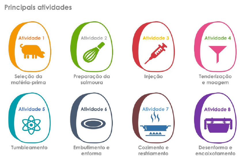 O presunto é um dos produtos nobres da indústria cárnea, amplamente produzido em nosso país e, segundo a instrução normativa nº 20, de 31 de Julho de 2000, entende-se por Presunto Cozido, seguido das especificações que couber, o produto cárneo industrializado obtido exclusivamente com o pernil de suínos, desossado, adicionado de ingredientes, e submetido a um processo de cozimento adequado (BRASIL, 2000). Seleção da matéria-prima As matérias primas ficam estocadas em cestos aramados (A) e/ou tanques de inox (B) com média de 500Kg cada, em câmaras de resfriamento com temperatura controlada. A composição é pernil suíno refilado, separado em partes: alcatra, coxão duro, coxão mole, patinho e tortuguita. Preparação da salmoura Nesta etapa, são pesados os aditivos e condimentos que serão utilizados na elaboração da salmoura em sala separada e específica para este fim. A salmoura é preparada em tanques de agitação contínua. A salmoura injetada à matéria-prima assegura a distribuição de cloreto de sódio, nitritos e outros possíveis ingredientes, como açúcares, temperos e polifosfatos (CASIRAGHI; ALAMPRESE; POMPEI, 2007), contribuindo para a suculência e o sabor característicos do produto. Injeção Os coxão duro, coxão mole, patinho e alcatra são dispostos na injetora para incorporação da salmoura. Tenderização e moagem Após injeção da salmoura, os músculos passam por tenderização, que tem como objetivo causar o rompimento das fibras musculares e destruição parcial do tecido conectivo aumentando a sua maciez. A tortuguita é moída em máquina de moagem (A). Esta representa baixo volume adicionado a formulação. Tumbleamento Em tanque, mistura-se o pernil injetado com a tortuguita moída, confere-se o peso da massada e, após, transfere-se para os tumblers (equipamentos de formato cilíndrico que possuem chicanas internas onde todo material permanece sob constante agitação). O objetivo é realizar massageamento para formar uma liga das carnes, extraindo as proteínas e melhorar a incorporação do líquido injetado (salmoura). Embutimento e enforma Após o tumbleamento, a massa estará pronta para ser embutida. O embutimento da massa é realizado diretamente em filme que permite a termoformagem e termocontração com eliminação de ar, criando assim uma barreira durante as fases de estocagem e comercialização. Após o embutimento, as peças de presuntos são acondicionadas individualmente em formas e submetidas ao cozimento. Cozimento e resfriamento As formas devem ser colocadas em gaiolas e submetidas ao cozimento em túnel com injeção de vapor superaquecido. O túnel deve promover um gradiente crescente de temperatura, sendo que no interior da peça tal temperatura deve ser suficiente para inativar microrganismos patógenos. Segundo Guerreiro (2006b), o cozimento/defumação equivale a um tratamento térmico brando, como a pasteurização. Dessa maneira o produto não é esterilizado e o efeito do calor além de desenvolver características organolépticas, prolonga a vida de prateleira do produto. Normalmente o cozimento/defumação é finalizado quando o produto atingir 71°C em seu centro geométrico. O decréscimo da temperatura é facilitado pela utilização de água gelada como meio de transferência de calor. Ainda nas formas, os presuntos devem permanecer em câmaras de resfriamento entre O e 5°C até o momento do fatiamento. Desenforma e encaixotamento As peças são acondicionadas em caixas de papelão por meio de encaixotadora automática (A) e após ocorre a montagem do pallet (B) destinado para a expedição. DEFEITOS DO PRESUNTO A produção de presunto pode apresentar algumas anomalias não desejáveis ao consumidor, como a liberação de liquido, formato irregular, embalagem entremeada, coloração indesejável e a formação de bolhas. A formação de bolhas está associada às etapas de tambleamento, descanso e embutimento do presunto, onde a presença de ar na massa dificulta a etapa de embutimento e proporciona o aparecimento das bolhas no produto final (XARGAYÓ et al., 2010). A extração de proteínas miofibrilares, que inicia na fase de tambleamento, se completa na fase de descanso (cura), onde se dá continuidade à extração das proteínas, através da relação muscular com a presença de fosfatos e sal, presentes na formulação. O tempo de cura influencia diretamente na intensificação do sabor, cor e textura do produto. (XARAGAYÓ, 2010). A combinação entre tambleamento e a etapa de descanso proporcionam excelentes resultados, pois o tempo de tambleamento permite que o efeito de cura ocorra mais rápido, por facilitar a penetração da salmoura na carne fazendo com que ocorra a extração e solubilização das proteínas miofibrilares, e a compactação da massa proporciona redução de espaços vazios, evitando o aparecimento de bolhas maiores no produto final (LAWRIE, 2005) Deste modo, é de suma importância efetuar corretamente a correlação das etapas tambleamento versus tempo de descanso, pois quando aplicados de maneira errada prejudicam a aparência do presunto cozido. Embalagem primária Após o fatiamento e porcionamento, o produto segue por esteira eé posicionado automaticamente sobre o filme da embalagem e, logo em seguida recebe o filme superior. Nesta etapa a embalagem primária é selada e o vácuo e aplicado. As embalagens primárias são compostas por filmes multicamadas, que impedem a passagem do ar e umidade pelas camadas. Embalagem secundária As embalagens de presunto são agrupadas e acondicionadas em caixas de papelão ondulado, que permanecem por 24 horas na câmara de estocagem, sobre um pallet, à temperatura de 10°C aguardando a revisão para serem liberados para a expedição. ROTULAGEM A Resolução da Diretoria Colegiada (RDC) nº 259 de 2002 (BRASIL, 2002) estabelece o Regulamento Técnico aplicável à rotulagem de todo alimento que seja comercializado, qua