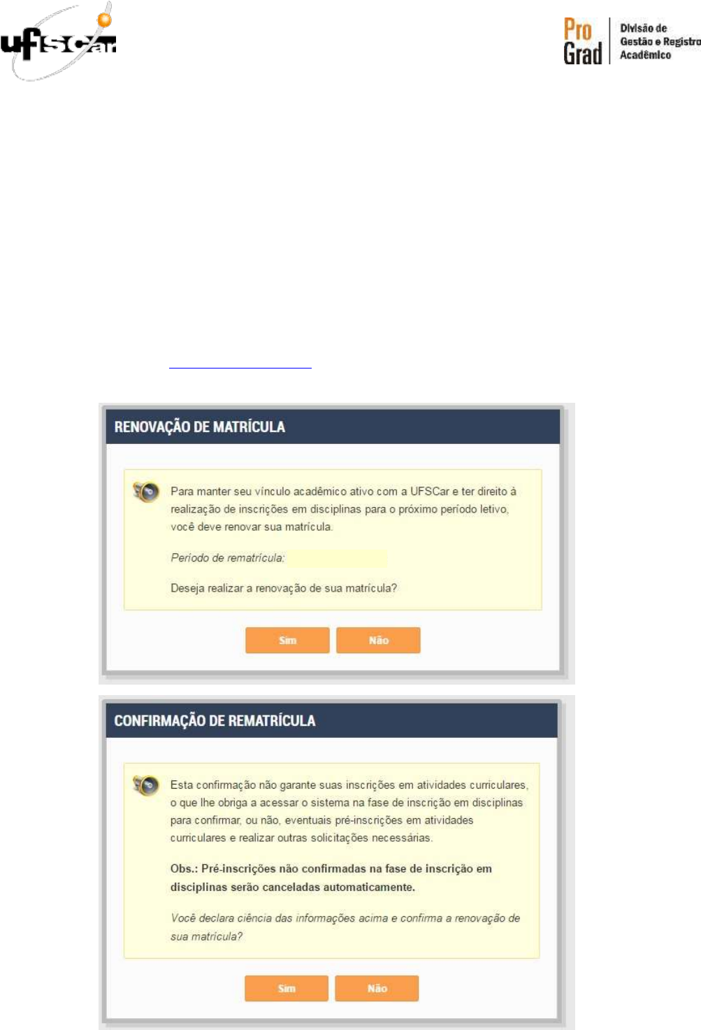 TUTORIAL - Renovação de Matrícula e Inscrições 2020 RENOVAÇÃO DE MATRÍCULA Quando? Estudantes dos cursos presenciais de duração semestral e dos cursos do Campus Lagoa do Sino (cursos anuais) no período de 11/01 a 28/02/2020. Estudantes do curso de Medicina (cursos anuais seriados) no período de 11 a 28/01/2020. Como fazer? 1. Faça o login em http://siga.ufscar.br e, nos pop up que aparecerem, confirme a renovação de matrícula. As mensagens que aparecerão são as seguintes: http://siga.ufscar.br/ TUTORIAL - Renovação de Matrícula e Inscrições 2020 ATENÇÃO Clicar em NÃO em qualquer uma dessas janelas implicará no CANCELAMENTO da matrícula. INSCRIÇÃO EM ATIVIDADES NO SIGA Quando? Estudantes dos cursos presenciais de duração semestral e dos cursos do Campus Lagoa do Sino (cursos anuais) nos dias 19 e 20/02/2020. Estudantes do curso de Medicina (cursos anuais seriados) nos dias 20 e 21/01/2020. Como fazer? 2. No SIGA, no menu esquerdo, clique em “ALUNO” e depois em “MATRÍCULA”. ATENÇÃO Todo estudante com matrícula ativa deve renovar sua matrícula para o período 2020/1, mesmo que esteja apenas de Recuperação ou conceito Incompleto em atividades de 2019. Estudantes com status “Formando” não fazem renovação de matrícula. TUTORIAL - Renovação de Matrícula e Inscrições 2020 3. Na tela que abrir, clique sobre o número de sua MATRÍCULA e depois em “INSCRIÇÕES E RESULTADOS”. 4. Na tela de Inscrições e Resultados, na aba PERÍODOS LETIVOS E REGULARES, clique no período letivo “Em Andamento” (no caso será 2020/1...). TUTORIAL - Renovação de Matrícula e Inscrições 2020 ATENÇÃO Para aqueles que não forem cursar atividades neste período e quiserem realizar o trancamento durante a fase de renovação de matrícula, não é necessário confirmar a pré-inscrição automática ou inscrever-se em disciplinas, ou seja, não é necessário realizar este passo em diante. (Consulte capítulo “Trancamento de Matrícula” abaixo) 5. Você verá nesta tela as atividades obrigatórias de perfil pré-inscritas. Para confirmar a pré-inscrição clique em “CONFIRMAR SOLICITAÇÕES PRÉ-DEFERIDAS” e para alterar suas inscrições, após a confirmação, clique em “ALTERAR SOLICITAÇÕES” no canto superior da tela. 6. Na presente fase você pode solicitar inscrição em quaisquer disciplinas (obrigatórias ou optativas) constantes de sua matriz curricular. As atividades que você já cursou com aprovação e estão sendo oferecidas neste semestre apresentarão o status “Aprovado” e não poderão ser solicitadas. As atividades que você teve pré-inscrição já estarão com o quadradinho marcado. Se quiser mudar a pré-inscrição ou selecionar outras disciplinas, basta clicar no quadradinho relacionado à atividade ou turma desejada. 7. As turmas indicadas em verde são aquelas indicadas para seu curso. TUTORIAL - Renovação de Matrícula e Inscrições 2020 8. Caso você solicite inscrição em disciplinas das quais não obteve aprovação ou não teve oportunidade de cursar no período correto, então irá concorrer às vagas de acordo com as seguintes prioridades: 9. Dúvidas quanto aos requisitos, co-requisitos, dispensas ou equivalências de cada disciplina ou atividade curricular podem ser vistas posicionando-se o cursor do mouse sobre o nome da referida atividade e uma janela se abrirá apresentando essas informações. As prioridades para ocupação das vagas oferecidas NA FASE DE INSCRIÇÃO em cada disciplina e/ou atividade curricular serão consideradas na ordem abaixo estabelecida, dando-se preferência em cada uma delas ao aluno com menor número de matrículas efetivas na disciplina e/ou atividade curricular em questão, usando como desempate o melhor IRA: I - Para os estudantes que tenham a atividade curricular como obrigatória do perfil no qual se encontram; II - Para os estudantes que se encontrem na condição de candidatos à formatura ou em processo de jubilamento e que tenham a atividade curricular como parte integrante do rol de atividades curriculares faltantes para a integralização da carga horária prevista no Projeto Pedagógico de Curso; III - Para os estudantes que tenham a atividade curricular como obrigatória na sua matriz curricular e que já a tenham cursado anteriormente sem obter aprovação, ou que não a tenham cursado no período correto (recuperação de obrigatória), e que a turma solicitada esteja oferecida no turno de funcionamento de seu curso; IV - Para os estudantes que tenham a atividade curricular como obrigatória na sua matriz curricular e que já a tenham cursado anteriormente sem obter aprovação, ou que não a tenham cursado no período correto (recuperação de obrigatória), e que a turma solicitada esteja oferecida fora do turno de funcionamento de seu curso; V - Os estudantes que tenham a atividade curricular como obrigatório no perfil da matriz curricular, no período, e que tenham remanejado a turma na qual foram pré-deferidos na fase de inscrição; VI - Os estudantes que tenham a atividade curricular como optativa em sua matriz curricular; VII - Os estudantes que tenham a atividade curricular como obrigatória na sua matriz curricular, mas em perfil posterior ao que se encontra. TUTORIAL - Renovação de Matrícula e Inscrições 2020 10. Para encerrar a solicitação de inscrições em atividades ou confirmar as atividades pré- inscritas, role até o final da tela e clique no botão “SALVAR SOLICITAÇÕES”. 11. Depois de clicar em Salvar, o sistema retornará uma mensagem no topo da tela dizendo que o registro foi feito com sucesso. 12. Se houver algum conflito, o sistema não concluirá a solicitação e apresentará o erro que impossibilitou a solicitação. 13. Neste caso, resolva o conflito, efetue eventuais alterações e clique novamente no botão “Salvar Solicitações”, conforme orientado no passo 9, para concluir sua solicitação. AJUS