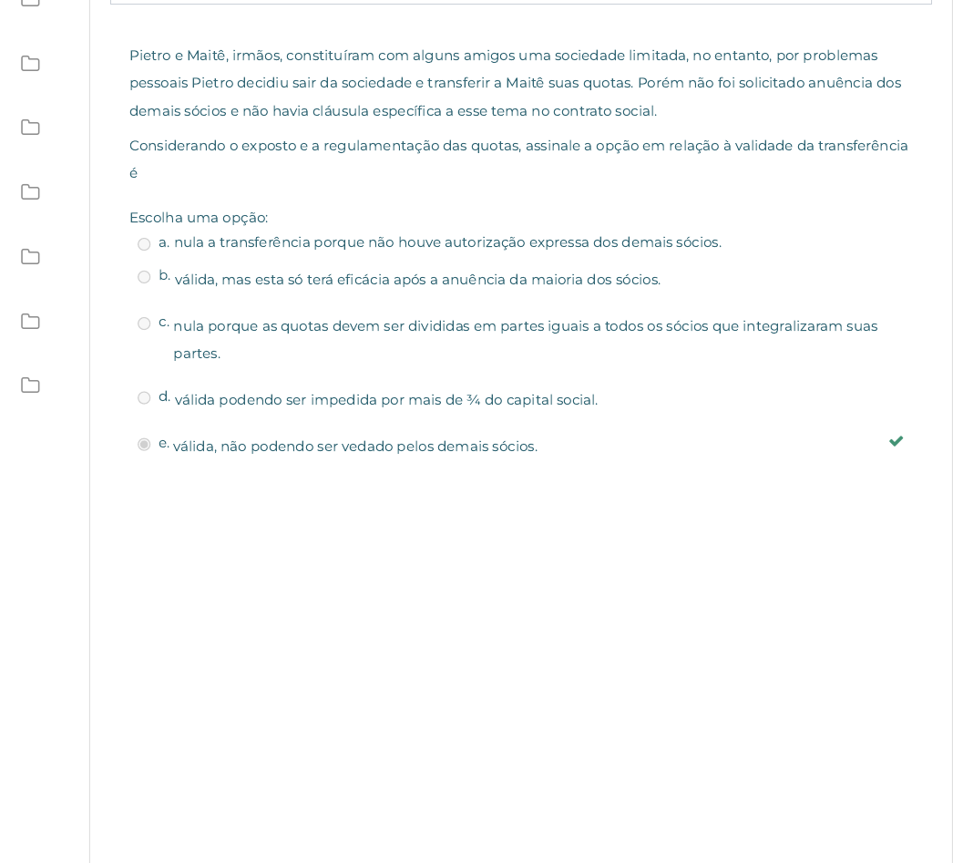 Pietro e Maitê, irmãos, constituíram com alguns amigos uma sociedade limitada, no entanto, por problemas pessoais Pietro decidiu sair da sociedade e transferir a Maitê suas quotas. Porém não foi solicitado anuência dos demais sócios e não havia cláusula especí�ca a esse tema no contrato social. Considerando o exposto e a regulamentação das quotas, assinale a opção em relação à validade da transferência é Escolha uma opção: a. nula a transferência porque não houve autorização expressa dos demais sócios. b. válida, mas esta só terá e�cácia após a anuência da maioria dos sócios. c. nula porque as quotas devem ser divididas em partes iguais a todos os sócios que integralizaram suas partes. d. válida podendo ser impedida por mais de ¾ do capital social. e. válida, não podendo ser vedado pelos demais sócios. https://avap.multivix.edu.br/my/ https://avap.multivix.edu.br/course/view.php?id=26237 https://avap.multivix.edu.br/course/view.php?id=26237§ion=4 https://avap.multivix.edu.br/mod/quiz/view.php?id=1633908 https://avap.multivix.edu.br/my/ https://avap.multivix.edu.br/course/view.php?id=26237 https://avap.multivix.edu.br/user/index.php?id=26237 https://avap.multivix.edu.br/course/view.php?id=26237§ion=1 https://avap.multivix.edu.br/course/view.php?id=26237§ion=2 https://avap.multivix.edu.br/course/view.php?id=26237§ion=3 https://avap.multivix.edu.br/course/view.php?id=26237§ion=4 https://avap.multivix.edu.br/course/view.php?id=26237§ion=5 https://avap.multivix.edu.br/course/view.php?id=26237§ion=6 https://avap.multivix.edu.br/course/view.php?id=26237§ion=7 https://avap.multivix.edu.br/course/view.php?id=26237§ion=8 https://avap.multivix.edu.br/course/view.php?id=26237§ion=9 https://avap.multivix.edu.br/ https://avap.multivix.edu.br/ https://avap.multivix.edu.br/ https://avap.multivix.edu.br/ Questão 3 Correto Atingiu 0,34 de 0,34 Jorge, Sandra e Jussara são irmãos e pretendem constituir sociedade para exploração de atividade comercial de produção e venda de equipamentos para informática, porém possuem capital em dinheiro com valores diferentes. Dispostos a seguirem com os planos de constituir uma empresa, mas desejando restringir a responsabilidade de cada um pelas obrigações contraídas pela empresa a tais aportes. Tendo em vista o regime jurídico imposto pela legislação vigente aos diferentes tipos de empresas, é viável, para atingirem seu objetivo, a constituição de sociedade Escolha uma opção: a. limitada, na qual a responsabilidade do sócio é restrita ao valor de suas quotas, embora todos respondam solidariamente pela integralização do capital social. b. em nome coletivo, que limita a responsabilidade de cada sócio ao serviço aportado e representativo de cada quota. c. cooperativa, que constitui tipo societário que determina a limitação de responsabilidade às quotas emitidas, não respondendo os cooperados pela integralização destas. d. em comandita simples, na qual os sócios, tanto comanditados quanto comanditários, respondem pelas obrigações sociais no limite de suas quotas. e. simples, único tipo que afasta a responsabilidade solidária dos sócios pelas obrigações contraídas pela empresa e pela integralização do capital. https://avap.multivix.edu.br/my/ https://avap.multivix.edu.br/course/view.php?id=26237 https://avap.multivix.edu.br/user/index.php?id=26237 https://avap.multivix.edu.br/course/view.php?id=26237§ion=1 https://avap.multivix.edu.br/course/view.php?id=26237§ion=2 https://avap.multivix.edu.br/course/view.php?id=26237§ion=3 https://avap.multivix.edu.br/course/view.php?id=26237§ion=4 https://avap.multivix.edu.br/course/view.php?id=26237§ion=5 https://avap.multivix.edu.br/course/view.php?id=26237§ion=6 https://avap.multivix.edu.br/course/view.php?id=26237§ion=7 https://avap.multivix.edu.br/course/view.php?id=26237§ion=8 https://avap.multivix.edu.br/course/view.php?id=26237§ion=9 https://avap.multivix.edu.br/ https://avap.multivix.edu.br/ https://avap.multivix.edu.br/ https://avap.multivix.edu.br/ Atingiu 0,00 de 0,34 Giulia, sócia administradora da empresa Jullios Embalagens Ltda., cujo capital encontra-se parcialmente integralizado, comunica aos sócios que deverá se afastar da administração da empresa por motivos de saúde mas que irá indicar sua cunhada Joana, admimistradora de empresas, para a administração. Um dos sócios consulta o advogado da sociedade para saber se a indicação de Giulia pode ser realizada e se poderá ser integrada ao quadro de funcionários como administradora já que sua cunhada integra o quadro social. O advogado responde que a indicação é Escolha uma opção: a. legal,devendo ser aprovado por pelo menos 50% dos sócios. b. legal, desde que seja inserida no contrato previamente a possibilidade de a administração ser exercida por não sócio. c. ilegal, porque não existe no contrato cláusula de regência supletiva pela Lei de Sociedades por Ações. d. ilegal, pois o capital social deveria estar integralizado para que a indicação seja aprovada por maioria de três quartos do capital. e. legal, desde que seja aprovada pela unanimidade dos sócios diante da não integralização do capital social. ◄ Conteúdo Online Seguir para... Conteúdo Online ► https://avap.multivix.edu.br/mod/scorm/view.php?id=1633907&forceview=1 https://avap.multivix.edu.br/mod/scorm/view.php?id=1633909&forceview=1 https://avap.multivix.edu.br/my/ https://avap.multivix.edu.br/course/view.php?id=26237 https://avap.multivix.edu.br/user/index.php?id=26237 https://avap.multivix.edu.br/course/view.php?id=26237§ion=1 https://avap.multivix.edu.br/course/view.php?id=26237§ion=2 https://avap.multivix.edu.br/course/view.php?id=26237§ion=3 https://avap.multivix.edu.br/course/view.php?id=26237§ion=4 https://avap.multivix.edu.br/course/view.php?id=26237§ion=5 https://avap.multivix.edu.br/course/view.php?id=26237§ion=6 https://avap.multivix.edu.br/course/view