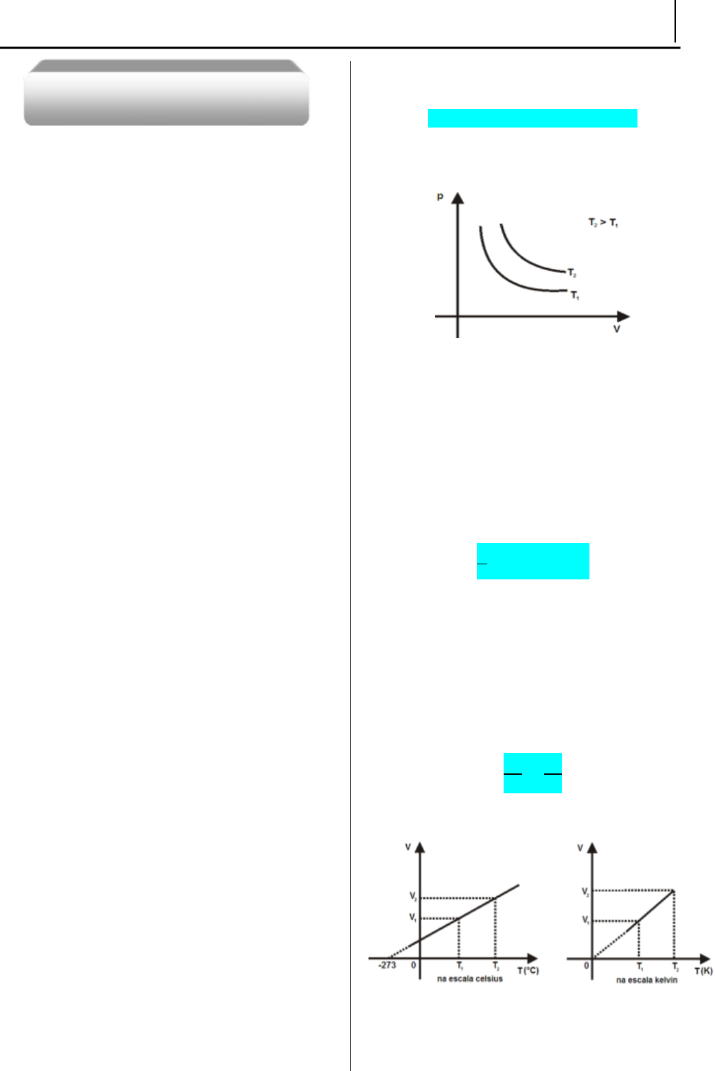FÍSICA - I CSFX – CURSINHO - 2021 167 As partículas de um sólido apresentam pequena vibração em torno de pontos fixos. Na fase líquida esse movimento é maior, permitindo que as moléculas deslizem umas sobre as outras; porém, o deslizamento não altera o volume do líquido, que toma a forma do recipiente que o contém. Na fase gasosa, a força de ligação entre as moléculas é quase nula, permitindo que elas se movimentem desordenadamente, ocupando por completo o volume que lhes é oferecido (expansibilidade). Outra característica física importante da fase gasosa é a compressibilidade (capacidade de sofrer variação de volume). Se você encher uma seringa com água ou outra substância qualquer na fase líquida e vedar a saída, aumentando-se a pressão no êmbolo da seringa, você não notará nenhuma contração de volume da substância qualquer na fase líquida. Já na fase gasosa, observa-se a compressão da substância. Finalmente, a última característica macroscópica da fase gasosa que podemos observar diz respeito à dependência de seu volume com relação à temperatura. Assim, como estudamos o comportamento térmico dos sólidos e dos líquidos, uma substância na fase gasosa também se dilata e mais do que as outras fases. Isso é facilmente verificável de você aproximar uma seringa contendo ar de uma fonte de calor deixando o êmbolo da mesma livre (o êmbolo se movimenta). Nas três situações citadas, é possível observar que as grandezas físicas volume, pressão e temperatura possuem uma relação muito forte entre si. Essas grandezas caracterizam a substância que está na fase gasosa e são chamadas variáveis de estado de uma substância. Alterando-se uma, pelo menos outra delas sofrerá também uma alteração, o que chamamos de transformação. Assim, a partir de agora, um dos nossos objetivos é analisar as relações entre essas grandezas e as transformações ocorridas. Esse conhecimento é necessário também para que possamos desenvolver nossos estudos a respeito da Termodinâmica, suas leis e princípios, bem como sua enorme aplicação no desenvolvimento tecnológico das máquinas térmicas que será estudado logo após esse assunto. LEIS DAS TRANSFORMAÇÕES DOS GASES Para a simplificação do estudo dos gases, adota-se um gás hipotético, o gás perfeito ou ideal, que segue rigorosamente as leis dos gases e mantém-se sempre no estado gasoso. Os gases reais apresentam um comportamento que se aproxima mais do gás perfeito quanto maior for sua temperatura e menor sua pressão. a) LEI DE BOYLE-MARIOTTE Esta lei rege as transformações isotérmicas de um gás, isto é, aquelas que se processam a temperatura constante. A lei de Boyle-Mariotte pode ser enunciada da seguinte forma: À temperatura constante a pressão de um gás é inversamente proporcional ao seu volume, ou seja: p1 . V1 = p2 . V2 = constante A representação gráfica da pressão em função do volume é uma hipérbole chamada isoterma. Com o aumento da temperatura, o produto p . V torna- se mais alto e as isotermas se afastam da origem dos eixos. b) LEI DE GAY-LUSSAC Esta lei rege as transformações isobáricas de um gás, isto é, aquelas que se processam sob pressão constante, e cujo enunciado é o seguinte: À pressão constante, o volume e a temperatura absoluta de um gás são diretamente proporcionais, ou seja: 𝑽𝑻 = 𝒄𝒐𝒏𝒔𝒕𝒂𝒏𝒕𝒆 Suponha uma determinada massa gasosa contida em um cilindro provida de um êmbolo móvel, sujeito a uma pressão constante p exercida pela atmosfera. Com o aquecimento do sistema, as moléculas do gás se agitam mais rapidamente aumentando o número de choques contra as paredes do recipiente deslocando o êmbolo móvel para cima até que haja um equilíbrio entre a pressão interna e a externa agindo sobre o êmbolo. Pela lei de Gay-Lussac: 𝑽𝟏𝑻𝟏 = 𝑽𝟐𝑻𝟐 A representação gráfica de uma transformação isobárica é uma reta. c) LEI DE CHARLES Esta lei diz respeito às transformações isocóricas ou isométricas, isto é, aquelas que se processam a volume constante, cujo enunciado é o seguinte: ESTUDO DOS GASES 168 FÍSICA - I CSFX – CURSINHO - 2021 Com volume constante, a pressão de uma determinada massa de gás é diretamente proporcional a sua temperatura absoluta, ou seja: 𝒑𝟏𝑻𝟏 = 𝒑𝟐𝑻𝟐 𝒄𝒐𝒏𝒔𝒕𝒂𝒏𝒕𝒆 Dessa maneira, aumentando a temperatura de um gás a volume constante, aumenta a pressão que ele exerce, e diminuindo a temperatura a pressão também diminui. Teoricamente, ao cessar a agitação térmica das moléculas a pressão é nula, e atinge o zero absoluto (- 273,15°C). A representação gráfica da transformação isométrica é uma reta. EQUAÇÃO GERAL DOS GASES PERFEITOS Quando as três variáveis de estado de uma determinada massa de gás – pressão, volume e temperatura – apresentarem variações, utiliza-se a equação geral dos gases que engloba todas as transformações vistas anteriormente. 𝒑𝟏𝑽𝟏𝑻𝟏 = 𝒑𝟐𝑽𝟐𝑻𝟐 Segundo esta expressão, temos: EXERCICIO 1- Na temperatura de 300 K e sob pressão de 1 atm, uma massa de gás perfeito ocupa o volume de 10 litros. Calcule a temperatura do gás quando, sob pressão de 2 atm, ocupa o volume de 20 litros. 2- Dentro de um recipiente de volume variável estão inicialmente 20 litros de gás perfeito à temperatura de 200 K e pressão de 2 atm. Qual será a nova pressão, se a temperatura aumentar para 250 K e o volume for reduzido para 10 litros? 3- Um balão de borracha continha 3 litros de gás hélio, à temperatura de 27o C, com pressão de 1,1 atm. Esse balão escapuliu e subiu. À medida que o balão foi subindo, a pressão atmosférica foi diminuindo e, por isso, seu volume foi aumentando. Quando o volume atingiu 4 litros, ele estourou. A temperatura do ar naquela altura era 7o C. Calcule a pressão do gás em seu interior imediatamente