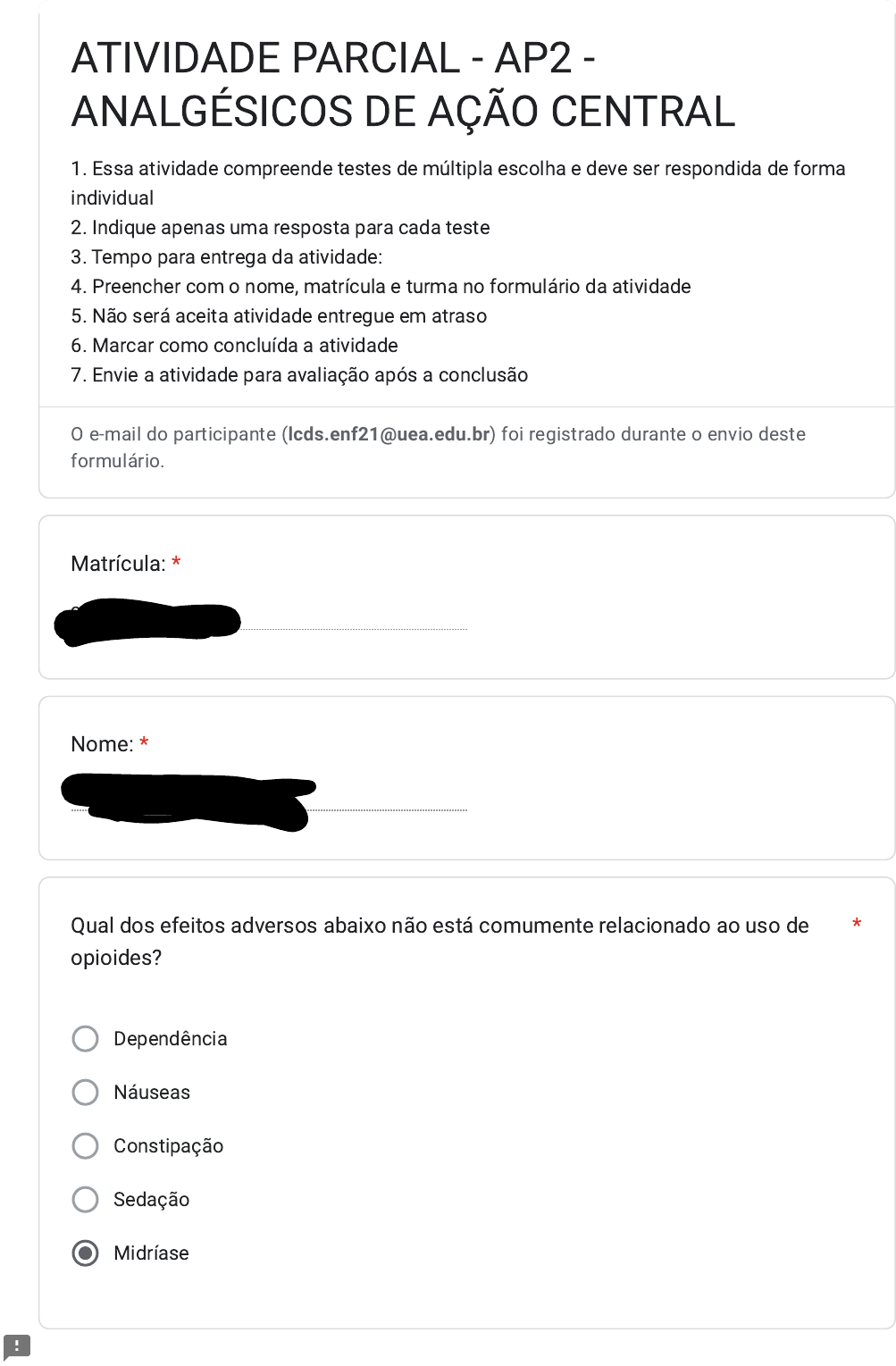 2122010079 Lenice Carvalho da Silva Dependência Náuseas Constipação Sedação Midríase ATIVIDADE PARCIAL - AP2 - ANALGÉSICOS DE AÇÃO CENTRAL 1. Essa atividade compreende testes de múltipla escolha e deve ser respondida de forma individual 2. Indique apenas uma resposta para cada teste 3. Tempo para entrega da atividade: 4. Preencher com o nome, matrícula e turma no formulário da atividade 5. Não será aceita atividade entregue em atraso 6. Marcar como concluída a atividade 7. Envie a atividade para avaliação após a conclusão O e-mail do participante (lcds.enf21@uea.edu.br) foi registrado durante o envio deste formulário. Matrícula: * Nome: * Qual dos efeitos adversos abaixo não está comumente relacionado ao uso de opioides? * Por não apresentar metabólitos ativos, não há risco de acúmulo em pacientes com insuficiência renal Pode atravessar a barreira hematoencefálica, mas em pequena fração, por ser o menos lipofílico dos opioides comuns A administração por via oral (VO) produz resposta confiável por não apresentar efeito de primeira passagem Não apresenta metabólitos ativos, como a fentanila Não apresenta outras vias de administração a não ser as vias oral (VO) e intramuscular (IM) metadona destaca-se por ter curta duração de ação. codeína tem ação analgésica superior à da morfina. morfina é o único alcaloide extraído do ópio. heroína não provoca analgesia. naloxona é um fármaco com atividade como antagonista de receptores opioides. Sobre a farmacocinética da morfina, assinale o que for correto: * Os opioides são amplamente empregados como fármacos analgésicos, mas a respectiva utilização pode levar à tolerância e à dependência. A esse respeito, é correto afirmar que a * O receptor opioide K tem ação midriatica quando saturado AINES, pela ação de bloqueio a síntese de prostaglandinas, são amplamente usados em unidades de terapia intensiva, visto sua estabilidade sob o aspecto hemodinâmico e o fato de não causar alteração direta na função renal de doentes críticos Os receptores Mu-2 são os únicos responsáveis pelo efeito analgésico opióide O metabólito da morfina tem maior ação analgésica que o próprio fármaco inalterado A codeína é um analgésico opióide de uso oral. Produz acentuada euforia e dependência e geralmente é associada ao paracetamol como medicamento de venda livre para tratar cefaléias, lombalgias e dor de dente. O tramadol não é mais utilizado como analgésico para dor pós-operatória. A morfina é um analgésico opióide somente de uso oral cujos efeitos são: analgesia, euforia e sedação, depressão respiratória e diarréia. A fentanila pode ser usada em sistemas de infusão intravenosa controlados pelo paciente ou na forma de adesivos transdérmicos na dor crônica intensa. É sabido que a analgesia pode se dar, objetivamente, pelo bloqueio da síntese de prostaglandinas, interrupção da transmissão da sensibilidade pelo nervo periférico ou alteração do processamento sensorial em nível central. Atento a isso, avalie: * A dor é um dos maiores desafios da clínica médica. É definida como uma sensação desagradável, que pode ser aguda ou crônica, e é conseqüência de complexos processos neuroquímicos nos sistemas nervoso periférico e central. Com relação aos analgésicos opióides, é correto afirmar que: * A biodisponibilidade oral de codeína é considerada boa. Tramadol é primeira escolha para tratamento em longo prazo de dor crônica não oncológica. O acúmulo do metabólito de meperidina pode induzir confusão mental e convulsão. Morfina é o opioide de eleição para analgesia intensa em dor oncológica. A infusão de opioides e agentes anestésicos locais através de um cateter epidural resulta em alívio da dor com mais efeitos colaterais, inclusive sedação, em comparação com a analgesia sistêmica. A via parenteral do medicamento analgésico produz efeitos mais rápidos que a administração oral e esses efeitos apresentam duração mais prolongada. A via subcutânea é uma maneira efetiva e conveniente para tratar a dor. Além disso, a dose de opioide que pode ser administrada por vez no tecido subcutâneo é ilimitada. A infusão de opioides ou de agentes anestésicos locais no espaço epidural tem sido empregada para o controle efetivo da dor em pacientes pós-operatórios e naqueles com dor crônica não aliviada por outros métodos. O início da ação dos opioides administrados via retal é preciso, mas a ação mostra- se rápida quando comparada com outras vias de administração. Em relação aos analgésicos opioides, assinale a alternativa INCORRETA. * A via selecionada para a administração de um agente analgésico depende da condição de cada paciente e do efeito desejado do medicamento. Com relação a via para administração do analgésico, considera-se que: * A morfina produz uma forte sensação de contentamento e bem-estar O fentanil é altamente lipofóbico, por isso apresenta rápido início de ação Um dos efeitos adversos comumente observados é a constipação A morfina é um analgésico mais potente que a codeína Dentre os opioides mais potentes, tem-se a Morfina e Fentanil A ação analgésica da codeína é derivada da sua conversão à morfina pelo sistema enzimático CYP2D6 A codeína pode ser usada comumente com paracetamol para combate à dor. Os fármacos agonistas-antagonistas opioides apresentam efeitos essencialmente potencializantes frente a pacientes dependentes de opioides A depressão respiratória é a causa mais comum de morte nos casos de superdose aguda de opioides A buprenorfina é classificada como agonista opioide parcial Sobre os analgésicos opioides, assinale a alternativa incorreta: * Sobre as ações dos analgésicos de ação central, assinale a única alternativa incorreta: * Os fármacos opioides apresentam basicamente a mesma afinidade pelos respectivos receptores Inexistem fárm