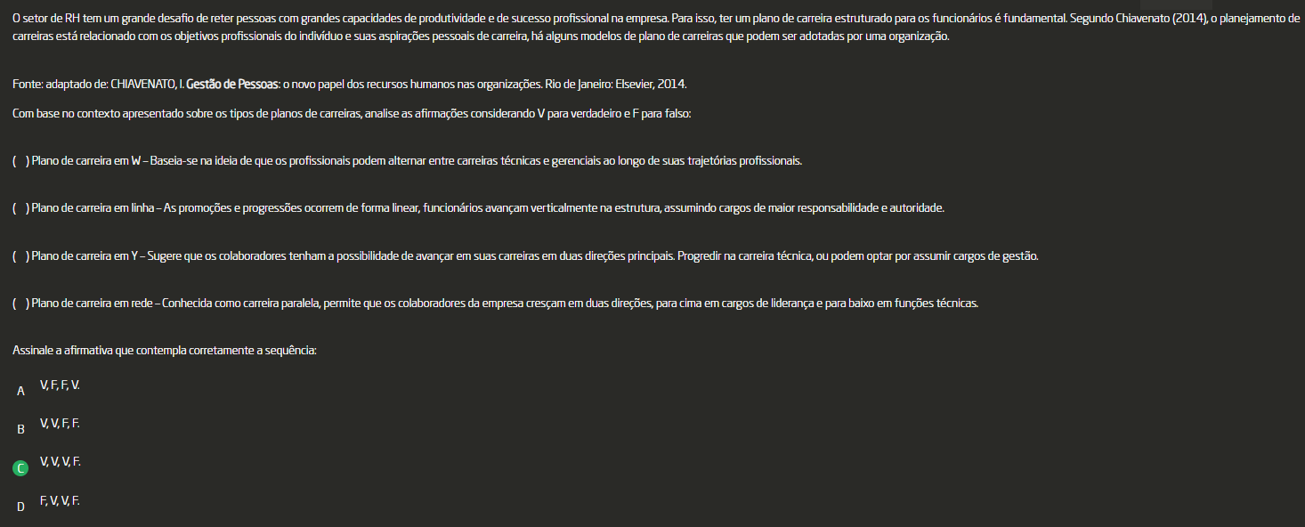 O setor de RH tem um grande desafio de reter pessoas com grandes capacidades de produtividade e de sucesso profissional na empresa. Para isso, ter um plano de carreira estruturado para funcionários é fundamental. Segundo Chiavenato (2014), planejamento de carreiras está relacionado com os objetivos profissionais do indivíduo e suas aspirações pessoais de carreira, há alguns modelos de plano de carreiras que podem ser adotadas por uma organização. Com base no contexto apresentado sobre os tipos de planos de carreiras, analise as afirmacoes considerando V para verdadeiro e F para falso: ( ) Plano de carreira em W Baseia-se na ideia de que profissionais podem alternar entre carreiras técnicas e gerenciais ao longo de suas trajetórias profissionais. ( ) Plano de carreira em linha - As promoções e progressões ocorrem de forma linear, funcionários avançam verticalmente na estrutura, assumindo cargos de maior responsabilidade e autoridade. ( ) Plano de carreira em Y Sugere que colaboradores tenham a possibilidade de avançar em suas carreiras em duas direções: Progredir na carreira técnica, ou podem optar por assumir cargos de gestão. ( ) Plano de carreira em rede - Conhecida como carreira paralela, permite que colaboradores da empresa cresçam em duas direções, para cima em cargos de liderança e para baixo em funções. A C D