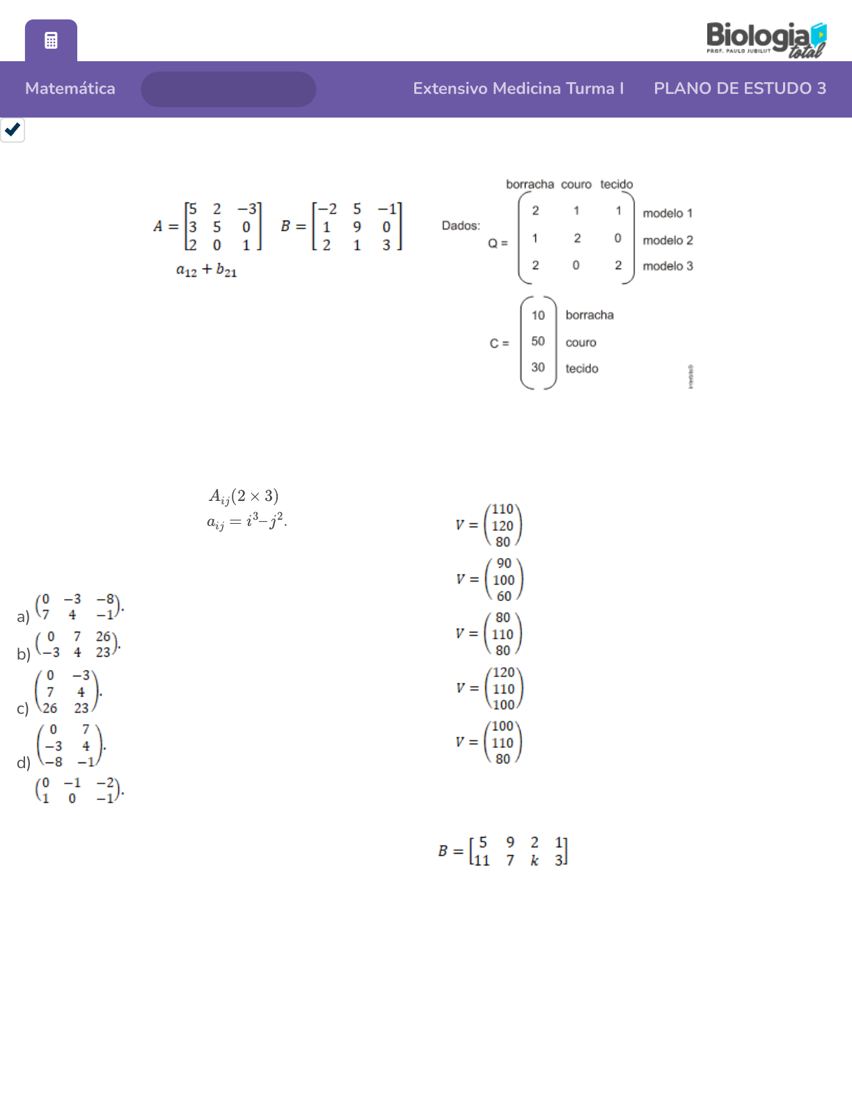 / Matemática Lista de Exercícios Extensivo Medicina Turma I PLANO DE ESTUDO 3 Ex.6 Matrizes Dadas as matrizes e , o resultado da soma: é: Ex.3 Matrizes (G1 - ifal 2016) A matriz tem elementos de�nidos pela expressão Portanto, a matriz A é: Ex.12 Matrizes (Uel 2011) Uma indústria utiliza borracha, couro e tecido para fazer três modelos de sapatos. A matriz Q fornece a quantidade de cada componente na fabricação dos modelos de sapatos, enquanto a matriz C fornece o custo unitário, em reais, destes componentes. A matriz V que fornece o custo �nal, em reais, dos três modelos de sapatos é dada por: Ex.17 Matrizes Seja A uma matriz quadrada de ordem 2 e . Considerando C a matriz tal que C=A.B, é correto a�rmar que: I. A matriz C é uma matriz quadrada de ordem 2 II. A matriz C possui 2 linhas e 4 colunas III. Não é possível calcular a matriz C, pois o número de linhas de A é diferente do número de colunas de B. Imprimir mais exercícios por página a) 4 b) -4 c) 2 d) -2 e) 3 (2 × 3)Aij = – .aij i3 j2 a) b) c) d) e) a) b) c) d) e) / Estão corretas as a�rmativas: Ex.25 Matrizes (Esc. Naval 2013) Sejam e e B' a transposta de B. O produto da matriz A pela matriz B' é Ex.9 Matrizes (Eear 2016) Se e são matrizes opostas, os valores de a, b, x e k são respectivamente Ex.13 Matrizes (Uern 2012) Sejam as matrizes O menor elemento da matriz P é Ex.5 Matrizes (Unicamp 2016) Em uma matriz, chamam-se elementos internos aqueles que não pertencem à primeira nem à última linha ou coluna. O número de elementos internos em uma matriz com 5 linhas e 6 colunas é igual a Ex.7 Matrizes Considere a matriz de ordem 4x4, em que aij = 0 se i ≠ j e aij = 1 se i = j. É correto a�rmar que: Ex.24 Matrizes (Unicamp 2015) Considere a matriz onde a e b são números reais. Se e A é invertível, então Ex.21 Matrizes (Ufc 2009) O valor quando e é igual a: a) I apenas. b) II apenas. c) I e III apenas. d) II e III apenas. a) b) c) d) e) a) 1, -1, 1, 1 b) 1, 1, -1, -1 c) 1, -1, 1, -1 d) -1, -1, -2, -2 a) – 7. b) – 1. c) – 5. d) 2. a) 12. b) 15. c) 16. d) 20. A = [ ]aij 01) A matriz A é uma matriz quadrada 02) A matriz A é uma matriz identidade 04) O elemento 08) O elemento 16) O elemento a) a=1 e b=1. b) a=1 e b=0. c) a=0 e b=0. d) a=0 e b=1. / Ex.15 Matrizes (Uel 2015) Uma reserva �orestal foi dividida em quadrantes de 1 m² de área cada um. Com o objetivo de saber quantas samambaias havia na reserva, o número delas foi contado por quadrante da seguinte forma: O elemento da matriz A corresponde ao elemento da matriz B, por exemplo, 8 quadrantes contêm 0 (zero) samambaia, 12 quadrantes contêm 1 samambaia. Assinale a alternativa que apresenta, corretamente, a operação efetuada entre as matrizes A e B, que resulta no número total de samambaias existentes na reserva �orestal. Ex.22 Matrizes (Unicamp 2017) Sendo a um número real, considere a matriz Então, é igual a Ex.2 Matrizes (Ueg 2019) A matriz triangular de ordem 3, na qual para e para é representada pela matriz Ex.19 Matrizes (Fgvrj 2012) Seja X a matriz que satisfaz a equação matricial X.A = B, em que: e Ao multiplicar os elementos da matriz X , obteremos o número: a) b) c) d) e) a) b) c) d) e) A2017 a) b) c) d) = 0aij i > j = 4i − 5j + 2aij i ≤ j a) b) c) d) e) a) - 1 b) - 2 c) 1 d) 2 e) 0 / Ex.14 Matrizes (Uern 2015) Considere a seguinte operação entre matrizes: . A soma de todos os elementos da matriz K é: Ex.16 Matrizes (Fgv 2013) Sabendo que a inversa de uma matriz A é e que a matriz X é solução da equação matricial X⋅ A=B, em que podemos a�rmar que a soma dos elementos da matriz X é Ex.23 Matrizes (Pucrs 2015) Dada a matriz e a função f, de�nida no conjunto das matrizes 2×2 por então f(A) é Ex.20 Matrizes (Fgv 2016) Dada a matriz e sabendo que a matriz é a matriz inversa da matriz A, podemos concluir que a matriz X, que satisfaz a equação matricial A.X=B, tem como soma de seus elementos o número Ex.1 Matrizes (G1 - epcar (Cpcar) 2020) Um jogo consiste na disputa de dois adversários que, em um tabuleiro quadrado, dividido em outros quadrados menores e congruentes, conforme �gura abaixo, devem conseguir alinhar VERTICALMENTE, HORIZONTALMENTE ou em DIAGONAL, quatro algarismos iguais. Cada jogador, após escolher o algarismo com o qual irá preencher os quadrados menores, escreve um número por vez, em qualquer quadrado menor do tabuleiro, e passa a vez para o adversário. Vence o primeiro que alinhar os quatro algarismos iguais. No quadrado abaixo, estão registradas, numa partida desse jogo, as jogadas de Lucas, que escolheu o algarismo 5 e as jogadas de Mateus, que escolheu o algarismo 7. a) 1. b) 3. c) 4. d) 7. a) 7 b) 8 c) 9 d) 10 e) 11 a) b) c) d) e) a) 14 b) 13 c) 15 d) 12 e) 16 / Analise cada proposição abaixo quanto a ser (V) Verdadeira ou (F) Falsa. ( ) Se o próximo jogador for Lucas, ele não terá chance de ganhar o jogo, nessa jogada. ( ) Se o próximo jogador for Mateus, então, para garantir a vitória nessa jogada, ele poderá escrever o algarismo 7 em duas posições. ( ) Se Mateus for o próximo a jogar e NÃO escrever o algarismo 7 em um quadrado que dê a vitória a ele, então, Lucas poderá ganhar a partida na jogada seguinte à de Mateus. Sobre as proposições, tem-se que Ex.18 Matrizes (Mackenzie 2015) Se e os inteiros x e y são tais que então: Ex.4 Matrizes (G1 - ifsul 2017) A temperatura da cidade de Porto Alegre – RS foi medida, em graus Celsius, três vezes ao dia, durante 6 dias. Cada elemento da matriz corresponde à temperatura observada no tempo do dia Com base nos dados da matriz A, analise as seguintes proposições: I. A temperatura mínima registrada está na posição II. A maior variação de temperatura registrada entre os tempos 1 e 2 aconteceu no primeiro dia. III. A temperatura máxima registrada está na posição Estão corretas as a�rmativas Ex.11 Matrizes (G1 - ifsc 2011) Sobre as propriedades da matriz transposta, 