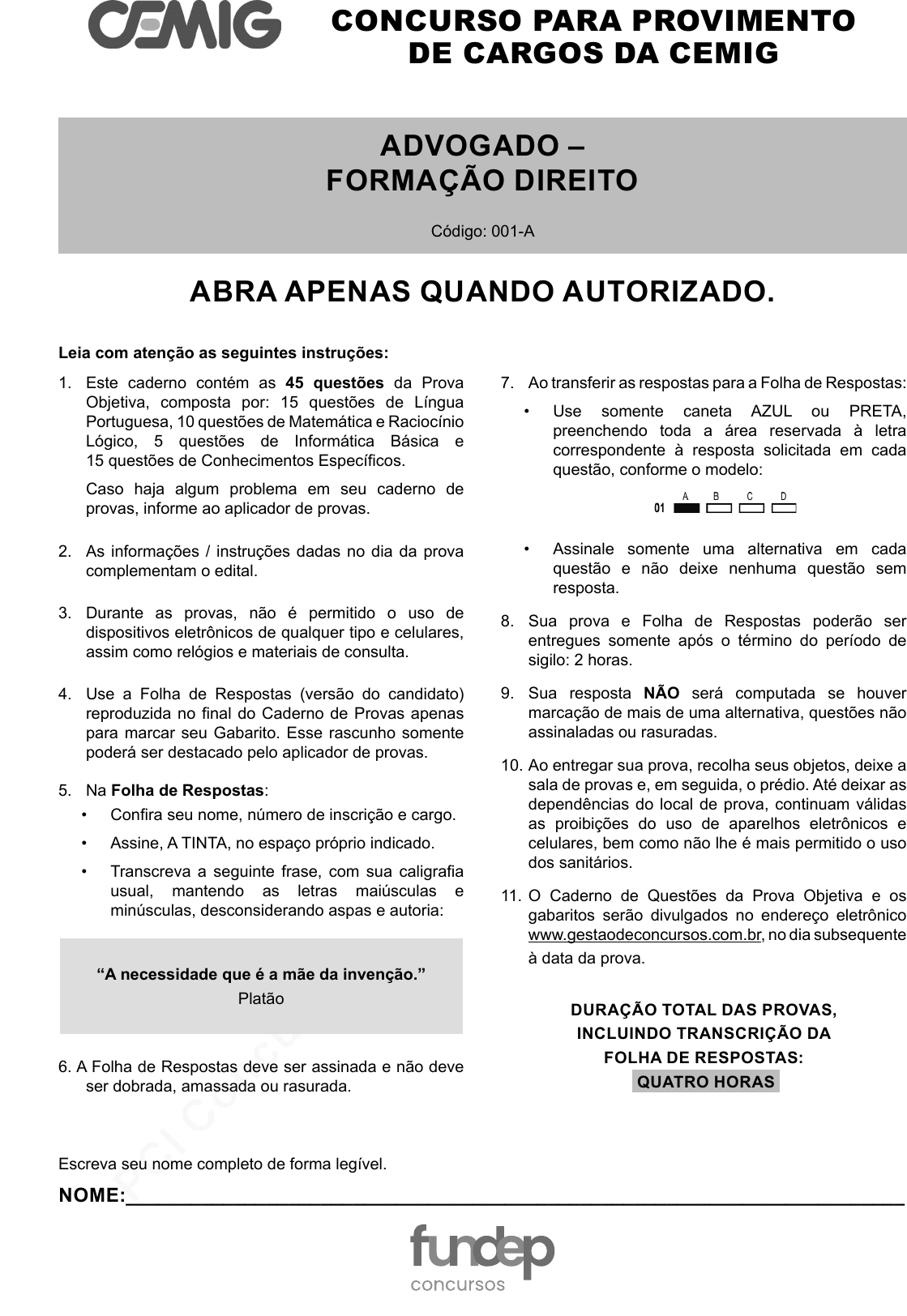pcimarkpci MDAwMDowMDAwOjAwMDA6MDAwMDowMDAwOmZmZmY6Yzk0YjowMmFl:V2VkLCAyNiBKdW4gMjAyNCAxODo1NDoxMSAtMDMwMA== www.pciconcursos.com.br CONCURSO PARA PROVIMENTO DE CARGOS DA CEMIG ADVOGADO – FORMAÇÃO DIREITO Código: 001-A ABRA APENAS QUANDO AUTORIZADO. Leia com atenção as seguintes instruções: 1. Este caderno contém as 45 questões da Prova Objetiva, composta por: 15 questões de Língua Portuguesa, 10 questões de Matemática e Raciocínio Lógico, 5 questões de Informática Básica e 15 questões de Conhecimentos Específicos. Caso haja algum problema em seu caderno de provas, informe ao aplicador de provas. 2. As informações / instruções dadas no dia da prova complementam o edital. 3. Durante as provas, não é permitido o uso de dispositivos eletrônicos de qualquer tipo e celulares, assim como relógios e materiais de consulta. 4. Use a Folha de Respostas (versão do candidato) reproduzida no final do Caderno de Provas apenas para marcar seu Gabarito. Esse rascunho somente poderá ser destacado pelo aplicador de provas. 5. Na Folha de Respostas: • Confira seu nome, número de inscrição e cargo. • Assine, A TINTA, no espaço próprio indicado. • Transcreva a seguinte frase, com sua caligrafia usual, mantendo as letras maiúsculas e minúsculas, desconsiderando aspas e autoria: “A necessidade que é a mãe da invenção.” Platão 6. A Folha de Respostas deve ser assinada e não deve ser dobrada, amassada ou rasurada. 7. Ao transferir as respostas para a Folha de Respostas: • Use somente caneta AZUL ou PRETA, preenchendo toda a área reservada à letra correspondente à resposta solicitada em cada questão, conforme o modelo: • Assinale somente uma alternativa em cada questão e não deixe nenhuma questão sem resposta. 8. Sua prova e Folha de Respostas poderão ser entregues somente após o término do período de sigilo: 2 horas. 9. Sua resposta NÃO será computada se houver marcação de mais de uma alternativa, questões não assinaladas ou rasuradas. 10. Ao entregar sua prova, recolha seus objetos, deixe a sala de provas e, em seguida, o prédio. Até deixar as dependências do local de prova, continuam válidas as proibições do uso de aparelhos eletrônicos e celulares, bem como não lhe é mais permitido o uso dos sanitários. 11. O Caderno de Questões da Prova Objetiva e os gabaritos serão divulgados no endereço eletrônico www.gestaodeconcursos.com.br, no dia subsequente à data da prova. DURAÇÃO TOTAL DAS PROVAS, INCLUINDO TRANSCRIÇÃO DA FOLHA DE RESPOSTAS: QUATRO HORAS Escreva seu nome completo de forma legível. NOME:________________________________________________________________________ pcimarkpci MDAwMDowMDAwOjAwMDA6MDAwMDowMDAwOmZmZmY6Yzk0YjowMmFl:V2VkLCAyNiBKdW4gMjAyNCAxODo1NDoxMSAtMDMwMA== www.pciconcursos.com.br 2 LÍNGUA PORTUGUESA INSTRUÇÃO: Leia o texto I para responder às questões de 1 a 7. TEXTO I Varrer as redes sociais para debaixo do tapete não é solução O Brasil caminha para fechar o ano com mais de 171 milhões de usuários de redes sociais, de acordo com o portal de estatísticas Statisa. Desse contingente, fazem parte crianças e jovens que, mesmo sem idade para oficialmente criarem contas e perfis nas plataformas, têm algum tipo de contato com o conteúdo que transita por elas. Diante desse fato, há dois caminhos possíveis: proibir ou educar. A proibição, embora tentadora, significa ignorar que pré-adolescentes e adolescentes já estão expostos ao que as redes sociais têm de melhor e de pior, sem que necessariamente estejam preparados para fazer essa distinção. Educar é trabalhoso, mas talvez seja a solução mais efetiva diante daquilo que parece um caminho sem volta: a influência de novas tecnologias digitais na maneira como nos comunicamos, interagimos com o mundo e vivemos. A Secretaria de Educação do Estado de São Paulo decidiu bloquear o uso de redes sociais e streamings (como Netflix e Globoplay) nas escolas estaduais, argumentando que a restrição visa “garantir um ambiente adequado para o aprendizado e evitar usos considerados inapropriados e / ou excessivo de redes, que podem prejudicar a qualidade da conexão e interferir no andamento das atividades pedagógicas”. Enxergar tais plataformas apenas como obstáculo é, de certa forma, se eximir da responsabilidade de guiar seu uso consciente e crítico. É privar os estudantes do acesso a conteúdos que podem enriquecer as aulas e torná-las mais conectadas com a realidade em que vivem. É dificultar o exercício da autoexpressão, já que jovens poderiam usar as redes de maneira positiva para mobilizar e engajar a comunidade escolar na resolução de problemas de sua região. Isso não significa uma defesa incondicional das redes. Pelo contrário: só poderemos participar da construção de um ecossistema digital melhor se pudermos conhecê-lo, entendendo a engrenagem por trás das plataformas, seu modelo de negócios, o modus operandi dos algoritmos, o papel dos influenciadores e tantos outros fenômenos que, feliz ou infelizmente, já fazem parte de nossas vidas. [...] Hoje, currículos são construídos levando em consideração a relevância da internet em nossas vidas e a necessidade de “desvendá-la”, de modo a minimizar os riscos e ampliar as oportunidades de quem está conectado. [...] Educar para as redes proporcionará aos estudantes um olhar mais crítico para consumir as informações que por elas transitam e responsabilidade para produzir e compartilhar conteúdos, entendendo o alcance que sua voz pode ter. A construção de tais competências é também pilar para que as crianças e jovens de hoje se tornem adultos mais conscientes do poder da comunicação, aptos a compreender que as redes sociais podem ser usadas para propagar fake news e discurso de ódio, mas também para o exercício da cidadania e a diversidade de vozes numa sociedade cada vez mais conectada. Num país de tamanha desigualdade como o Brasil,