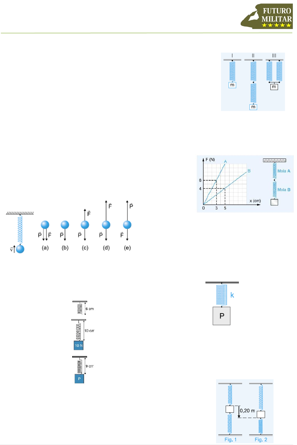 Prof. André Motta - mottabip@hotmail.com 1 | P r o j e t o F u t u r o M i l i t a r – w w w . f u t u r o m i l i t a r . c o m . b r Exercícios – Força de Atrico – Força Elástica 1-Evaristo avalia o peso de dois objetos utilizando um di- namômetro cuja mola tem constante elástica K = 35 N/m. Inicialmente, ele pendura um objeto A no dinamômetro e a deformação apresentada pela mola é 10 cm. Em seguida, retira A e pendura B no mesmo aparelho, observando uma distensão de 20 cm. Após essas medidas, Evaristo conclui, corretamente, que os pesos de A e B valem, respectivamente, em newtons: a) 3,5 e 7,0 b) 3,5 e 700 c) 35 e 70 d) 350 e 700 2-Uma bolinha pendurada na extremidade de uma mola vertical executa um movimento oscilatório. Na situação da figura, a mola encontra-se comprimida e a bolinha está subindo com velocidade V. Indicando por F a força da mola e por P a força peso, aplicadas na bolinha, o único esquema que pode representar tais forças na situação descrita é: 3-As figuras mostram uma mola elástica de massa desprezível em 3 situações distintas: a 1ª sem peso, a 2ª com um peso de 10 N e a 3ª com um peso P. O valor de P é: a) 0,75 N b) 1,0 N c) 3,0 N d) 7,5 N e) 9,0 N 4-Dispõe-se de duas molas idênticas e de um objeto de massa m. O objeto pode ser pendurado em apenas uma das molas ou numa associação entre elas, conforme a figura. O objeto provocará uma deformação total: a) igual nos três arranjos. b) maior no arranjo I. c) maior no arranjo II. d) maior no arranjo III. 5-A intensidade da força elástica (F), em função das deformações (x) das molas A e B, é dada pelo gráfico a seguir. Quando um corpo de peso 8 N é mantido em repouso, suspenso por essas molas, como ilustra a figura anexa, a soma das deformações das molas A e B é: a) 4 cm. b) 8 cm. c) 10 cm. d) 12 cm e) 14 cm. 6-Um bloco de peso P está ligado a uma mola ideal de constante elástica K e inicialmente sem deformação, como indica a figura. Quando se solta o bloco, este cai verticalmente esticando a mola. Desprezando-se o efeito do ar, a deformação da mola quando o bloco atinge sua velocidade máxima vale: a) 2 P/K. b) P/K. c) P/2K. d) P/3K. e) P/4K. 7-Duas molas verticais idênticas, com constante elástica de 100 N/m, são ligadas (sem deformação) a um pequeno bloco, como ilustra a figura 1. Soltando-o lentamente, nota-se que as molas equilibram o bloco após este deslocar 0,20 m (veja a figura 2). Desprezando-se os pesos das molas, conclui-se que o bloco pesa: a) 80 N b) 40 N c) 30 N d) 20 N e) 10 N Prof. André Motta - mottabip@hotmail.com 2 | P r o j e t o F u t u r o M i l i t a r – w w w . f u t u r o m i l i t a r . c o m . b r 8-No sistema em equilíbrio mostrado, as molas ideais têm, cada uma, constante elástica igual a 2.000 N/m e comprimento natural 10,0 cm. Se cada um dos corpos A e B tem massa igual a 5,0 kg, então a soma LA + LB vale: Dado: g = 10 m/s 2 a) 20,0 cm b) 22,5 cm c) 25,0 cm d) 27,5 cm e) 30,0 cm 9-Para a verificação experimental das leis da dinâmica, foi montado o esquema a seguir. Nele, o atrito é desprezado, o fio, a mola e as polias são ideais. Os corpos A e B encontram-se em equilíbrio quando a mola M, de constante elástica K = 200 N/m, está distendida de 5,0 cm. Qual a massa do corpo A? a) 1,0 kg b) 2,0 kg c) 3,0 kg d) 4,0 kg e) 5,0 kg 10-O bloco da figura, de massa m = 4,0 kg, desloca-se sob a ação de uma força horizontal constante de módulo F. A mola ideal, ligada ao bloco, tem comprimento natural 14 cm e constante elástica K = 160 N/m. Sabendo-se que as velocidades escalares do móvel em A e B são, respectivamente, iguais a 4,0 m/s e 6,0 m/s, qual é o comprimento da mola durante o movimento? a) 12,5 cm b) 14,5 cm c) 16,5 cm d) 18,5 cm e) 20,5 cm 11-Os corpos A e B representados na figura possuem, respectivamente, massas mA = 2,0 kg e mB = 4,0 kg. A mola é ideal e tem constante elástica K = 50 N/m. Despreze os atritos. Aplicando-se ao conjunto a força constante e horizontal, verifica-se que a mola experimenta deformação de 20 cm. Calcule as intensidades: a) da aceleração do conjunto; b) da força F. 12-Um corpo C de massa igual a 3,0 kg está em equilíbrio estático sobre um plano inclinado, suspenso por um fio de massa desprezível, preso a uma mola fixa ao solo, como mostra a figura. O comprimento natural da mola (sem carga) é L0 = 1,2 m e, ao sustentar estaticamente o corpo, ela se distende, atingindo o comprimento L = 1,5 m. Os possíveis atritos podem ser desprezados. A constante elástica da mola, em N/m, vale então: a) 10 b) 30 c) 50 d) 90 e) 100 13-O conjunto dos blocos representados na figura está sujeito a uma força vertical para baixo, constante, de 200 N. A constante elástica da mola (de massa desprezível) que une os blocos vale 1.000 N/m e o movimento do sistema se dá na mesma linha vertical. Adote g = 10 m/s 2 . Qual é, em cm, a deformação da mola? 14-O conjunto mostrado está em movimento devido à ação da força horizontal de 50 N. Despreze os atritos. O coeficiente de elasticidade da mola ideal que está entre os blocos A e B, de massas respectivamente iguais a 6 kg e 4 kg, é 1.000 N/m. A deformação sofrida pela mola é: a) 2 cm b) 4 cm c) 5 cm d) 7 cm e) 10 cm 15-Duas massas, m e M, estão unidas uma à outra por meio de uma mola de constante elástica k. Dependurando- as de modo que M fique no extremo inferior, o comprimento da mola é L1. Invertendo-se as posições das massas, o comprimento da mola passa a ser L2. Mostre que Prof. André Motta - mottabip@hotmail.com 3 | P r o j e t o F u t u r o M i l i t a r – w w w . f u t u r o m i l i t a r . c o m . b r o comprimento L0 da mola, quando não submetida a forças é dado por: 16-Um bloco de massa m = 1 kg é puxado para cima, ao longo de um plano inclinado, sob efeito de uma força F paralela ao plano e de módulo constante e igual a 8 N (ver figura). O movimento de subida é realizado com velocidade constante. Qu