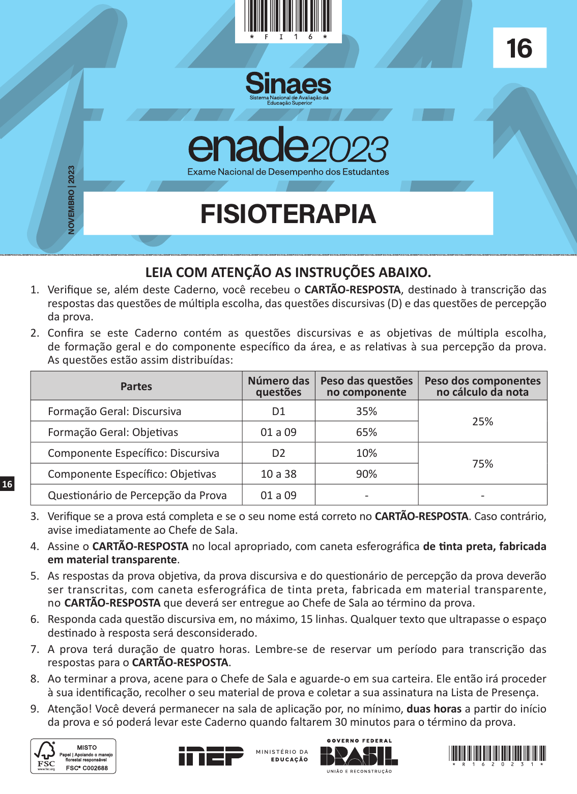 M I N I S T É R I O D A E D U C A Ç Ã O LEIA COM ATENÇÃO AS INSTRUÇÕES ABAIXO. 1. Verifi que se, além deste Caderno, você recebeu o CARTÃO-RESPOSTA, desti nado à transcrição das respostas das questões de múlti pla escolha, das questões discursivas (D) e das questões de percepção da prova. 2. Confi ra se este Caderno contém as questões discursivas e as objeti vas de múlti pla escolha, de formação geral e do componente específi co da área, e as relati vas à sua percepção da prova. As questões estão assim distribuídas: Partes Número das questões Peso das questões no componente Peso dos componentes no cálculo da nota Formação Geral: Discursiva D1 35% 25% Formação Geral: Objeti vas 01 a 09 65% Componente Específi co: Discursiva D2 10% 75% Componente Específi co: Objeti vas 10 a 38 90% Questi onário de Percepção da Prova 01 a 09 - - 3. Verifi que se a prova está completa e se o seu nome está correto no CARTÃO-RESPOSTA. Caso contrário, avise imediatamente ao Chefe de Sala. 4. Assine o CARTÃO-RESPOSTA no local apropriado, com caneta esferográfi ca de ti nta preta, fabricada em material transparente. 5. As respostas da prova objeti va, da prova discursiva e do questi onário de percepção da prova deverão ser transcritas, com caneta esferográfica de tinta preta, fabricada em material transparente, no CARTÃO-RESPOSTA que deverá ser entregue ao Chefe de Sala ao término da prova. 6. Responda cada questão discursiva em, no máximo, 15 linhas. Qualquer texto que ultrapasse o espaço desti nado à resposta será desconsiderado. 7. A prova terá duração de quatro horas. Lembre-se de reservar um período para transcrição das respostas para o CARTÃO-RESPOSTA. 8. Ao terminar a prova, acene para o Chefe de Sala e aguarde-o em sua carteira. Ele então irá proceder à sua identi fi cação, recolher o seu material de prova e coletar a sua assinatura na Lista de Presença. 9. Atenção! Você deverá permanecer na sala de aplicação por, no mínimo, duas horas a parti r do início da prova e só poderá levar este Caderno quando faltarem 30 minutos para o término da prova. 16 FISIOTERAPIA N O VE M BR O | 20 23 VALIDINEP2023VALIDINEP2023VALIDINEP2023VALIDINEP2023VALIDIN3P2023VALIDINEP2023VALIDINEP2023VALIDINEP2023VALIDINEP2023VALIDINEP2023VALIDINEP2023VALIDINEP2023VALIDINEP2023VALIDINEP2023VALIDINEP2023VALIDINEP2023VALIDINEP2023VALIDINEP2023VALIDINEP2023VALIDINEP2023VALIDINEP2023VALIDINEP2023VALIDINEP2023VALIDINEEP2023VALIDINEP2023VALIDINEP2023VALIDINEP2023VALIDINEP2023VALIDINEP2023VALIDINEP2023VALIDINEP2023VALIDINEP2023VALIDDIN 16 *r1620231* 2 Fisioterapia FORMAÇÃO GERAL LOGO 2 MATÉRIA QUESTÃO DISCURSIVA 01 Na publicação Síntese de Indicadores Sociais, divulgada pelo Insti tuto Brasileiro de Geografi a e Estatí sti ca (IBGE) em 2022, é sistemati zado um conjunto de informações sobre a realidade social brasileira. Os indicadores ilustram a heterogeneidade da sociedade sob a perspecti va das desigualdades sociais e, de modo geral, demonstram que todas as Grandes Regiões do Brasil registraram aumento da extrema pobreza em 2021. Pelos critérios do Banco Mundial, cerca de 29,4% da população do Brasil estavam em situação de pobreza e 8,4%, de extrema pobreza, sendo esses os maiores percentuais de ambos os grupos desde o início da série, em 2012. O índice de Gini, indicador que permite analisar o nível de igualdade ou desigualdade de uma região ou de um país, teve seu valor elevado e ati ngiu o segundo maior patamar da série. Com esses resultados, o Brasil permanece entre os países mais desiguais do mundo. Além disso, a urbanização desigual e acelerada resultou na expansão e no agravamento de diversos problemas socioambientais. São evidentes as desigualdades territoriais no acesso a áreas com infraestrutura adequada nas cidades brasileiras. É na periferia, marcada pela estrati fi cação e segregação socioespacial, que se consolida a exclusão da população vulnerabilizada socioeconomicamente. Disponível em: htt ps://agenciadenoti cias.ibge.gov.br/agencia-noti cias/2012-agencia-de-noti cias/noti cias/ 35687-em-2021-pobreza-tem-aumento-recorde-e-ati nge-62-5-milhoes-de-pessoas-maior-nivel-desde-2012. Acesso em: 9 jun. 2023 (adaptado). A parti r das ideias apresentadas no texto, faça o que se pede nos itens a seguir. a) Explique a relação entre o perfi l da população brasileira ati ngida pelas desigualdades sociais nas cidades e os fenômenos de risco socioambiental. (valor: 5,0 pontos) b) Apresente duas propostas que possam ser desenvolvidas em bairros periféricos com condições habitacionais precárias, de forma a serem minimizados os riscos socioambientais, e que envolvam ação governamental e parti cipação da comunidade. (valor: 5,0 pontos) RASCUNHO 1 2 3 4 5 6 7 8 9 10 11 12 13 14 15 FORMAÇÃO GERAL *2* LOGO MATÉRIA 3 QUESTÃO 01 A fome e a insegurança alimentar, anti gos problemas da sociedade, são agravados em regiões com elevados índices de desigualdade social. Propor soluções para esse quadro requer uma abordagem multi dimensional, que possibilite a interação entre as dimensões sociais, culturais, políti cas, econômicas e ambientais envolvidas na produção e na distribuição de alimentos. Foto: Unicef/Sayed Bidel. Impacto dos confl itos sobre pessoas mais vulneráveis. Foto: FAO/Anatolii Stepanov. Colheita de trigo perto da vila de Krasne, na Ucrânia. Foto: Unicef/Safi dy Andriananten. Secas em Madagascar colocam o país africano entre aqueles onde há mais fome. Disponível em: htt ps://news.un.org/pt/story/2022/05/1788102. Acesso em: 10 jun. 2023. Considerando o texto e as imagens apresentados, avalie as asserções a seguir e a relação proposta entre elas. I. A fome no mundo é um fenômeno biológico e sociológico inevitável. PORQUE II. A disponibilidade desigual de alimentos, o acirramento de confl itos geopolíti cos, a formação de cadeias agrícolas globais e o aumento da