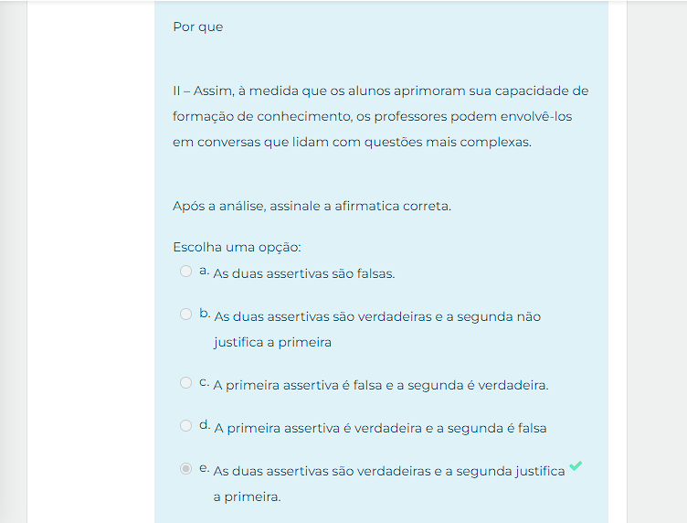 Por que II - Assim, à medida que os alunos aprimoram sua capacidade de formação de conhecimento, os professores podem envolvê-los em conversas que lidam com questões mais complexas. Após a análise, assinale a afirmatica Escolha uma opção: a. As duas assertivas são falsas. b. As duas assertivas são verdadeiras e a segunda não justifica a primeira C. A primeira assertiva é falsa e a segunda é verdadeira. d. A primeira assertiva é verdadeira e a segunda é falsa e. As duas assertivas são verdadeiras e a segunda justifica a primeira.