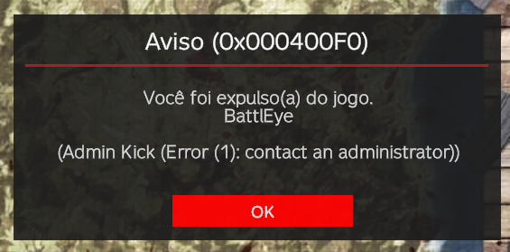 Aviso (0x000400F0) Você foi expulso(a) do jogo. BattlEye (Admin Kick (Error (1): contact an administrator)) OK