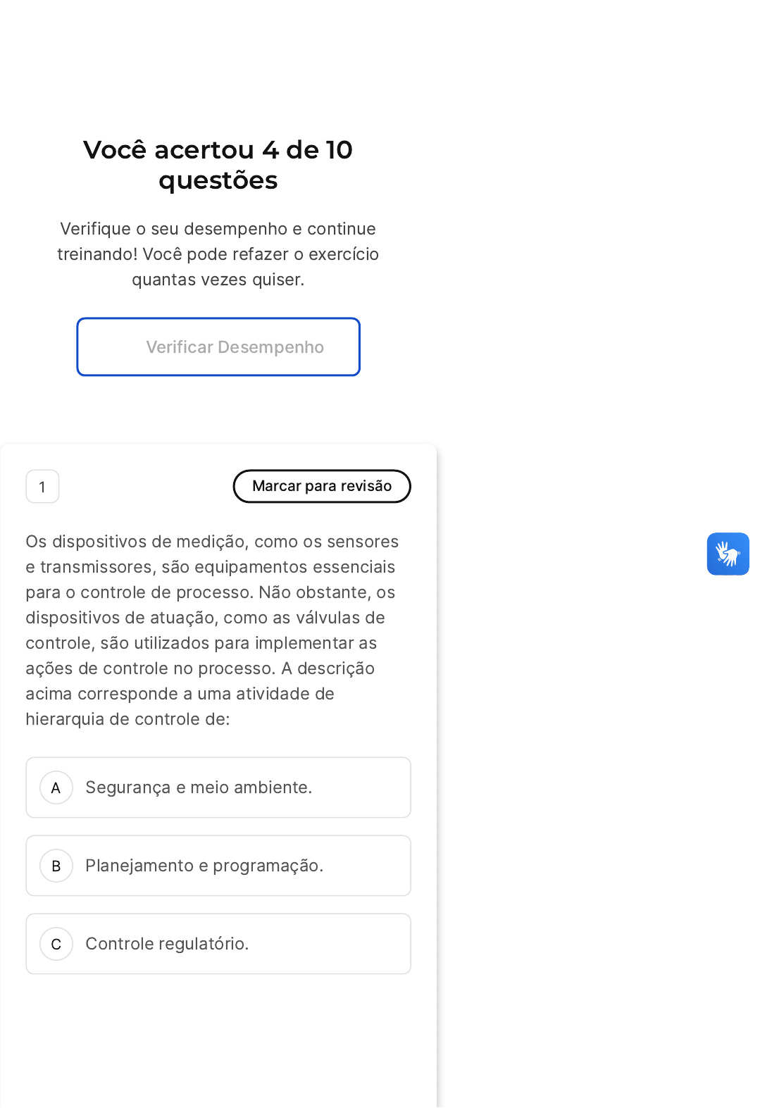 22/03/2024, 19:18 estacio.saladeavaliacoes.com.br/exercicio/65fe0300eee27ec2ab53c8fe/gabarito/ https://estacio.saladeavaliacoes.com.br/exercicio/65fe0300eee27ec2ab53c8fe/gabarito/ 1/19 Você acertou 4 de 10 questões Verifique o seu desempenho e continue treinando! Você pode refazer o exercício quantas vezes quiser. Verificar Desempenho A B C 1 Marcar para revisão Os dispositivos de medição, como os sensores e transmissores, são equipamentos essenciais para o controle de processo. Não obstante, os dispositivos de atuação, como as válvulas de controle, são utilizados para implementar as ações de controle no processo. A descrição acima corresponde a uma atividade de hierarquia de controle de: Segurança e meio ambiente. Planejamento e programação. Controle regulatório. 22/03/2024, 19:18 estacio.saladeavaliacoes.com.br/exercicio/65fe0300eee27ec2ab53c8fe/gabarito/ https://estacio.saladeavaliacoes.com.br/exercicio/65fe0300eee27ec2ab53c8fe/gabarito/ 2/19 D E Otimização em tempo real. Medição e atuação. Resposta correta Parabéns, você selecionou a alternativa correta. Confira o gabarito comentado! Gabarito Comentado A alternativa Segurança e meio ambiente está incorreta. O processo e a segurança dependem do princípio de múltiplas camadas de proteção que envolvem agrupamentos de equipamentos e ações humanas, mas não se relacionam diretamente com a descrição apresentada no enunciado. A alternativa Planejamento e programação também está incorreta. A etapa de programação e planejamento é a mais alta hierarquia do controle de processo, onde são reunidas todas as informações como taxas de produção, capacidade de armazenamento e projeções de venda para programar tudo de forma mais econômica e segura possível. No entanto, isso não se refere diretamente à descrição do enunciado. A alternativa Controle regulatório está incorreta. O controle regulatório consiste na aplicação de técnicas de controle como a feedback e a feedforward para o melhor controle possível das variáveis do processo, mas não se encaixa na descrição do enunciado. A alternativa Otimização em tempo real está incorreta. Nessa etapa, são avaliadas 22/03/2024, 19:18 estacio.saladeavaliacoes.com.br/exercicio/65fe0300eee27ec2ab53c8fe/gabarito/ https://estacio.saladeavaliacoes.com.br/exercicio/65fe0300eee27ec2ab53c8fe/gabarito/ 3/19 as condições operacionais em tempo real da planta. Caso as condições ótimas do processo mudem durante alguma perturbação, é recomendado recalcular essas condições visando aumentar o lucro de produção. No entanto, isso não corresponde à descrição do enunciado. A alternativa Medição e atuação está correta. A medição e a atuação são a linha de frente do sistema de controle. Nesse contexto, a medição da variável é realizada por algum sensor e a resposta obtida é utilizada para uma tomada de ação visando controlar o processo, o que está em total concordância com a descrição apresentada no enunciado. 2 Marcar para revisão O controle de processos industriais é a metodologia certa para gestores que buscam otimizar o fluxo operacional. Considere as afirmações abaixo sobre os tipos de controle: I. O controle proporcional ajusta a variável controlada de forma proporcional ao erro. II. O controle integral ajusta a variável controlada em função do tempo que o erro ocorre. III. O controle derivativo tem como base a taxa de variação de erro, não sendo recomendado para mudanças repentinas da variável controlada. Estão corretas somente as afirmativas: 22/03/2024, 19:18 estacio.saladeavaliacoes.com.br/exercicio/65fe0300eee27ec2ab53c8fe/gabarito/ https://estacio.saladeavaliacoes.com.br/exercicio/65fe0300eee27ec2ab53c8fe/gabarito/ 4/19 A B C D E I, apenas. II, apenas. III, apenas. I e III, apenas. I e II, apenas. Resposta incorreta Opa! A alternativa correta é a letra E. Confira o gabarito comentado! Gabarito Comentado A afirmativa I está correta, pois no controle proporcional a variável controlada é ajustada de maneira proporcional ao erro. Isso significa que a variável controlada não consegue atingir o valor desejado (setpoint) devido ao offset. A afirmativa II também está correta, pois o controle integral é baseado no tempo de duração do erro. No entanto, se ocorrerem mudanças bruscas na variável controlada, o tempo em que o erro ocorre é muito curto, fazendo com que a variável controlada não retorne ao setpoint na velocidade esperada. Já a afirmativa III está incorreta. O controle derivativo, que se baseia na taxa de variação do erro, é eficaz para lidar com mudanças bruscas na variável controlada. No entanto, se houver muito ruído, esses 22/03/2024, 19:18 estacio.saladeavaliacoes.com.br/exercicio/65fe0300eee27ec2ab53c8fe/gabarito/ https://estacio.saladeavaliacoes.com.br/exercicio/65fe0300eee27ec2ab53c8fe/gabarito/ 5/19 A B serão amplificados, o que pode levar a erros de controle. 3 Marcar para revisão Na Figura abaixo está apresentada uma malha de controle para uma coluna de destilação. Os elementos LT, FT e PT são, respectivamente, medidores de nível, fluxo e pressão, enquanto LC, FC e PC simbolizam, nesta ordem, controladores de nível, fluxo e pressão. A partir desse esquema podemos afirmar que: Fonte: YDUQS, 2023. A alimentação é uma variável de perturbação. A alimentação é uma variável manipulada. 22/03/2024, 19:18 estacio.saladeavaliacoes.com.br/exercicio/65fe0300eee27ec2ab53c8fe/gabarito/ https://estacio.saladeavaliacoes.com.br/exercicio/65fe0300eee27ec2ab53c8fe/gabarito/ 6/19 C D E A vazão de vapor para o condensador de topo é controlada pela vazão de alimentação. A vazão de vapor no refervedor é controlada pela pressão da coluna. A vazão do destilado depende apenas do nível de líquido no acumulador. Resposta incorreta Opa! A alternativa correta é a letra A. Confira o gabarito comentado! Gabarito Comentado A alimentação é uma variável de pert