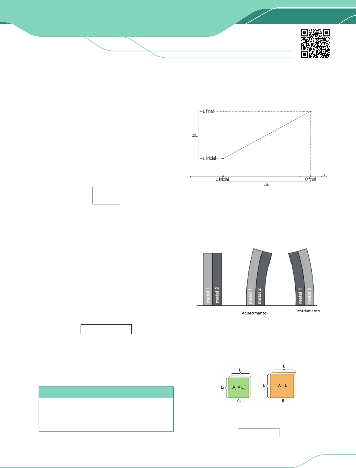 FÍSICA II PRÉ-VESTIBULAR 329SISTEMA PRODÍGIO DE ENSINO 02 DILATAÇÃO TÉRMICA DILATAÇÃO TÉRMICA Sabemos que a temperatura de um corpo é a medida do grau de agitação de suas moléculas. Quando a temperatura do corpo aumenta, essa agitação também aumenta e com isso o espaçamento médio entre as moléculas tende a se torna maior. Portanto, cresce o volume ocupado pelo corpo, o que chamamos de DILATAÇÃO. É fácil concluir que se a temperatura diminuir, as moléculas tendem a ficar mais próximas, diminuindo espaçamento entre elas e provocando o que chamamos de CONTRAÇÃO. Existem substâncias, como por exemplo, a água, que demonstram um comportamento anômalo em certas variações de temperatura, mas abordaremos esse caso mais à frente. Vale ressaltar que o volume do corpo sofre alteração com a mudança de temperatura, mas a massa do corpo permanece inalterada, logo, a densidade também passa a depender da temperatura. Volume e densidade são inversamente proporcionais. md v ↓ = ↑ Se um corpo sofre dilatação sua densidade diminui, se o corpo sofre contração sua densidade aumenta. DILATAÇÃO LINEAR Dilatação (ou Contração) Térmica é aquela que ocorre devido a uma variação na sua temperatura. É pouco usada a expressão contração, mas quando se encontra uma dilatação negativa é fato que o corpo contraiu. Quando esta dilatação se faz sensível em apenas uma das dimensões do corpo dizemos que houve uma Dilatação Linear. Consideremos uma barra de comprimento inicial igual a L0 a uma temperatura θ0. Se aquecermos esta barra a uma temperatura θ, ela aumentará seu comprimento de L0 atingindo um comprimento L. A variação de comprimento ΔL é proporcional ao comprimento inicial L0 e à variação de temperatura ΔL = L0 · α · Δθ A constante de proporcionalidade α que nos permite escrever a equação acima é uma característica do material com o qual se está trabalhando e leva o nome de Coeficiente de Dilatação Linear. A tabela abaixo mostra alguns valores de coeficientes de dilatação linear. Verifique porque sua unidade é o oC-1. Material (°C-1) Chumbo Alumínio Cobre Vidro comum 27.10-6 22.10-6 17.10-6 9.10-6 A expressão citada anteriormente combinada com a expressão ∆L = L – Lo nos leva à equação L=L0(1+α∆θ), que nos permite calcular o comprimento final. Nossa experiência mostra que os alunos erram menos quando trabalham com as duas primeiras equações separadas. Lâminas Bimetálicas Uma lâmina bimetálica é construída a partir de duas lâminas metálicas com coeficientes de dilatação diferentes. Na figura quando as lâminas são aquecidas, considerando a1 > a2, a lâmina do metal 1 sofre uma dilatação maior que a lâmina do metal 2, gerando uma deflexão tomando a forma de um arco. No resfriamento também ocorre uma deflexão, porém com uma curvatura contrária da observada no aquecimento. DILATAÇÃO SUPERFICIAL Dizemos que um corpo sofreu uma dilatação superficial quando a dilatação se faz sensível em apenas duas dimensões. Na figura abaixo, a placa possuía uma área igual a A0. Ao ser aquecida, sua dimensão passará a ser A. A expressão que calcula a variação da área da placa é bem parecida com a expressão da dilatação linear. Podemos calcular a variação da área pela fórmula: ∆A=A0·β·∆θ PRÉ-VESTIBULARSISTEMA PRODÍGIO DE ENSINO330 FÍSICA II 02 DILATAÇÃO TÉRMICA Combinando com ∆A = A – A0 encontramos A=A0(1+β∆θ), continuamos sugerindo que trabalhe apenas com as duas primeiras equações. A constante de proporcionalidade β que proporciona a primeira equação é denominada Coeficiente de Dilatação Superficial, e é possível mostrar que sua relação com β é: β=2α. Dilatação em cavidades No aquecimento, orifícios encontrados em placas ou blocos aumentarão de tamanho e, no resfriamento diminuirão de tamanho. Tudo acontecendo como se a placa ou o bloco tivessem os buracos preenchidos do mesmo material existente ao seu redor. Veja o exemplo na imagem: Quando um objeto sofre uma dilatação térmica, quaisquer buracos existentes no objeto também se dilatam (a dilatação foi exagerada na imagem). DILATAÇÃO VOLUMÉTRICA Na dilatação volumétrica não podemos desprezar nenhuma dimensão, as três são relevantes fazendo com que o corpo aumente o seu volume. Ocorre por exemplo nos fluidos e sólidos como: líquidos, gases, esferas, cubos, etc. Agora a constante de proporcionalidade será o COEFICIENTE DE DILATAÇÃO VOLUMÉTRICO γ, onde γ=3α. Extravasamento Agora temos um líquido que preenche por completo um recipiente e ambos são aquecidos. O líquido sofrerá uma dilatação volumétrica e uma parte acabará sendo derramada para fora do recipiente. Essa porção que extravasou é chamada de dilatação aparente, pois para saber a dilatação real do líquido ainda deveríamos levar em conta a dilatação do recipiente. Logo: Volume inicial do líquido = Volume inicial do recipiente Variação Percentual Pode-se perguntar a variação percentual das dimensões de um corpo ao sofrer uma variação de temperatura, para responder devemos usar as seguintes relações: PRÉ-VESTIBULAR SISTEMA PRODÍGIO DE ENSINO 02 DILATAÇÃO TÉRMICA 331 FÍSICA II 1) ∆ ∆ = ⋅ 0 LL% 100 L para variação percentual na dilatação linear.ou ∆ = α ⋅ ∆θ ⋅L% 100 2) ∆ ∆ = ⋅ 0 AA% 100 A para variação percentual na dilatação superficial.ou ∆ = β ⋅ ∆θ ⋅A% 100 3) ∆ ∆ = ⋅ 0 VV% 100 V para variação percentual na dilatação volumétrica.ou ∆ = γ ⋅ ∆θ ⋅ V% 100 Observe os exercícios resolvidos para entender as aplicações de variação percentual em questões. 01. Uma barra sofre uma variação percentual de 0,4% de comprimento ao sofrer um aquecimento de 200°C. Calcule o coeficiente de dilatação linear dessa barra. Resolução: ∆ = α ⋅ ∆θL% ·100 = α ⋅ ⋅0,4 200 100 = α ⋅0,4 20 000 α = 0,4 20 000 − −⋅ 