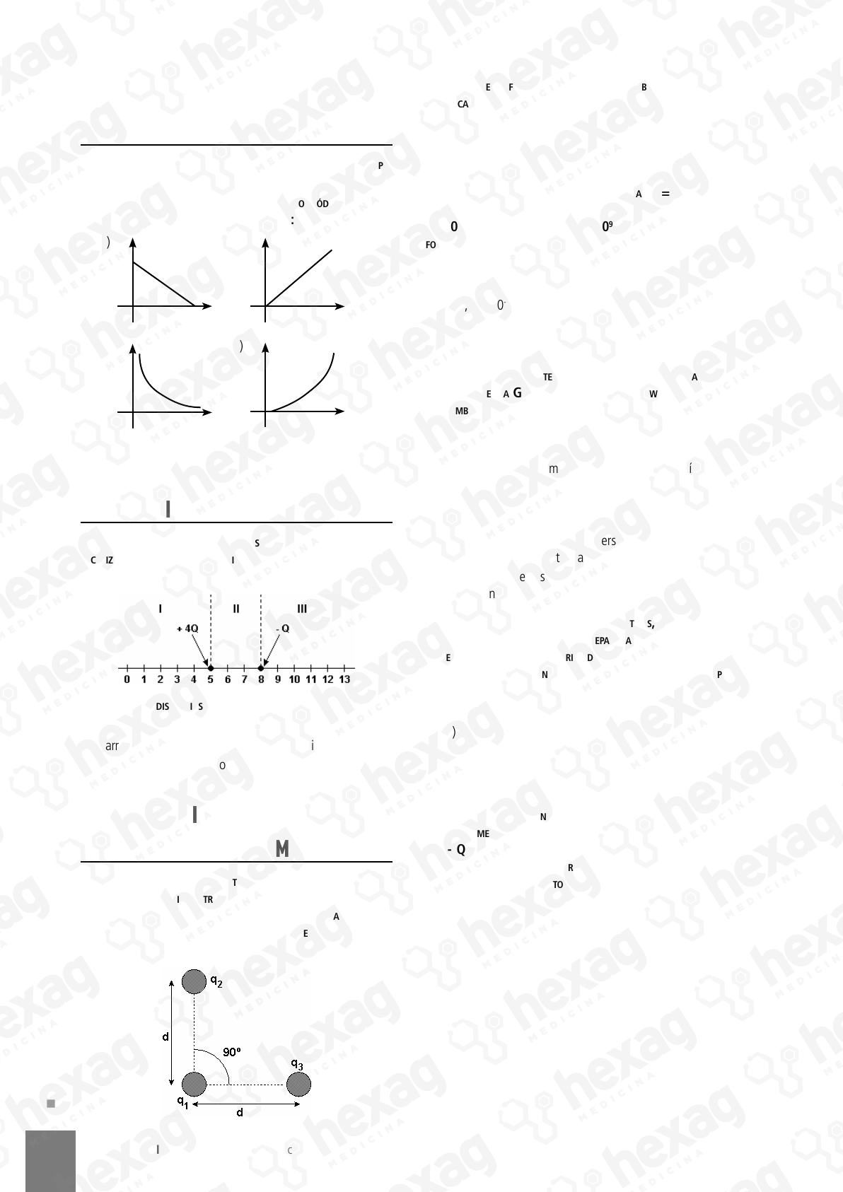 258 CIÊNCIAS DA NATUREZA e suas tecnologias V O LU M E 1 E.O. UErJ ExAmE dE QUAliFiCAçãO 1. (uerj) duas partíCulas eletriCamente Carregadas estão sepa- radas por uma distânCia r. o gráFiCo que melhor expressa a variação do módulo do Força eletrostátiCa F entre elas, em Função de r, é: a) b) F r F r c) d) F r F r E.O. UErJ ExAmE disCUrsivO 1. (uerj) duas partíCulas de Cargas +4q e –q Coulombs estão loCalizadas sobre uma linha, dividida em três regiões i, ii e iii, ConForme a Figura a seguir. observe que as distânCias entre os pontos são todas iguais. a) Indique a região em que uma partícula positivamente carregada (+Q coulomb) pode ficar em equilíbrio. b) Determine esse ponto de equilíbrio. E.O. ObJEtivAs (UnEsp, FUvEst, UniCAmp E UniFEsp) 1. (uniFesp) Considere a seguinte "unidade" de medida: a inten- sidade da Força elétriCa entre duas Cargas q, quando separadas por uma distânCia d, é F. suponha em seguida que uma Carga q1 = q seja ColoCada Frente a duas outras Cargas, q2 = 3q e q3 = 4q, segundo a disposição mostrada na Figura. a intensidade da Força elétriCa resultante sobre a Carga q1, dev- ido às Cargas q2 e q3, será a) 2 F. d) 5 F. b) 3 F. e) 9 F. c) 4 F. 2. (uniFesp) duas partíCulas de Cargas elétriCas q1 = 4,0 × 10-16 C e q2 = 6,0 × 10-16 C estão separadas no váCuo por uma distânCia de 3,0 × 10-9 m. sendo k = 9,0 × 109 n.m2/C2, a intensidade da Força de interação entre elas, em newtons, é de: a) 1,2 × 10-5. b) 1,8 × 10-4. c) 2,0 × 10-4. d) 2,4 × 10-4. e) 3,0 × 10-3. 3. (unesp) assinale a alternativa que apresenta o que as Forças dadas pela lei da gravitação universal de newton e pela lei de Coulomb têm em Comum. a) Ambas variam com a massa das partículas que interagem. b) Ambas variam com a carga elétrica das partículas que interagem. c) Ambas variam com o meio em que as partículas interagem. d) Ambas variam com o inverso do quadrado da distância entre as partículas que interagem. e) Ambas podem ser tanto de atração como de re- pulsão entre as partículas que interagem. 4. (unesp) duas esFeras Condutoras idêntiCas, Carregadas Com Cargas + q e - 3 q, iniCialmente separadas por uma distânCia d, atraem-se Com uma Força elétriCa de intensidade (módulo) F. se as esFeras são postas em Contato e, em seguida, levadas de volta para suas posições originais, a nova Força entre elas será: a) maior que F e de atração. b) menor que F e de atração. c) igual a F e de repulsão. d) menor que F e de repulsão. e) maior que F e de repulsão. 5. (Fuvest) a uma distânCia d uma da outra, enContram-se duas esFerinhas metáliCas idêntiCas, de dimensões desprezíveis, Com Car- gas - q e + 9 q. elas são postas em ContaCto e, em seguida, ColoCadas à distânCia 2 d. a razão entre os módulos das Forças que atuam após o ContaCto e antes do ContaCto é: a) 2/3 b) 4/9 c) 1 d) 9/2 e) 4