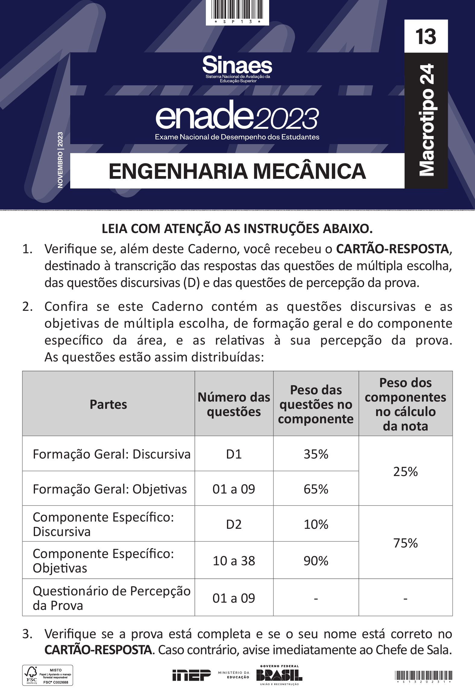 LEIA COM ATENÇÃO AS INSTRUÇÕES ABAIXO. 1. Verifi que se, além deste Caderno, você recebeu o CARTÃO-RESPOSTA, desti nado à transcrição das respostas das questões de múlti pla escolha, das questões discursivas (D) e das questões de percepção da prova. 2. Confira se este Caderno contém as questões discursivas e as objetivas de múltipla escolha, de formação geral e do componente específi co da área, e as relati vas à sua percepção da prova. As questões estão assim distribuídas: Partes Número das questões Peso das questões no componente Peso dos componentes no cálculo da nota Formação Geral: Discursiva D1 35% 25% Formação Geral: Objeti vas 01 a 09 65% Componente Específi co: Discursiva D2 10% 75% Componente Específi co: Objeti vas 10 a 38 90% Questi onário de Percepção da Prova 01 a 09 - - 3. Verifi que se a prova está completa e se o seu nome está correto no CARTÃO-RESPOSTA. Caso contrário, avise imediatamente ao Chefe de Sala. M I N I S T É R I O D A E D U C A Ç Ã O 13 M ac ro tip o 24 ENGENHARIA MECÂNICA VALIDINEP2023VALIDINEP2023VALIDINEP2023VALIDINEP2023VALIDIN3P2023VALIDINEP2023VALIDINEP2023VALIDINEP2023VALIDINEP2023VALIDINEP2023VALIDINEP2023VALIDINEP2023VALIDINEP2023VALIDINEP2023VALIDINEP2023VALIDINEP2023VALIDINEP2023VALIDINEP2023VALIDINEP2023VALIDINEP2023VALIDINEP2023VALIDINEP2023VALIDINEP2023VALIDINEEP2023VALIDINEP2023VALIDINEP2023VALIDINEP2023VALIDINEP2023VALIDINEP2023VALIDINEP2023VALIDINEP2023VALIDINEP2023VALIDDINVALIDINEP2023VALIDINEP2023VALIDINEP2023VALIDINEP2023VALIDINEP2023VALIDINEP2023VALIDINEP2023VALIDINEP2023VALIDINEP2023VALIDINEP2023VALIDINEP2023VALIDINEP2023VALIDINEP N O VE M BR O | 20 23 *S1320231* creo 4. Assine o CARTÃO-RESPOSTA no local apropriado, com caneta esferográfi ca de � nta preta, fabricada em material transparente. 5. As respostas da prova objeti va, da prova discursiva e do questi onário de percepção da prova deverão ser transcritas, com caneta esferográfi ca de ti nta preta, fabricada em material transparente, no CARTÃO-RESPOSTA que deverá ser entregue ao Chefe de Sala ao término da prova. 6. Responda cada questão discursiva em, no máximo, 15 linhas. Qualquer texto que ultrapasse o espaço destinado à resposta será desconsiderado. 7. A prova terá duração de quatro horas. Lembre-se de reservar um período para transcrição das respostas para o CARTÃO-RESPOSTA. 8. Ao terminar a prova, acene para o Chefe de Sala e aguarde-o em sua carteira. Ele então irá proceder à sua identi fi cação, recolher o seu material de prova e coletar a sua assinatura na Lista de Presença. 9. Atenção! Você deverá permanecer na sala de aplicação por, no mínimo, duas horas a partir do início da prova e só poderá levar este Caderno quando faltarem 30 minutos para o término da prova. *S1320232* 3Engenharia Mecânica FORMAÇÃO GERAL 1MATÉRIA QUESTÃO DISCURSIVA 01 Na publicação Síntese de Indicadores Sociais, divulgada pelo Insti tuto Brasileiro de Geografi a e Estatí sti ca (IBGE) em 2022, é sistemati zado um conjunto de informações sobre a realidade social brasileira. Os indicadores ilustram a heterogeneidade da sociedade sob a perspecti va das desigualdades sociais e, de modo geral, demonstram que todas as Grandes Regiões do Brasil registraram aumento da extrema pobreza em 2021. Pelos critérios do Banco Mundial, cerca de 29,4% da população do Brasil estavam em situação de pobreza e 8,4%, de extrema pobreza, sendo esses os maiores percentuais de ambos os grupos desde o início da série, em 2012. O índice de Gini, indicador que permite analisar o nível de igualdade ou desigualdade de uma região ou de um país, teve seu valor elevado e ati ngiu o segundo maior patamar da série. Com esses resultados, o Brasil permanece entre os países mais desiguais do mundo. Além disso, a urbanização desigual e acelerada resultou na expansão e no agravamento de diversos problemas socioambientais. São evidentes as desigualdades territoriais no acesso a áreas com infraestrutura adequada nas cidades brasileiras. É na periferia, marcada pela estrati fi cação e segregação socioespacial, que se consolida a exclusão da população vulnerabilizada socioeconomicamente. Disponível em: htt ps://agenciadenoti cias.ibge.gov.br/agencia-noti cias/2012- agencia-de-noti cias/noti cias/35687-em-2021-pobreza-tem-aumento-recorde- e-ati nge-62-5-milhoes-de-pessoas-maior-nivel-desde-2012. Acesso em: 9 jun. 2023 (adaptado). A parti r das ideias apresentadas no texto, faça o que se pede nos itens a seguir. a) Explique a relação entre o perfi l da população brasileira ati ngida pelas desigualdades sociais nas cidades e os fenômenos de risco socioambiental. (valor: 5,0 pontos) b) Apresente duas propostas que possam ser desenvolvidas em bairros periféricos com condições habitacionais precárias, de forma a serem minimizados os riscos socioambientais, e que envolvam ação governamental e parti cipação da comunidade. (valor: 5,0 pontos) FORMAÇÃO GERAL *1* VALIDINEP2023VALIDINEP2023VALIDINEP2023VALIDINEP2023VALIDIN3P2023VALIDINEP2023VALIDINEP2023VALIDINEP2023VALIDINEP2023VALIDINEP2023VALIDINEP2023VALIDINEP2023VALIDINEP2023VALIDINEP2023VALIDINEP2023VALIDINEP2023VALIDINEP2023VALIDINEP2023VALIDINEP2023VALIDINEP2023VALIDINEP2023VALIDINEP2023VALIDINEP2023VALIDINEP2023VALIDINEP2023VALIDINEP2023VALIDINEP2023VALIDINEP2023VALIDINEP2023VALIDINEP2023VALIDINEP2023VALIDINEP2023VALIDINEP2023VALIDINEP2023VALIDINEP2023VALIDINEP2023VALIDINEP2023VAL1DINEP2023VALIDINEP20233VALIDINEP2023VALIDDINEP2023 VALIDINEP2023VALIDINEP2023VALIDIN3P2023VALIDINEP2023VALIDIN3P2VALIDINEP *S1320233* VALIDINEP2023VALIDINEP2023VALIDIN3P2023VALIDINEP2023VALIDIN3P2VALIDINEP VALIDINEP2023VALIDINEP2023VALIDINEP2023VALIDINEP2023VALIDIN3P2023VALIDINEP2023VALIDINEP2023VALIDINEP2023VALIDINEP2023VALIDINEP2023VALIDINEP2023VALIDINEP2023VALIDINEP2023VALIDINEP2023VALIDINEP2023VALIDINEP2023VALIDINEP2023VALIDINEP2023VALIDINEP2023VALIDINEP2023VALIDINEP202