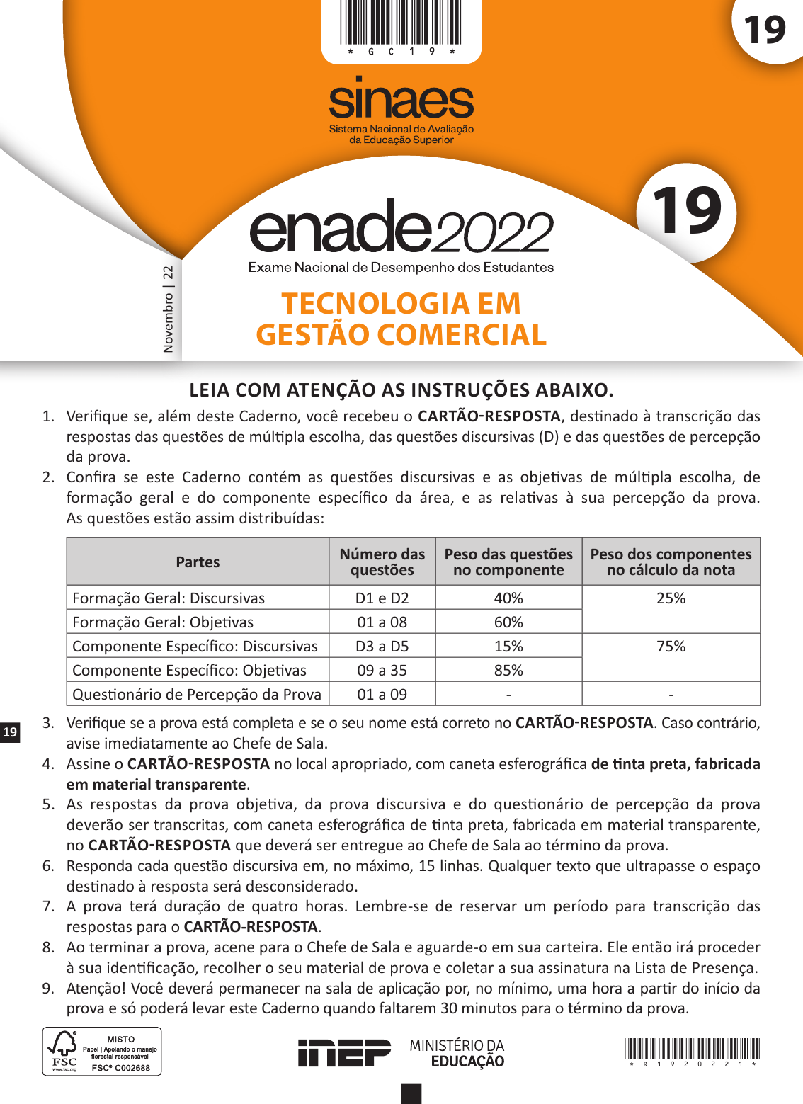 19 Tecnologia em gesTão comercialN ov em br o | 22 19 19 LEIA COM ATENÇÃO AS INSTRUÇÕES ABAIXO. 1. Verifique se, além deste Caderno, você recebeu o CArTÃo-reSPoSTA, destinado à transcrição das respostas das questões de múltipla escolha, das questões discursivas (D) e das questões de percepção da prova. 2. Confira se este Caderno contém as questões discursivas e as objetivas de múltipla escolha, de formação geral e do componente específico da área, e as relativas à sua percepção da prova. As questões estão assim distribuídas: Partes Número das questões Peso das questões no componente Peso dos componentes no cálculo da nota Formação Geral: Discursivas D1 e D2 40% 25% Formação Geral: Objetivas 01 a 08 60% Componente Específico: Discursivas D3 a D5 15% 75% Componente Específico: Objetivas 09 a 35 85% Questionário de Percepção da Prova 01 a 09 - - 3. Verifique se a prova está completa e se o seu nome está correto no CArTÃo-reSPoSTA. Caso contrário, avise imediatamente ao Chefe de Sala. 4. Assine o CArTÃo-reSPoSTA no local apropriado, com caneta esferográfica de tinta preta, fabricada em material transparente. 5. As respostas da prova objetiva, da prova discursiva e do questionário de percepção da prova deverão ser transcritas, com caneta esferográfica de tinta preta, fabricada em material transparente, no CArTÃo-reSPoSTA que deverá ser entregue ao Chefe de Sala ao término da prova. 6. Responda cada questão discursiva em, no máximo, 15 linhas. Qualquer texto que ultrapasse o espaço destinado à resposta será desconsiderado. 7. A prova terá duração de quatro horas. Lembre-se de reservar um período para transcrição das respostas para o CArTÃo-reSPoSTA. 8. Ao terminar a prova, acene para o Chefe de Sala e aguarde-o em sua carteira. Ele então irá proceder à sua identificação, recolher o seu material de prova e coletar a sua assinatura na Lista de Presença. 9. Atenção! Você deverá permanecer na sala de aplicação por, no mínimo, uma hora a partir do início da prova e só poderá levar este Caderno quando faltarem 30 minutos para o término da prova. *R1920221* 2 Tecnologia em Gestão Comercial2 MATÉRIA QUESTÃO DISCURSIVA 01 TEXTO 1 A Fiocruz é uma insti tuição de ciência, saúde e educação, vinculada ao Ministério da Saúde, que completou 120 anos. Com várias ações de pesquisa, de desenvolvimento de tecnologias, de produção de vacinas e medicamentos, a Fiocruz se dedica a enfrentar grandes desafi os sanitários. Seu trabalho é fundamental para pensarmos em um país com mais justi ça e equidade. Disponível em: htt ps: //www.anped.org.br/News/sbpc-divulga-manifesto-em-defesa-da-educação-da-ciencia-eda-democracia . Acesso em: 8 ago. 2022 (adaptado). TEXTO 2 Com a pandemia do novo coronavírus, intensifi caram-se as difi culdades e limitações fí sicas, orçamentárias e estruturais para a pesquisa cientí fi ca. Durante o período de isolamento social, com o fechamento das salas de aula e dos laboratórios, as universidades, com seus professores, acadêmicos e funcionários, precisaram se reinventar. O fazer ciência é um processo complexo que envolve pesquisadores, acadêmicos, estrutura fí sica, horas de dedicação, testes, erros e acertos. Muitas vezes, é preciso também recomeçar, buscar novas metodologias, olhar o resultado por outro viés e reaprender a ler o que se descobriu. Por tudo isso, a pesquisa não é algo que se faz da noite para o dia, e produzi-la é ainda mais desafi ador. Disponível em: htt ps://www.upf.br. Acesso em: 6 jun. 2022 (adaptado). TEXTO 3 A tabela a seguir apresenta a variação do orçamento federal nos anos de 2020 e 2021. Pasta orçamento Federal em 2021 (em bilhões de r$) Variação (2020 - 2021) Agricultura 10,42 - 0,2% Cidadania 103,9 + 22,1% Ciência, Tecnologia e Inovações 8,36 - 28,7% Defesa 65,33 - 9,8% Desenvolvimento Regional 10,68 + 23,6% Economia 569,49 - 4,6% Educação 74,56 - 27,1% Infraestrutura 17,29 - 8,1% Justi ça e Segurança Pública 11,46 - 11,7% Meio Ambiente 2 - 25,1% Minas e Energia 8,94 + 44,2% Mulher, Família e Direitos Humanos 0,52 + 44,4% Relações Exteriores 1,97 - 17,2% Saúde 136,23 + 4,8% Turismo 1,73 - 5,5% PLOA – PLN 28/2020, com as alterações do Congresso Nacional e Consultoria de Orçamento do Senado Federal. Agência Senado. ForMAÇÃo GerAL *2* 3MATÉRIA Com base nas informações dos textos e da tabela apresentados e considerando o contexto da pandemia de Covid-19, faça o que se pede nos itens a seguir. a) Discuta por que os investi mentos públicos em educação, ciência, tecnologia e inovação são estratégicos e contribuem para o desenvolvimento cientí fi co de um país. (valor: 5,0 pontos) b) Explique como o fomento público ao desenvolvimento cientí fi co pode atender à justi ça social e à equidade, em contextos como o da pandemia de Covid-19. (valor: 5,0 pontos) RASCUNHO 1 2 3 4 5 6 7 8 9 10 11 12 13 14 15 Área livre *3**R1920222* 3Tecnologia em Gestão Comercial2 MATÉRIA QUESTÃO DISCURSIVA 01 TEXTO 1 A Fiocruz é uma insti tuição de ciência, saúde e educação, vinculada ao Ministério da Saúde, que completou 120 anos. Com várias ações de pesquisa, de desenvolvimento de tecnologias, de produção de vacinas e medicamentos, a Fiocruz se dedica a enfrentar grandes desafi os sanitários. Seu trabalho é fundamental para pensarmos em um país com mais justi ça e equidade. Disponível em: htt ps: //www.anped.org.br/News/sbpc-divulga-manifesto-em-defesa-da-educação-da-ciencia-eda-democracia . Acesso em: 8 ago. 2022 (adaptado). TEXTO 2 Com a pandemia do novo coronavírus, intensifi caram-se as difi culdades e limitações fí sicas, orçamentárias e estruturais para a pesquisa cientí fi ca. Durante o período de isolamento social, com o fechamento das salas de aula e dos laboratórios, as universidades, com seus professores, acadêmicos e funcionários, precisaram se reinventar. O fazer ci