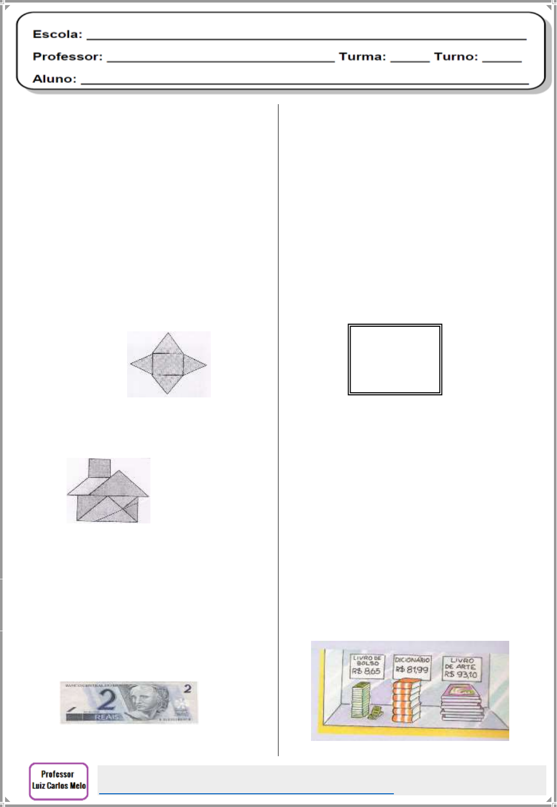 Matemática Séries Iniciais: http://desafiosmate.com.br/material-professor-4-e-5-ano 1. Juliana levou um mês e meio pintando um quadro. Então ela pintou o quadro em a) 15 dias. b) 35 dias. c) 45 dias. d) 55 dias. 2. Roberto estava contando seus selos. Ele tem 8 álbuns com 220 figurinhas. Roberto tem a) 616 figurinhas. b) 800 figurinhas. c) 112 figurinhas. d) 1760 figurinhas. 3. A figura abaixo é uma embalagem desmontada. Esta figura representa a) um cubo. b) um cone. c) um cilindro. d) uma pirâmide. 4. Fábio construiu a figura abaixo com linhas fechadas. Quantas figuras de 3 lados foram desenhadas? a) 3. b) 5. c) 6. d) 9. 5. João e Carlos vendem picolés. No final da tarde João tinha vendido 78 e Carlos vendeu 15 picolés a mais que João. Quantos picolés, Carlos vendeu? a) 58. b) 78. c) 83. d) 93. 6. A cédula que aparece abaixo pode ser trocada por: a) três moedas de 0,50 b) 1 moeda de 0,50 e 4 de 0,25. c) 2 moedas de 0,25 e 5 de 0,10. d) 10 moedas de 0,10 e 2 de 0,50 7. Para as compras do supermercado, Micaely levou R$100,00. Ela gastou certa quantia e voltou para casa com 3/10 da quantia que levou. Que quantia Micaely trouxe de volta para casa? a) R$70,00 b) R$30,00 c) R$3,00 d) R$90,00 8. Na frente de um teatro foi colocado piso antiderrapante para evitar acidentes. Observe as medidas reais do piso. A área do piso emborrachado é: a) 3.000 cm2 b) 30.000 cm2 c) 6.000 cm2 d) 11.000 cm2 9. Um treinador de basquete comprou, em uma promoção, 16 pares de tênis para sua equipe por R$1.432,00. Quanto custou cada par? a) R$89,50 b) R$90,00 c) R$79,50 d) R$89,00 10. Helena é encarregada das compras de uma livraria. Veja os livros que estão na vitrine. Piso emborrachado 60cm x 50cm http://desafiosmate.com.br/material-professor-4-e-5-ano Matemática Séries Iniciais: http://desafiosmate.com.br/material-professor-4-e-5-ano Quantos reais, Helena irá pagar pela, compra de dez livros de arte? a) R$93,10 b) R$931,00 c) R$9.310,00 d) R$9,31 11. Silmara queria comprar uma bicicleta para pedalar no Jordão. Depois de muito pesquisar, ela encontrou uma bicicleta que custava R$469,00 à vista e, à prazo, poderia ser paga em um pagamento inicial de R$47,00 mais 12 vezes de R$47,00. A diferença entre o valor à vista e à prazo é a) R$611,00 b) R$469,00 c) R$94,00 d) R$142,00 12. Os alunos da escola Jacira Mendes foram ao teatro. Dos 200 alunos que foram somente 75% ficaram sentados. Quantos alunos assistiram à peça, sentados? a) 75 b) 150 c) 50 d) 100 13. A diretora da escola Jacira Mendes vai cercar a quadra de esportes com uma rede para evitar que as bolas se percam. A quadra tem medidas de 19m por 32m. Qual o perímetro da quadra? a) 102m b) 1002m c) 51m d) 32m 14. A fração simplificada de 12 é: 36 a) 1/2 b) 1/3 c) 1/4 d) 2/3 15. Que fração representa a parte não pintada da figura? a) 2 5 b) 4 6 c) 2 6 d) 6 2 16. A alternativa que contém uma sequência de múltiplos é: a) 0; 8; 16; 25; 30; 36; 43; 48; 56 b) 0; 12; 24; 36; 48; 60; 72; 84; 96 c) 0; 15; 30; 35; 45; 48; 55; 60; 65 d) 0; 12; 24; 36; 47; 60; 72; 85; 96 Júlia e Ricardo vão sempre ao pediatra. A médica dos dois está acompanhando o crescimento de ambos através de um gráfico de linhas, para comparar as medidas dos dois ao longo do ano. 17. Observando o gráfico, quanto, Júlia cresceu de Janeiro a Setembro? a) 134 cm b) 130 cm c) 132 cm d) 136 cm 18. Observando o gráfico da questão anterior, a diferença de altura entre Ricardo e Júlia no mês de Março é: a) 4 cm b) 130 cm c) 134 cm d) 2 cm 19. Seu João anda 2350 metros a pé todos os dias para ir de sua casa até o seu trabalho. Quantos metros seu João caminha por dia para ir e voltar do trabalho, considerando que ele vai pela manhã e volta à noite? a) 4.600 metros; b) 4.610 metros; c) 4.700 metros; d) 4.710 metros. http://desafiosmate.com.br/material-professor-4-e-5-ano Matemática Séries Iniciais: http://desafiosmate.com.br/material-professor-4-e-5-ano 20. Os relógios estão marcando a chegada e a saída de Alexandre na escola. Então Alexandre passa na escola: a) 2 horas b) 4 horas c) 5 horas d) 8 horas http://desafiosmate.com.br/material-professor-4-e-5-ano