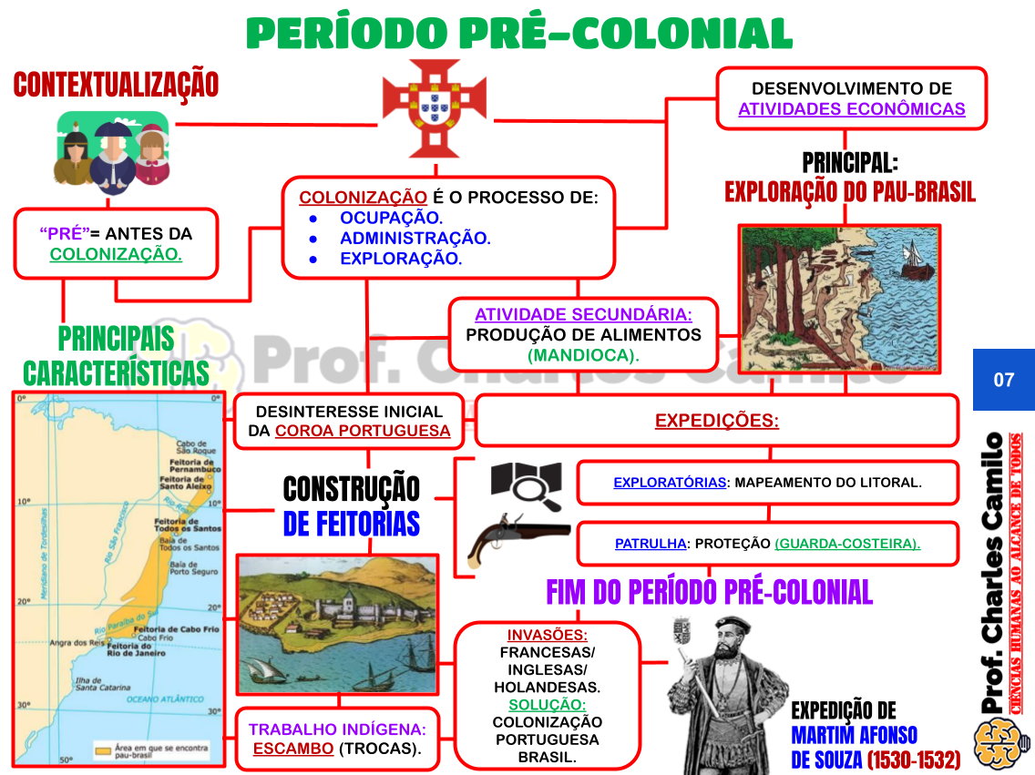 PRÉ-COLONIAL DESENVOLVIMENTO DE ATIVIDADES ECONÔMICAS PRINCIPAL: É o PROCESSO DE: EXPLORAÇÃO DO PAU-BRASIL "PRÉ"= ANTES DA ADMINISTRAÇÃO. ATIVIDADE SECUNDÁRIA: PRINCIPAIS DE ALIMENTOS CARACTERÍSTICAS (MANDIOCA). 07 DESINTERESSE INICIAL EXPEDIÇÕES: DA COROA PORTUGUESA Cabo de São Roque Feitoria de Pernambuco Feitoria de Santo Aleixo CONSTRUÇÃO EXPLORATÓRIAS: MAPEAMENTO DO 10 Feitoria de Todos os Santos DE FEITORIAS Todos os Santos PATRULHA: PROTEÇÃO Bala de Porto Seguro FIM DO PERÍODO PRÉ-COLONIAL OF Feitoria de Caho Frio INVASÕES: Angra dos do Rio de Janeiro FRANCESAS/ INGLESAS/ de Santa Catarina OCEANO EXPEDIÇÃO DE TRABALHO COLONIZAÇÃO PORTUGUESA MARTIM AFONSO Área em que se encontra pau-brasil ESCAMBO (TROCAS). BRASIL. DE SOUZA (1530-1532)