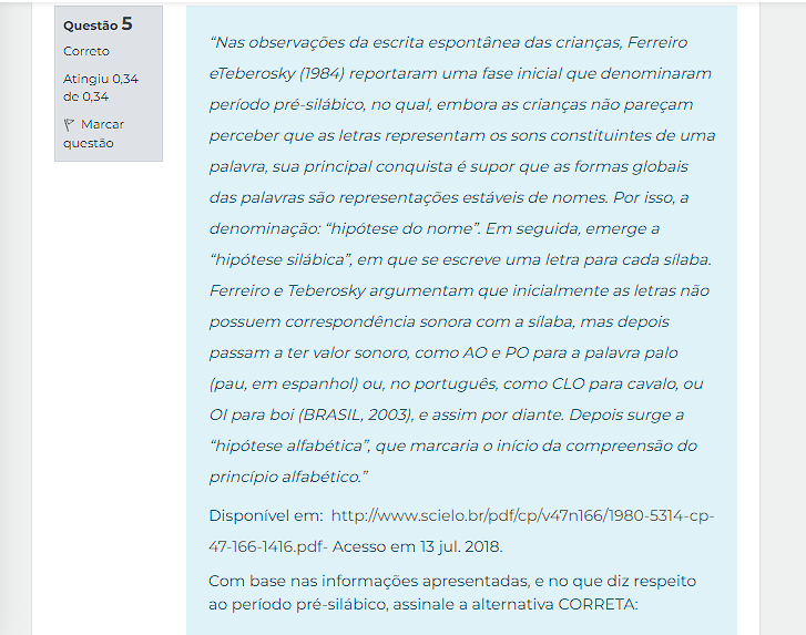 Questão 5 Correto "Nas observações da escrita espontânea das crianças, Ferreiro Atingiu 0,34 eTeberosky (1984) reportaram uma fase inicial que denominaram de 0,34 período pré-silábico, no qual, embora as crianças não pareçam P Marcar questão perceber que as letras representam os sons constituintes de uma palavra, sua principal conquista é supor que as formas globais das palavras são representações estáveis de nomes. Por isso, a denominação: do nome". Em seguida, emerge a "hipótese silábica", em que se escreve uma letra para cada Ferreiro e Teberosky argumentam que inicialmente as letras não possuem correspondência sonora com a sílaba, mas depois passam a ter valor sonoro, como AO e PO para a palavra palo (pau, em espanhol) ou, no português, como CLO para cavalo, ou OI para boi (BRASIL, 2003), e assim por diante. Depois surge a "hipótese alfabética", que marcaria início da compreensão do princípio alfabético." Disponível em: 47-166-1416.pdf- Acesso em 13 jul. 2018. Com base nas informações apresentadas, e no que diz respeito ao período pré-silábico, assinale a alternativa CORRETA: