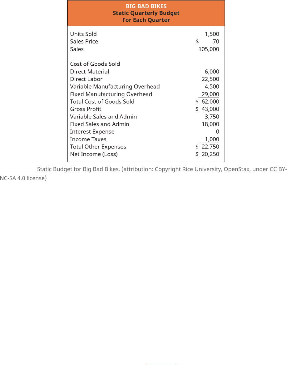 Figure 7.24 Static Budget for Big Bad Bikes. (attribution: Copyright Rice University, OpenStax, under CC BY- NC-SA 4.0 license) Budget with Varying Levels of Production Companies develop a budget based on their expectations for their most likely level of sales and expenses. Often, a company can expect that their production and sales volume will vary from budget period to budget period. They can use their various expected levels of production to create a flexible budget that includes these different levels of production. Then, they can modify the flexible budget when they have their actual production volume and compare it to the flexible budget for the same production volume. A flexible budget is more complicated, requires a solid understanding of a company’s fixed and variable expenses, and allows for greater control over changes that occur throughout the year. For example, suppose a proposed sale of items does not occur because the expected client opted to go with another supplier. In a static budget situation, this would result in large variances in many accounts due to the static budget being set based on sales that included the potential large client. A flexible budget on the other hand would allow management to adjust their expectations in the budget for both changes in costs and revenue that would occur from the loss of the potential client. The changes made in the flexible budget would then be compared to what actually occurs to result in more realistic and representative variance. This ability to change the budget also makes it easier to pinpoint who is responsible if a revenue or cost target is missed. Big Bad Bikes used the flexible budget concept to develop a budget based on its expectation that production levels will vary by quarter. By the fourth quarter, sales are expected to be strong enough to pay back the financing from earlier in the year. The budget shown in Figure 7.25 illustrates the payment of interest and contains information helpful to management when determining which items should be produced if production capacity is limited. 376 Chapter 7 Budgeting This OpenStax book is available for free at http://cnx.org/content/col25479/1.11 Figure 7.25 Varying Production Levels for Big Bad Bikes. (attribution: Copyright Rice University, OpenStax, under CC BY-NC-SA 4.0 license) C O N C E P T S I N P R A C T I C E Flexible Budgets and Sustainability The ability to provide flexible budgets can be critical in new or changing businesses where the accuracy of estimating sales or usage my not be strong. For example, organizations are often reporting their sustainability efforts and may have some products that require more electricity than other products. The reporting of the energy per unit of output has sometimes been in error and can mislead management into making changes that may or may not help the company. For example, based on the energy per unit reported, management may decide to change the product mix, the amount that is outsourced, and/or the amount that is produced.[1] If the energy output isn’t correct, the decisions may be wrong and create an adverse impact on the budget. L I N K T O L E A R N I N G In theory, a flexible budget is not difficult to develop since the variable costs change with production and 1 Jon Bartley, et al. “Using Flexible Budgeting to Improve Sustainability Measures.: American Institute of CPAs. Jan. 23, 2017. https://www.aicpa.org/interestareas/businessindustryandgovernment/resources/sustainability/improvesustainabilitymeasures.html Chapter 7 Budgeting 377 7.5 Explain How Budgets Are Used to Evaluate Goals As you’ve learned, an advantage of budgeting is evaluating performance. Having a strong understanding of their budgets helps managers keep track of expenses and work toward the company’s goals. Companies need to understand their revenue and expense details to develop budgets as a tool for planning operations and cash flow. Part of understanding revenue and expenses is evaluating the prior year. Did the company earn the expected profit? Could it have earned a higher profit? What expenses or revenues were not on the budget? Critically evaluating the actual results versus the estimated budgetary results can help management plan for the future. Variance analysis helps the manager analyze its results. It does not necessarily find a problem, but it does indicate where a problem may exist. The same is true for favorable variances as well as unfavorable variances. A favorable variance occurs when revenue is higher than budgeted or expenses are lower than budgeted. An unfavorable variance is when revenue is lower than budgeted or expenses are higher than budgeted. Comparing Favorable to Unfavorable Variances Favorable Unfavorable Actual Sales > Budgeted Sales Actual Sales < Budgeted Sales Actual Expenses < Budgeted Expenses Actual Expenses > Budgeted expenses Table 7.2 It is easy to understand that an unfavorable variance may be a problem. But that is not always true, as a higher labor rate may mean the company has a higher quality employee who is able to waste less material. Likewise, having a favorable variance indicates that more revenue was earned or less expenses were incurred but further analysis can indicate if costs were cut too far and better materials should have been purchased. If a company has only a static budget, meaningful comparisons are difficult. Analyzing the sales for Bid Bad Bikes will illustrate whether there was a profit and how net income impacts the company. In the third quarter, Big Bad Bikes sold 1,400 trainers and had third quarter net income of $15,915 as shown in Figure 7.26. the fixed costs remain the same. However, planning to meet an organization’s goals can be very difficult if there are not many variable costs, if the cash inflows are relatively fixed, and if the fixed costs are high. For example, this article shows some large U.S. cities are faced with complicated budgets (https://openstax.org/l/50HighFixe