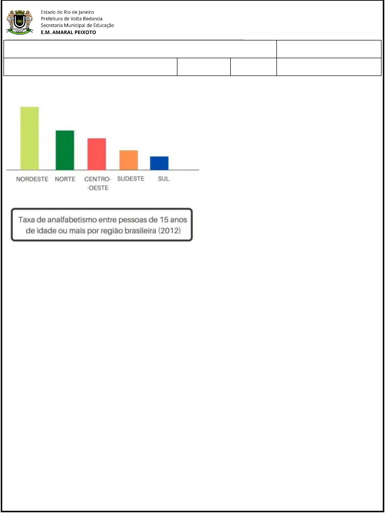 Nome: Data: Professora: Turma Valor 4,0 Nota Trabalho de Geografia - 5º ano - 2 º trimestre 1. Analise o gráfico abaixo e responda as questões: a) De acordo com o gráfico a região que apresenta o maior índice de analfabetismo é ? (0,2) ____________________________________________________________________________________ b) O que o gráfico apresenta? (0,2) ____________________________________________________________________________________________________________________ c) Na sua opinião o que o governo deveria fazer para diminuir o índice de analfabetismo na região Nordeste? (0,2) _____________________________________________________________________________________________________________________________ _____________________________________________________________________________________________________________________________ 2.Leia o texto e responda: DESIGUALDADE SOCIAL A desigualdade social e a pobreza são problemas sociais que afetam a maioria dos países, na atualidade. A pobreza existe em todos os países, pobres ou ricos, mas a desigualdade social é um fenômeno que ocorre principalmente em países não desenvolvidos. A desigualdade Social no Brasil é um problema que afeta grande parte dos brasileiros, embora nos últimos anos ,as estatísticas apontem para a diminuição. Resultados da pesquisa Nacional por Amostra de Domicílios ( Pnad-2011) na avaliação do Instituto de Pesquisa Econômica ´Aplicada (Ipea),demonstram a diminuição da pobreza e consequentemente da desigualdade social no Brasil. Decorrente, essencialmente, da má distribuição de renda, as consequências na favelização , pobreza ,miséria, desemprego, desnutrição, marginalização, violência. a) Quais são os maiores problemas sociais que afetam a maioria dos países? (0,3) _________________________________________________________________________________________________________________ b) A desigualdade social ocorre principalmente em quais países? (0,3) _________________________________________________________________________________________________________________ c) De acordo com o texto quais são as consequências que causam a desigualdade social?(0,3) _________________________________________________________________________________________________________________ _________________________________________________________________________________________________________________ _____________________________________________________________________________________________________ d) O que é desigualdade social? (0,2) ( ) Desigualdade social é a diferença econômica entre as classes sociais mais baixas. ( ) Desigualdade social é a diferença econômica existentes entre as classes sociais mais altas. ( ) Desigualdade social é a diferença existentes entre os grupos de pessoas que formam a sociedade. 3. Observe a tirinha abaixo e responda: a) Sobre qual assunto a tirinha está tratando? (0,2) _____________________________________________________________________________________________________________ b) Que tipo de crítica sobre a sociedade atual podemos tirar a partir dessa tirinha? (0,3) _________________________________________________________________________________________________________________ _________________________________________________________________________________________________________________ c) Sobre o Brasil ser um dos dez países mais ricos do mundo e estar entre os oito com maior desigualdade podemos concluir que? Pense e justifique sua resposta. (0,3) _________________________________________________________________________________________________________________ _________________________________________________________________________________________________________________ _________________________________________________________________________________________________________________ 4. As condições de vida na área urbana nem sempre são mais favoráveis para a população mais, pobre, Viver na cidade é mais caro! Os pobres habitam os bairros mais afastados do centro e , geralmente , do seu local de trabalho. Nas grandes cidades, eles habitam também as inúmeras comunidades. Esses bairros distantes têm sido pouco cuidados pelo poder público. a) A imagem contida no texto retrata algumas diferenças sociais, Identifique : (0,2) (A) Todas as moradias parecem ser iguais. (B) Bem ao lado uma da outra mansões e favela. (C) Só apresenta casas luxuosas. (D)Apenas a favela é realmente retratada na imagem. b) Enumere as questões conforme as moradias: (0,2) ( ) casas juntas ( ) com piscina ( ) sem rede de esgoto ( ) casas pequenas ( ) casas grandes com carros c) O que representa as moradias da imagem 1 em nossa sociedade? (0,2) ________________________________________________________________________________________________________________ a) Segundo o texto, o que é diversidade cultural? (0,2) ( ) É o conjunto de diferentes culturas. ( ) É a padronização da cultura dos povos. ( ) É a criação de leis contra o preconceito. ( ) É a manifestação de uma única cultura. DIVERSIDADE CULTURAL Diversidade cultural se refere às diferentes culturas que existem numa sociedade e são manifestadas nos costumes, tradições, crenças, comportamentos, valores, músicas, dentre outros elementos. A cultura de uma sociedade é transmitida de geração em geração. O que diferencia uma cultura das demais são os elementos que formam o conceito de identidade cultural. Isso significa que uma pessoa pertencente a um determinado grupo possui traços específicos que definem sua cultura. Devemos aprender que as pessoas são diferentes, cada uma tem seu estilo, sua forma de pensar, de se vestir e agir. Apesar das diferenças, elas merecem o mesmo respeito e a mesma oportunidade. Por isso, é necessário acabar com a injustiça e o preconceito, para termos um mundo melhor. 5. Leia o texto e responda: b) Diversidade significa: (0,2) ( ) dominação. ( ) superioridade. 