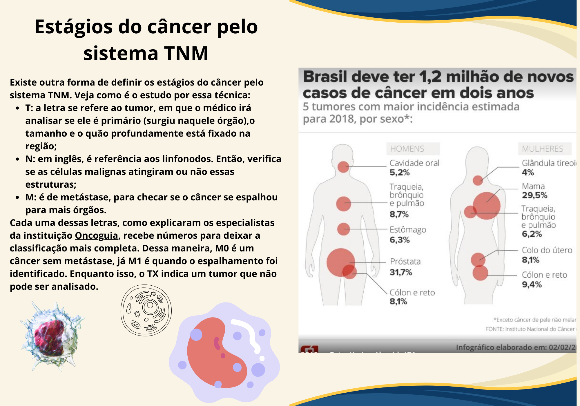 Estágios do câncer pelo sistema TNM Existe outra forma de definir os estágios do câncer pelo Brasil deve ter 1,2 milhão de novos sistema TNM. Veja como é o estudo por essa técnica: casos de câncer em dois anos T: a letra se refere ao tumor, em que o médico irá 5 tumores com maior incidência estimada analisar se ele é primário (surgiu naquele órgão),o para 2018, por sexo*: tamanho e o quão profundamente está fixado na região; HOMENS MULHERES N: em inglês, é referência aos linfonodos. Então, verifica Cavidade oral Glândula se as células malignas atingiram ou não essas 5,2% 4% estruturas; Traqueia, Mama M: é de metástase, para checar se o câncer se espalhou brônquio 29,5% e pulmão para mais órgãos. Traqueia, 8,7% brônquio Cada uma dessas letras, como explicaram os especialistas Estômago e pulmão da instituição Oncoguia, recebe números para deixar a 6,2% 6,3% classificação mais completa. Dessa maneira, é um Colo do útero câncer sem metástase, já M1 é quando o espalhamento foi Próstata 8,1% identificado. Enquanto isso, o TX indica um tumor que não 31,7% Cólon e reto pode ser analisado. 9,4% Cólon e reto 8,1% *Exceto câncer de pele não FONTE: Instituto Nacional do Câncer Infográfico elaborado em: 02/02/2