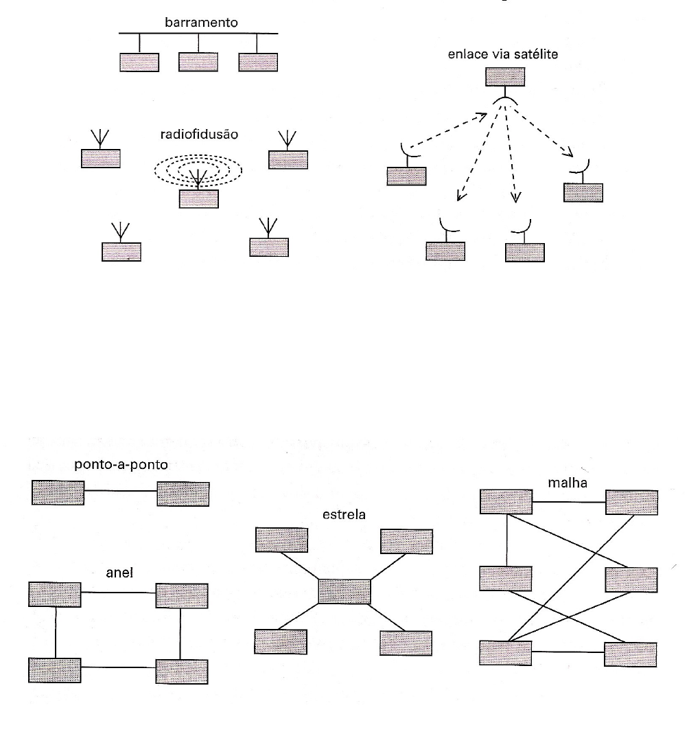 A transmissão é chamada de “guiada” quando um cabo ou barramento é usado na transmissão de sinais, pois os sinais elétricos permanecem confinados nos limites físicos do cabo. A transmissão é chamada de “livre” quando a difusão se dá através do ar ou do vácuo, porque os sinais se propagam livremente pelo espaço. As topologias ponto-a-ponto, anel, estrela e malha são mostradas na figura 2, e as topologias barramento, enlace via satélite e radiodifusão são mostradas na figura 3. Figura 2: Topologias baseadas em difusão. Figura 3: Topologias de barramento, radiodifusão e enlace via satélite.