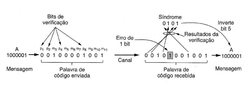 10.1 Códigos de Hamming O código de Hamming foi muito usado para o controle de erros nos sistemas de comunicações digitais. Esse código opera sobre bits individuais. Nesse código, os bits da palavra de código são numerados consecutivamente da esquerda para a direita, onde o bit mais da esquerda é o 1, o próximo bit imediatamente à sua direita é 2, e assim por diante. Os bits que são potência de dois (1,2,4,8,16,...) são os bits de verificação, os demais bits (3,5,6,7,9,...) são preenchidos com os m bits de dados. Cada bit de verificação força a paridade de algum conjunto de bits a ser par ou ímpar. Um bit somente é verificado por aqueles bits de verificação que ocorrem em sua expansão, ou seja, o bit 11 é verificado pelos bits 1, 2 e 8. Nesse exemplo, o código resultante é de distância igual a 3, ou seja, pode corrigir erros simples ou detectar erros duplos. O receptor, ao receber uma palavra de código, refaz os cálculos do bit de verificação, incluindo os valores dos bits de verificação recebidos. Se os bits de verificação estiverem corretos, e se a paridade for par, o resultado de cada verificação deve ser igual a 0, e a palavra de código é válida, caso contrário, se os resultados da verificação não for 0, um erro foi detectado. Este conjunto de resultados é denominado síndrome de erro, e é usada para localizar e corrigir o erro. A figura 31 mostra um exemplo de erro de um bit. 10.2 Códigos de Reed-Solomon Os códigos de Reed-Solomon operam sobre m símbolos de bit, diferentemente dos códigos de Hamming, que operam sobre bits individuais, por esse motivo, esse código é mais complicado do que o código de Hamming. Nos códigos de Reed-Solomon, cada polinômio de grau n é determinado unicamente por n + 1 pontos. Como exemplo, podemos imaginar dois pontos de dados que representam uma linha, estes dois pontos são enviados com mais dois pontos de verificação escolhidos para que se encontrem na mesma linha. Se ocorrer erro em um desses pontos, pode-se recuperar os dados passando uma linha pelos pontos recebidos. Os três pontos sem erros estarão na linha, e o ponto com erro não estará. Encontrando a linha, o erro será corrigido. Esse código funciona de maneira semelhante ao exemplo citado, porém, são definidos como polinômios que operam em campos finitos. Para símbolos de m bits, as palavras de código possuem 2m – 1 símbolos de comprimento. Um jeito mais simples, é tornar m = 8, no qual os símbolos são bytes, Figura 31: Exemplo de um código de Hamming (11,7) corrigindo um único erro. 10 Códigos Corretores de Erro 10.1 Códigos de Hamming 10.2 Códigos de Reed-Solomon
