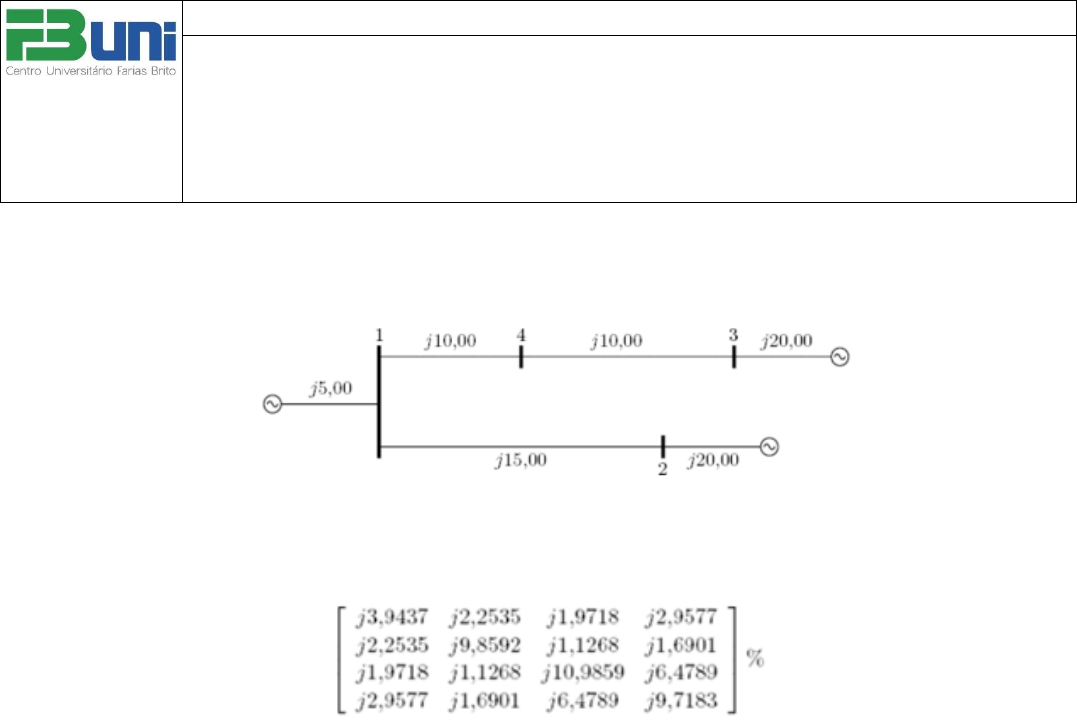EXERCÍCIOS DISCIPLINA: CÁLCULO DE FALTAS PERÍODO: 2023.1 – TURNO: NOITE PROFESSOR(A): NILO RODRIGUES 1. Considere um sistema de subtransmissão (138kV) de 04 barras, cujo diagrama unifilar é apresentado abaixo com os respectivos parâmetros em valores percentuais (%), tomados com SB = 100MVA e VB = 138kV. A Matriz ZBARRA do sistema, utilizada para fins de análise de curto-circuito trifásico equilibrado, é representada na tabela abaixo. A linha de transmissão que interliga as barras 3 e 4 passará por um processo de manutenção e precisa ser desligada por um tempo considerável, requerendo uma reavaliação dos níveis de curto-circuito dos demais barramentos para ajuste do sistema de proteção. Considerando este contexto, avalie o impacto na corrente de curto-circuito da barra 1, antes e depois do desligamento da linha de transmissão que interliga as barras 3 e 4.