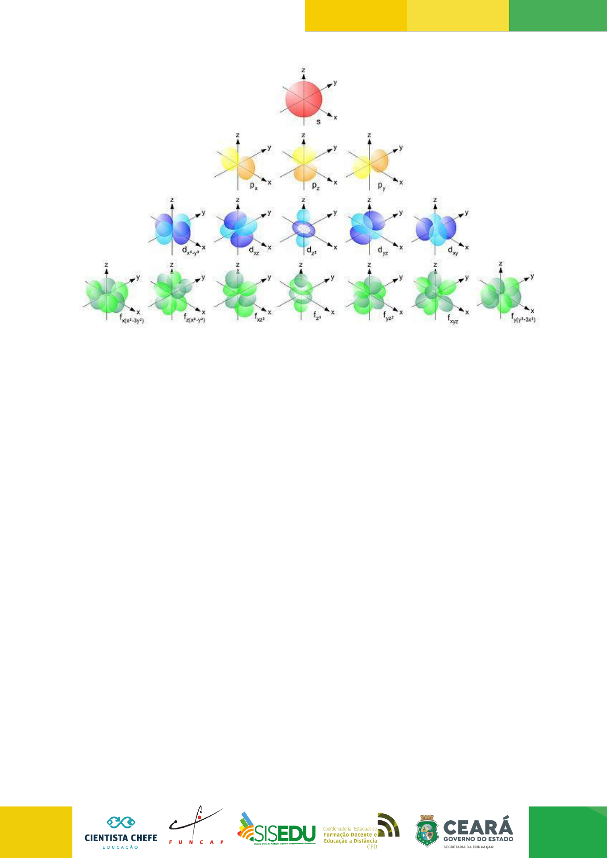 221 Disponível em: <https://maestrovirtuale.com/orbitais-atomicos-em-que-consistem-e-tipos/>. Acesso em: 10 nov. 2021. 4. Os orbitais fazem parte de grupos maiores chamados de camadas eletrônicas, que são representadas pelas letras: K, L, M, N, O, P e Q. 5. Cada camada apresenta um conjunto específico de orbitais atômicos, sendo a camada K de menor energia e mais próxima ao núcleo, e a camada Q de maior energia e mais distante do núcleo. 6. Os elétrons ocupam as camadas de menor energia e progressivamente as camadas mais energéticas. 7. Cada orbital pode ser ocupado por um número máximo de 2 elétrons. Os números quânticos Essas características foram determinadas a partir de interpretações e resoluções de equações que levam em conta os princípios da física quântica. Uma das mais importantes dessas equações é conhecida como equação de Schrödinger em homenagem a seu desenvolvedor. A resolução desta equação permite a descrição do estado energético de elétrons no átomo, que é obtido a partir da determinação de quatro códigos matemáticos, chamados de número quânticos: o número quântico principal (n), número quântico secundário ou azimutal (l), número quântico magnético (m ou ml) e número quântico spin (s ou ms). https://maestrovirtuale.com/orbitais-atomicos-em-que-consistem-e-tipos/ 222 A determinação precisa do estado energético de um átomo leva em conta a descrição de cada um desses números quânticos, de forma que todo elétron em um átomo apresenta um conjunto específico desses números. O número quântico principal (n) O número quântico principal (n), refere-se ao nível de energia do elétron e indica a camada a qual ele pertence. Para os elementos conhecidos até o momento, a quantidade máxima de níveis de energia são sete, sendo representados pelas letras K, L, M, N, O, P e Q, indo da camada mais próxima ao núcleo para a mais distante. Essas camadas correspondem, respectivamente, aos números quânticos 1, 2, 3, 4, 5, 6 e 7, como está resumido na tabela abaixo: Disponível em: <https://mundoeducacao.uol.com.br/quimica/os-quatro-numeros-quanticos.htm>. Acesso em: 10 nov. 2021. O número quântico secundário (l) O número quântico secundário ou azimutal (l), refere-se ao subnível de energia do elétron, como se fossem subcamadas dentro das camadas principais. Essas subcamadas são identificadas pelas letras s, p, d, f, que aumentam de energia nessa ordem e apresentam os seguintes valores de I: https://mundoeducacao.uol.com.br/quimica/os-quatro-numeros-quanticos.htm 223 Disponível em: <https://mundoeducacao.uol.com.br/quimica/os-quatro-numeros-quanticos.htm>. Acesso em: 10 nov. 2021. Cada um desses subníveis é ocupado por um número máximo de elétrons. O subnível “s” pode ser ocupado por no máximo 2 elétrons; o subnível “p” pode ser ocupado por no máximo 6 elétrons; o subnível “d” pode ser ocupado por no máximo 10 elétrons e o subnível “f” pode ser ocupado por no máximo 14 elétrons. Assim, um determinado átomo pode, por exemplo, apresentar 2 elétrons no subnível “d”, que por sua vez faz parte da camada 3. A representação desse estado é descrita simplificadamente como 3d2. Entretanto, não é possível a existência, por exemplo, de um átomo em que o subnível “s” da camada 4 seja preenchido com 3 elétrons, visto que esse número supera o limite máximo de elétrons permitido para essa camada. Em átomos com muitos elétrons, os subníveis são preenchidos com elétrons em ordem crescente de energia. Ou seja, os elétrons ocupam inicialmente os subníveis menos energéticos de acordo com o número máximo permitido e, em seguida, ocupam os subníveis mais energéticos. A determinação do estado de energia de cada subnível foi feita a partir de cálculos matemáticos e essa sequência foi representada graficamente em um diagrama conhecido como diagrama de Linus Pauling, mostrado na figura abaixo: Disponível em: <https://www.manualdaquimica.com/quimica-geral/distribuicao-eletronica.htm>. Acesso em: 10 nov. 2021. https://mundoeducacao.uol.com.br/quimica/os-quatro-numeros-quanticos.htm https://www.manualdaquimica.com/quimica-geral/distribuicao-eletronica.htm 224 De acordo com esse diagrama, a distribuição dos elétrons de um átomo se inicia no subnível 1s e segue a direção das setas, em direção aos outros subníveis, respeitando a quantidade máxima de elétrons permitida para cada um. Considere, por exemplo, o átomo de cloro (Cl), o qual apresenta um total de 17 elétrons. A distribuição desses elétrons de acordo com o diagrama de Pauling será: 1s22s22p63s23p6 Note que nesse caso todos os subníveis estão completos, porém no átomo de Sódio (Na), que apresenta 11 elétrons, temos a distribuição eletrônica apresentada abaixo, na qual o subnível “s” da camada 3 apresenta apenas 1 elétron. 1s22s22p63s1 O número quântico magnético (m) O número quântico magnético indica a orientação dos orbitais (região de máxima probabilidade de se encontrar o elétron no átomo) no espaço. Os seus valores podem variar de -l a + l. Por exemplo: O subnível “s” com valor de l=0, apresenta ml com valor de 0, possuindo portanto uma única orientação no espaço. O subnível “p” com valor de l=1, apresenta ml com os valores -1, 0, +1, assumindo, portanto, 3 orientações no espaço. O subnível “d” com valor de l=2, apresenta ml com os valores -2,-1, 0, +1, +2, assumindo, portanto 5 orientações no espaço. E o subnível “f” com valor de l=3 apresenta ml com os valores -3, -2, -1, 0, +1, +2, +3 assumindo, portanto, 7 orientações no espaço. Cada uma dessas orientações é ocupada por um orbital e cada orbital pode ser ocupado por, no máximo, dois elétrons. O número quântico spin (s) O número quântico do spin mostra o sentido da rotação do elétron. Dois elétrons num mesmo orbital não se repelem, porque cada elétron gira a