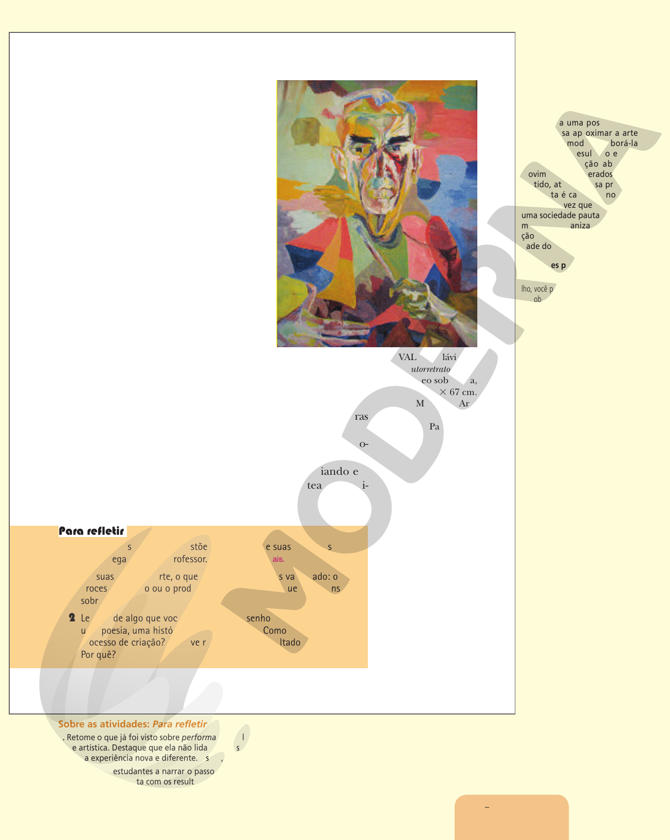 1274o BIMESTRE O Teatro da Experiência era um la- boratório de experimentação em que os artistas podiam testar livremente suas criações. Flávio de Carvalho desenvolveu uma proposta que dava mais importância ao processo artístico do que ao resultado da obra em si. Qual seria a diferença entre processo e resultado? Geralmente, espera-se que o resultado seja a apresentação de um pro- duto final acabado e que possa agradar o público a que se destina. O processo de criação, por sua vez, admite erros, falhas, experimentações, tentativas, brincadeiras e uma leveza maior do que a que se espe- ra do resultado. A peça escrita por Flávio de Carvalho, para o Teatro da Experiência foi chama- da de O bailado do deus morto. Observe uma imagem dela na página anterior. A montagem era cantada, falada, dança- da, tinha muitas músicas e todos os ins trumentos tocados eram da cultura afro-brasileira. Além disso, todos os atores convidados por Flávio eram negros e usavam máscaras de alumínio e camisolas brancas, também criadas pelo autor, em um período em que raras vezes se viam artistas negros no teatro. Após a terceira apresentação, a peça foi proibida pela po- lícia por tratar de questões polêmicas para os padrões morais da época. Impedido de fazer teatro, Flávio seguiu criando em outras áreas artísticas. Até hoje seus ideais sobre o teatro conti- nuam inspirando muitos artistas. Reflita sobre as seguintes questões e compartilhe suas respostas com os colegas e com o professor. 1 Em suas aulas de Arte, o que você considera mais valorizado: o seu processo criativo ou o produto de sua criação? O que você pensa sobre isso? 2 Lembre de algo que você já criou (um desenho, uma roupa, uma poesia, uma história, uma música etc.). Como foi o processo de criação? Ele teve relação com o resultado final? Por quê? Respostas pessoais. CARVALHO, Flávio de. Autorretrato. 1965. Óleo sobre tela, 90 cm # 67 cm. Museu de Arte Moderna, São Paulo (SP). M U S E U D E A R TE M O D E R N A , S Ã O P A U LO (S P ) 127 R ep ro du çã o pr oi bi da . A rt. 1 84 d o C ód ig o P en al e L ei 9 .6 10 d e 19 d e fe ve re iro d e 19 98 . Orientações Pode-se conectar o trabalho com diferentes linguagens ar- tísticas de Flávio de Carvalho com o tema deste livro: a rela- ção entre arte e vida. O caráter processual demandado pelo artista em sua produção tea- tral reitera uma posição artís- tica que visa aproximar a arte da vida, de modo a elaborá-la menos como resultado e mais como investigação aberta a movimentos inesperados. Nesse sentido, até hoje essa premissa do artista é capaz de nos pro- vocar, uma vez que vivemos em uma sociedade pautada por um modo de organização e produ- ção cultural fundado na quali- dade dos resultados. Sugestões para o professor Para saber mais sobre Flávio de Carva- lho, você pode acessar um dossiê sobre sua obra. Disponível em: <http://www. bienal.org.br/post/368>. Acesso em: 26 jun. 2018. CARVALHO, Flávio. A moda e o novo ho- mem: dialética da moda. Rio de Janeiro: Beco do Azougue, 2010. Sobre as atividades: Para refletir 1. Retome o que já foi visto sobre performance ao longo deste capítulo e converse com os estudantes sobre essa modali- dade artística. Destaque que ela não lida com ensaios prévios, que dariam acabamento ao resultado final, sendo a cada vez uma experiência nova e diferente. Assim, a performance apresenta seu próprio processo criativo para o público. 2. Incentive os estudantes a narrar o passo a passo de seus processos criativos e leve-os a pensar como os processos po- dem ter conexão direta com os resultados de tudo o que criamos. http://www.bienal.org.br/post/368 http://www.bienal.org.br/post/368 128 Performance e programa Como você viu ao longo deste capítulo, as performances po- dem ser realizadas para manifestar um ponto de vista, para abordar algum incômodo pessoal ou social, ou pela possibili- dade de transformar o cotidiano e sair da rotina do dia a dia. Veja a seguir alguns pontos que podem transformar uma ação sobre o mundo em uma performance. 1 Antes de tudo, é preciso ter uma inquietação e uma vontade de modificar a forma de ver algo. 2 A performance propõe uma transformação enquanto acontece, seja na atmosfera da cidade, em relação a uma situação, nos espectadores ou no próprio corpo que performa. 3 Muitas performances têm o corpo como foco e instigam a pen- sar na maneira como lidamos com nosso corpo e com o dos outros. 4 A performance integra arte e vida. Diferentemente do teatro, o performer não brinca de ser outra pessoa nem constrói um per- sonagem, como fazem os atores. Ele cria um campo de jogo para experimentar a partir de seu próprio corpo e de sua própria experiência. 5 Performances podem ser organizadas segundo um programa performativo, que é uma descrição breve de todos os passos que compõem a ação. 6 Uma performance pode ser realizada pelo próprio performer que a criou ou por outras pessoas, baseada nas instruções do programa performativo. 7 O público pode ser apenas espectador ou participar ativa- mente da ação. 8 Muitos artistas transformam os seus programas performativos de acordo com as experiências que têm com o público. Uma performance pode estar sempre em movimento e em constante recriação. 128 R ep ro du çã o pr oi bi da . A rt. 1 84 d o C ód ig o P en al e L ei 9 .6 10 d e 19 d e fe ve re iro d e 19 98 . Esta seção aprofunda a apre- sentação dos elementos consti- tuintes da performance. Unidades temáticas da BNCC: Artes visuais; Teatro. Objetos de conhecimento: Materialidades; Elementos da linguagem. Habilidades em foco nesta seção: (EF69AR05) Experimentar e analisar diferentes formas de expressão artística (desenho, pintura, colagem, quadrinhos, dobradura, escultura, modela- gem, instalação, vídeo, fotogra- fia, performance etc.). (EF69AR26) Explorar diferentes elementos envolvidos na com- posição dos aconte