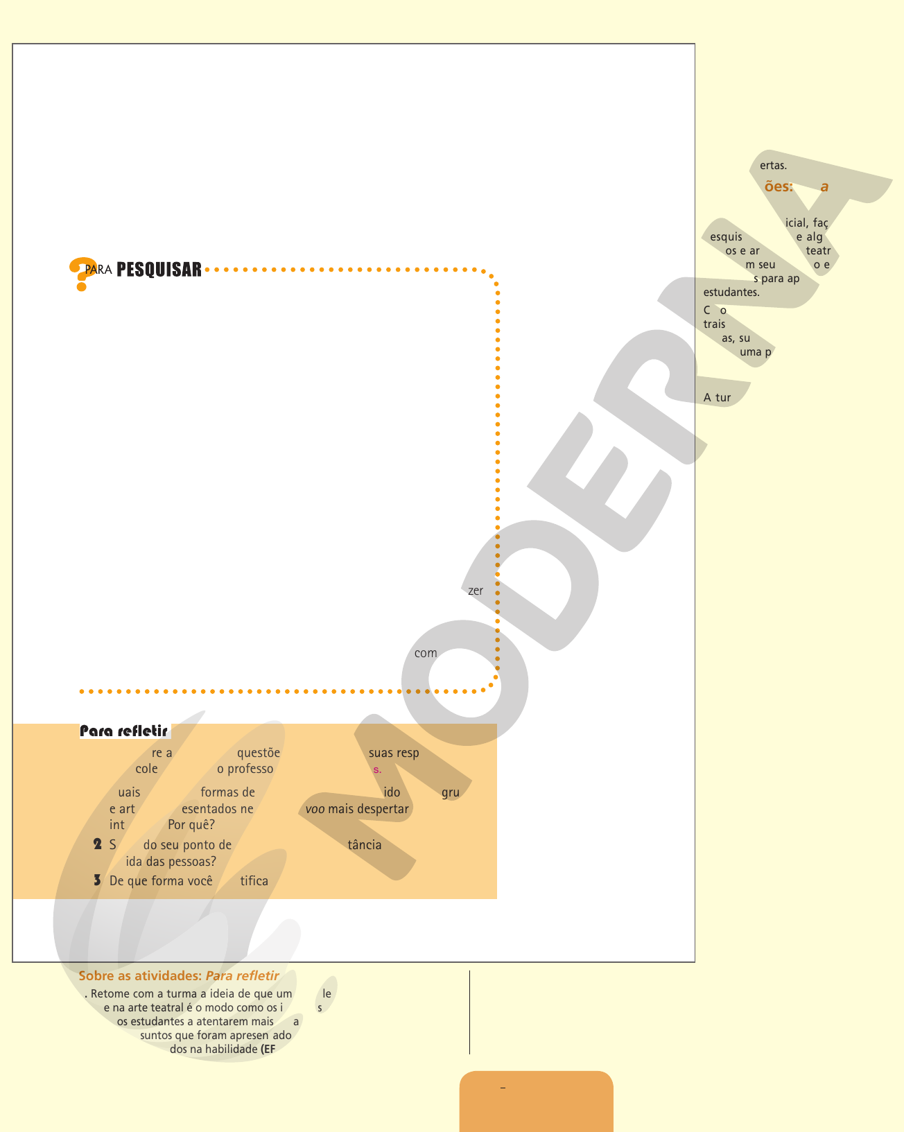 873o BIMESTRE GRUPOS TEATRAIS E ARTISTAS AO REDOR 1 Reúna-se com seus colegas em um grupo. 2 Ao longo de alguns dias, cada grupo pesquisará coletivos ou artistas de teatro que estão em atividade na sua cidade ou perto dela. 3 Cada grupo elegerá um coletivo teatral ou um artista para aprofundar sua pesquisa e escolherá uma ou mais opções entre as sugeridas abaixo: a) Assistir a alguma peça do coletivo ou artista que esteja em cartaz e escrever sobre ela. b) Entrevistar o coletivo ou artistas pessoalmente, por telefone ou por e-mail. c) Realizar uma pesquisa na internet a respeito da história do coletivo ou do artista. 4 Algumas perguntas que podem orientar a pesquisa são: a) Qual é a história/trajetória do coletivo ou artista? b) Por quais motivos o coletivo ou o artista escolhido começou a fazer teatro? c) Qual é o objetivo desse coletivo ou artista ao fazer teatro? 5 Após a realização da pesquisa, monte uma apresentação para compartilhar o material coletado com o restante da turma. Vimos que há muitos motivos que podem instigar as pessoas a fazer teatro: a vontade de divertir a si mesmo e aos outros, de inventar histórias, de dar vida a objetos e também de realizar intervenções em espaços públicos. O teatro é, portanto, uma arte em que o “eu” pode se expandir em muitos outros “eus” e oferecer criações e reflexões sobre a nossa própria vida e a nossa condição no mundo. Reflita sobre as seguintes questões e compartilhe suas respostas com os colegas e com o professor. 1 Quais espaços e formas de contar histórias escolhidos pelos grupos e artistas apresentados neste Sobrevoo mais despertaram o seu interesse? Por quê? 2 Segundo seu ponto de vista, qual é a importância do teatro para a vida das pessoas? 3 De que forma você identifica a presença do teatro em sua vida? Respostas pessoais. 87 R ep ro du çã o pr oi bi da . A rt. 1 84 d o C ód ig o P en al e L ei 9 .6 10 d e 19 d e fe ve re iro d e 19 98 . Orientações Após a imersão no Sobrevoo, retome com os estudantes o questionamento inicial da se- ção: “Você consegue imaginar por que as pessoas fazem tea- tro?”. Aproveite para discutir quais novas possibilidades fo- ram descobertas. Orientações: Para pesquisar No momento inicial, faça uma pesquisa prévia de alguns co- letivos e artistas de teatro que atuam em seu entorno e traga referências para apresentar aos estudantes. Caso não existam coletivos tea- trais acessíveis em regiões pró- ximas, sugerimos que você or- ganize uma pesquisa virtual so- bre alguns coletivos do estado no qual a escola está inserida. A turma poderá apresentar o material coletado por meio de painéis ou seminários. Caso jul- gue conveniente, organize uma visita desses artistas ou coletivos de teatro à escola, para uma conversa com os estudantes. Sobre as atividades: Para refletir 1. Retome com a turma a ideia de que um dos elementos fundamentais no jogo e na arte teatral é o modo como os improvisos são realizados. Assim, in- centive os estudantes a atentarem mais para a forma do que necessariamen- te para os assuntos que foram apresentados, tendo em vista os elementos de linguagem envolvidos na habilidade (EF69AR26) da BNCC. 2. Essa pergunta pode ser desdobrada a partir do relato de artistas que os estudantes recolheram ao longo de sua investigação na seção Para pesquisar. 3. Caso o estudante ainda se mostre indiferente à presença do teatro em sua vida, retome com ele a conexão estabelecida no começo do capítulo entre teatro, jogo e brincadeira, de modo que fique claro que, vez ou outra, todos improvisamos e brincamos de faz de conta. 88 TEATRO na janela. Direção: Iarlei Rangel. Interpretação: Grupo Esparrama. São Paulo (SP), 2018. O teatro de animação, também conhecido como teatro de formas animadas, é uma modalidade que tem como principal característica a possibilidade de dar vida a objetos inanimados. Essa manifestação artísti ca permite que diversos materiais possam servir ao jogo teatral, além das máscaras e dos bone- cos. O limite depende da imaginação e criatividade dos ar- tistas envolvidos. Assim, o ser humano e seus movimentos são fundamentais para que esse tipo de teatro aconteça: por exemplo, os manipuladores podem usar uma máscara, ou se vestir de preto, ou se esconder debaixo de uma mesa para ani- mar os bonecos ou até mesmo dar vida a pedras, livros, panos e sacolas de plástico. Nesse teatro, o movimento é a base da animação. Por isso, o ator (manipulador, bonequeiro, brincante etc.) é o principal responsável pela qualidade da animação dos objetos. Quanto Teatro de animação no... S IS S Y E IK O 88 R ep ro du çã o pr oi bi da . A rt. 1 84 d o C ód ig o P en al e L ei 9 .6 10 d e 19 d e fe ve re iro d e 19 98 . Unidade temática da BNCC Teatro. Objetos de conhecimento: Contextos e práticas; Elemen- tos da linguagem; Processos de criação. Habilidade em foco nesta seção: (EF69AR25) Identificar e ana- lisar diferentes estilos cênicos, contextualizando-os no tempo e no espaço de modo a aprimo- rar a capacidade de apreciação da estética teatral. (EF69AR26) Explorar diferentes elementos envolvidos na com- posição dos acontecimentos cênicos (figurinos, adereços, ce- nário, iluminação e sonoplastia) e reconhecer seus vocabulários. (EF69AR29) Experimentar a gestualidade e as construções corporais e vocais de maneira imaginativa na improvisação te- atral e no jogo cênico. Orientações Como modo de identificar e analisar o estilo cênico do tea- tro de animação, e contemplan- do a habilidade (EF69AR25) da BNCC, experimente fazer com os estudantes uma leitura da imagem apresentada do espe- táculo do Grupo Esparrama: “Como são os bonecos que apa- recem na imagem?”. Chame a atenção para o fato de que suas cabeças são muito gran- des e coloridas e não vemos o restante de seu corpo. Um dos objetivos é ocultar o corpo dos manipuladores, fazendo com que o público t