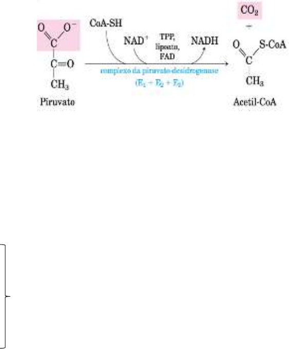 Ciclo do Ácido Cítrico Ciclo de Krebs/ Ciclo dos ácidos tricarboxílicos - É uma via metabólica que acontece apenas na presença de oxigênio (Aeróbica) - Fase aeróbica do catabolismo (onde tem oxigênio) → corresponde a Respiração – captação de O2 eliminação de CO2 - Ocorre a oxidação de biomoléculas Produção de Acetil-CoA - A molécula de Acetil-CoA pode vir da degradação de carboidratos (glicose → piruvato → Acetil-Coa), como também de aminoácidos e ácidos graxos (gorduras) - Primeiro estágio é a produção de Acetil CoA - Segundo estágio oxidação do ácido cítrico (acetil-CoA) Obs: a produção de Acetil-CoA não faz parte do ciclo. Ela é produzida a partir de uma molécula de piruvato (produto final da via glicolítica) e mais 5 cofatores/ coenzima (CoA-SH, NAD+, TPP, lipoato e FAD) originando uma molécula de Acetil-Coa e a liberação de CO2. Além de liberar CO2 também irá liberar NADH Reações do Ciclo do Ácido Cítrico 1. Formação do citrato; 2. Formação de isocitrato via cis-aconitato; 3. Oxidação do isocitrato a α-cetoglutarato e CO2; 4. Oxidação do α-cetoglutarato a succinil- CoA e CO2; 5. Conversão de succinil-CoA a succinato; 6. Oxidação do succinato a fumarato; 7. Hidratação do fumarato a malato; 8. Oxidação do malato a oxaloacetato O X ID A Ç Ã O 1. Formação do citrato - Actetil-CoA reage com Oxaloacetato sendo transformado em Citrato (pela enzima Citrato-Sintase que é inibida pelo seu produto, o Citrato e a disponibilidade de substrato - oxalacetato e acetil-CoA - que é outro regulador. Quanto maior quantidade substrato mais ativo a enzima está) 2. Formação de isocitrato via cis-aconitato - Essa reação vai passar por um intermediário que é o Cis-Aconitato Obs: o substrato da reação é sempre o produto da reação anterior - Ocorre uma isomeria (modificação na estrutura da molécula – o H troca de posição com o HO) na molécula, para isso uma molécula de H2O sai, sofrendo uma desidratação formando o intermediário cis- aconitato, para em seguida ser hidratada e isomerizada formando o isocitrato 3. Oxidação do isocitrato a α-cetoglutarato e CO2 - O isocitrato é descarboxilado (descarboxilação oxidativa irreversível, que é a remoção de CO2), liberando CO2 e é gerado NADH devido a desidrogenação (eliminação de Hidrogênio) - Essa é a etapa limitante da velocidade do ciclo do acido cítrico, a enzima isocitrato desidrogenase é ativada por ADP e Ca2+ e inibida por ATP e NADH (pois possui riqueza energética não necessitando de mais energia assim será inibido) 4.Oxidação do α- cetoglutarato a succinil-CoA e CO2 - Ocorre outra descarboxilação oxidativa, liberando CO2 e NADH Substrato Enzima Intermediário Enzima produto Isocitrato Isocitrato Desidrogenase α-cetoglutarato Citrato Aconitase Aconitase Cis-aconitato Isocitrato - α-cetoglutarato é transformado em Succinil- CoA - Inibido por seus produtos (succinil-CoA) e ativado por Ca2+ 5. Conversão de succinil-CoA a succinato - Produção de GTP que é energeticamente interconversível em ATP - Fosforilação em nível de substrato (formação de GTP) - Succinil-CoA é transformado pela enzima Succinil-CoA sintetase em Succinato 6. Oxidação do succinato a fumarato - Reação de desidrogenação, produzindo FADH2 (transportador temporário de elétrons) - Succinato sofre desidrogenação e é formado o fumarato 7. Hidratação do fumarato a malato - O fumarato é hidratado (recebe H2O) pela enzima Fumarase formando o L-Malato 8. Oxidação do malato a oxaloacetato - O L-Malato sofre uma desidrogenação pela enzima malato desidrogenase formando oxaloacetato - Ocorre a formação do terceiro e último NADH α-cetoglutarato Complexo da α-cetoglutarato desidrogenase Succinil-CoA → RESUMINDO Produtos de uma rodada do Ciclo do Ácido Cítrico - Três moléculas de NADH – Oxidado pela cadeia transportadora de elétrons (3 ATPs cada). - Uma de FADH2 –Gera dois ATPs. - Uma de GTP (ATP) - Duas de CO2 Obs: 1º NADH → 3. Oxidação do isocitrato a α- cetoglutarato e CO2 1º CO2 → 3. Oxidação do isocitrato a α- cetoglutarato e CO2 2º NADH → 4. Oxidação do α- cetoglutarato a succinil-CoA e CO2) 2º CO2 → 4. Oxidação do α-cetoglutarato a succinil-CoA e CO2 GTP → 5. Conversão de succinil-CoA a succinato FADH2 → 6. Oxidação do succinato a fumarato 3º NADH → 8. Oxidação do malato a oxaloacetato Reações do ciclo do ácido cítrico Pivô do metabolismo intermediário - O ciclo do ácido cítrico/ Ciclo de Krebs é uma via Anfibólica pois participa tanto do catabolismo (catabolismo oxidativo (degradação) de carboidratos, ácidos graxos e aminoácidos) como do Anabolismo (que são as vias de síntese ex: gliconeogênese/ formação de precursores) - O ciclo é inibido quando os intermediários saem desse ciclo, para servir de precursores para vias anabólicas. Portanto, é necessário as reações Anapleróticas, que são reações de reposição dos intermediários (oxalacetato e malato) para que o ciclo não seja inibido. Regulação do ciclo do ácido cítrico Produção de acetil-CoA (pelo complexo piruvato desidrogenase): - ATP, acetil-CoA, NADH, e Ácidos graxos; (inibem) - AMP, CoA, NAD+ e Ca2+ (estimulam) - Modificação covalente de proteínas (inibem) Etapas exergônicas (são catalisadas pelas enzimas): - Citrato-sintase - Isocitrato-desidrogenase; - Alfa-cetoglutarato-desidrogenase (são estimuladas pela disponibilidade de substrato e Ca2+ e inibidos pelos produtos)
