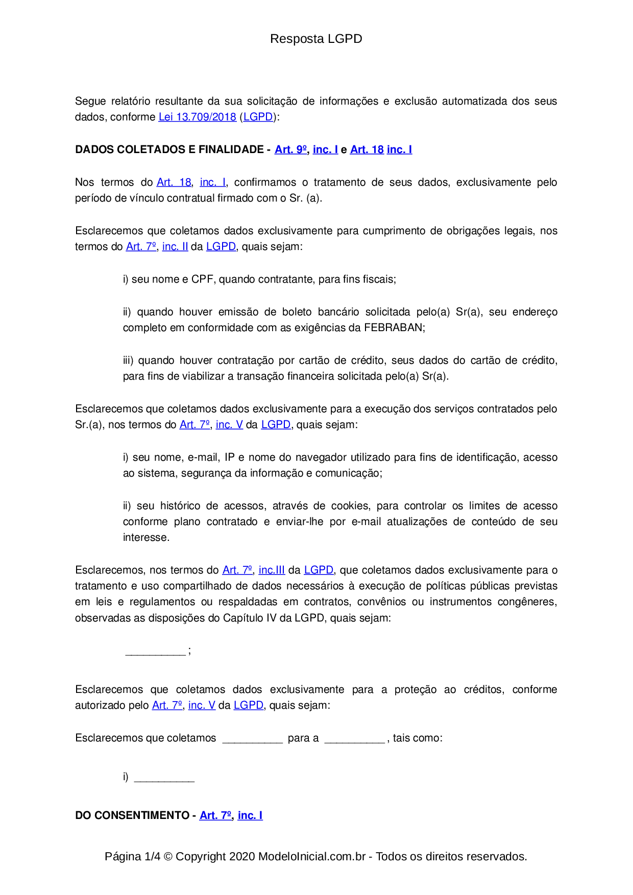 Resposta LGPD Segue relatório resultante da sua solicitação de informações e exclusão automatizada dos seus dados, conforme Lei 13.709/2018 (LGPD): DADOS COLETADOS E FINALIDADE Art. inc. e Art. 18 inc. Nos termos do Art. inc. confirmamos o tratamento de seus dados, exclusivamente pelo período de vínculo contratual firmado com o Sr. (a). Esclarecemos que coletamos dados exclusivamente para cumprimento de obrigações legais, nos termos do Art. inc. da LGPD, quais sejam: i) seu nome e CPF, quando contratante, para fins fiscais; ii) quando houver emissão de boleto bancário solicitada pelo(a) Sr(a), seu endereço completo em conformidade com as exigências da iii) quando houver contratação por cartão de crédito, seus dados do cartão de crédito, para fins de viabilizar a transação financeira solicitada pelo(a) Sr(a). Esclarecemos que coletamos dados exclusivamente para a execução dos serviços contratados pelo Sr.(a), nos termos do Art. inc. V da LGPD, quais sejam: i) seu nome, e-mail, IP e nome do navegador utilizado para fins de identificação, acesso ao sistema, segurança da informação e comunicação; ii) seu histórico de acessos, através de cookies, para controlar os limites de acesso conforme plano contratado e enviar-lhe por e-mail atualizações de conteúdo de seu interesse. Esclarecemos, nos termos do Art. inc.III da LGPD, que coletamos dados exclusivamente para o tratamento e uso compartilhado de dados necessários à execução de políticas públicas previstas em leis e regulamentos ou respaldadas em contratos, convênios ou instrumentos congêneres, observadas as disposições do Capítulo IV da LGPD, quais sejam: ; Esclarecemos que coletamos dados exclusivamente para a proteção ao créditos, conforme autorizado pelo Art. inc. V da LGPD, quais sejam: Esclarecemos que coletamos para a tais como: i) DO CONSENTIMENTO Art. inc. Página 1/4 Copyright 2020 Modelolnicial.com.br Todos os direitos reservados.