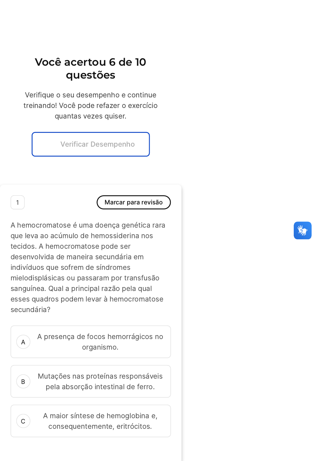 Você acertou 6 de 10 questões Verifique o seu desempenho e continue treinando! Você pode refazer o exercício quantas vezes quiser. Verificar Desempenho A B C 1 Marcar para revisão A hemocromatose é uma doença genética rara que leva ao acúmulo de hemossiderina nos tecidos. A hemocromatose pode ser desenvolvida de maneira secundária em indivíduos que sofrem de síndromes mielodisplásicas ou passaram por transfusão sanguínea. Qual a principal razão pela qual esses quadros podem levar à hemocromatose secundária? A presença de focos hemorrágicos no organismo. Mutações nas proteínas responsáveis pela absorção intestinal de ferro. A maior síntese de hemoglobina e, consequentemente, eritrócitos. D E Pelo aumento na quantidade de hemácias degradadas. O aumento na síntese de porfirinas. Resposta correta Parabéns, você selecionou a alternativa correta. Confira o gabarito comentado! Gabarito Comentado A hemocromatose secundária pode ocorrer em indivíduos que sofrem de síndromes mielodisplásicas ou que passaram por transfusão sanguínea devido ao aumento na quantidade de hemácias degradadas. Quando as hemácias são degradadas, o ferro que elas contêm é liberado. Se o corpo não consegue processar e remover esse ferro adequadamente, ele pode se acumular nos tecidos na forma de hemossiderina, levando à hemocromatose. 2 Marcar para revisão Os pigmentos derivados da hemoglobina podem ser ferruginosos ou não ferruginosos, a depender da presença de íons de ferro na molécula. A seguir, estão alguns exemplos de pigmentações patológicas derivadas da hemoglobina. Assinale a alternativa que apresenta somente pigmentos ferruginosos: A B C D E Porfirias e Hematinose Hemossiderose e Icterícia Hemocromatose e Porfirias Pigmentação ligada a hematoidina e Hemocromatose Hemossiderose e Hematinose Resposta correta Parabéns, você selecionou a alternativa correta. Confira o gabarito comentado! Gabarito Comentado Ambos são pigmentos ferruginosos, ou seja, derivados da hemoglobina e contêm íons de ferro em sua composição. A Hemossiderose é uma condição que ocorre quando há excesso de ferro no corpo, levando ao acúmulo de um pigmento chamado hemossiderina nos tecidos. Já a Hematinose é uma condição rara caracterizada pela presença de hemoglobina modificada, chamada hematin, nos tecidos do corpo. Ambas as condições são exemplos de pigmentações patológicas derivadas da hemoglobina que contêm íons de ferro, portanto, são classificadas como ferruginosas. A B C D E 3 Marcar para revisão A inalação de partículas de carvão pode gerar a pneumoconiose de mineradores de carvão, causando uma série de modificações no interstício pulmonar. Assinale a alternativa que não apresenta uma modificação causada por essa doença: Presença de máculas de carvão e nódulos com fibras de colágeno nos bronquíolos. Fibrose intensa com presença de colágeno e focos de necrose. Enfisema centrolobular com dilatação dos alvéolos próximos. Múltiplas lesões fibróticas com presença de pigmento. Espaços de dilatação no tecido fibroso em padrão de favo de mel. Resposta incorreta Opa! A alternativa correta é a letra E. Confira o gabarito comentado! Gabarito Comentado Esta alternativa não apresenta uma modificação causada pela pneumoconiose de mineradores de carvão. As demais alternativas descrevem alterações típicas dessa doença, como a presença de máculas de carvão e nódulos com fibras de colágeno nos bronquíolos, fibrose intensa com presença de colágeno e focos de necrose, enfisema centrolobular com dilatação dos alvéolos próximos e múltiplas lesões fibróticas com presença de pigmento. No entanto, a formação de espaços de dilatação no tecido fibroso em padrão de favo de mel não é uma característica da pneumoconiose de mineradores de carvão. 4 Marcar para revisão Os metais pesados podem danificar toda e qualquer atividade biológica. O chumbo é um elemento tóxico não essencial que se acumula no organismo. Na sua interação com a matéria viva, o chumbo apresenta tanto características comuns a outros metais pesados quanto algumas peculiaridades. Sobre a intoxicação e a pigmentação por ele gerada, analise as afirmativas. I. O Plumbismo é causado pela intoxicação com o chumbo apenas por via inalatória e acomete principalmente as crianças. II. No sangue periférico, após a distinção sanguínea, o chumbo é verificado nos eritrócitos como grumos brancos. III. O Sistema nervoso central e o tecido hematopoético são os mais afetados por esse depósito, mas os ossos são o primeiro local de depósito. É correto o que se afirma em: A B C D E I. II. III. I e II. II e III. Resposta incorreta Opa! A alternativa correta é a letra C. Confira o gabarito comentado! Gabarito Comentado O chumbo é um metal pesado que pode causar intoxicação, principalmente em crianças. O Sistema nervoso central e o tecido hematopoético são os mais afetados por esse depósito, mas os ossos são o primeiro local de depósito. ----- 5 Marcar para revisão Nevos melanocíticos são neoplasias de natureza benigna. Sobre essa pigmentação endógena, analise as afirmativas a seguir: I. São lesões pequenas e bordas irregulares; II. Apresentam coloração mais escura do que a pele; III. São hereditárias e congênitas. A B C D E É correto o que se afirma em: I. II. III. I e II. II e III. Resposta incorreta Opa! A alternativa correta é a letra B. Confira o gabarito comentado! Gabarito Comentado A alternativa correta é a II. Nevos melanocíticos são, de fato, mais escuros que a pele. As afirmações I e III não são totalmente corretas. Embora os nevos melanocíticos possam ser pequenos, eles não necessariamente têm bordas irregulares. Além disso, nem todos os nevos melanocíticos são hereditários ou congênitos, alguns podem se desenvolver ao longo da vida. 6 Marcar para revisão Na asbestose, as partículas de asbesto in