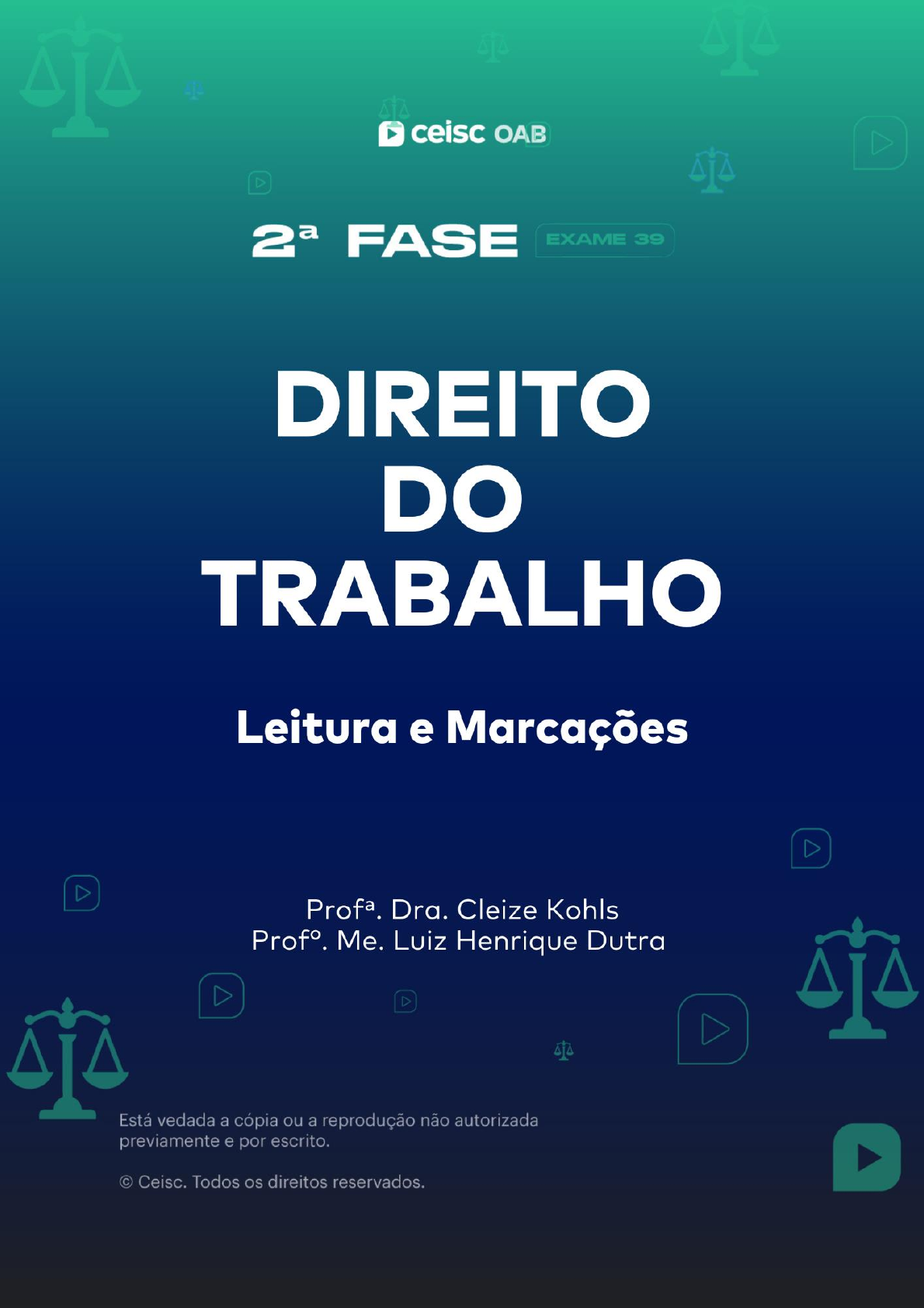 1 2 Olá! Pessoal! Preparamos para vocês um E-book de Leitura e Remissões de Processo do Trabalho e Direito do Trabalho. São as marcações de grau de importância elevada, média e baixa. Esperamos que gostem! Prof. Cleize Kohls @prof.cleizekohls Prof. Luiz Henrique @prof.luiz.henrique 3 2ª FASE OAB | TRABALHO | 39º EXAME Leitura e Marcações Prof.ª Cleize e Prof. Luiz Henrique SUMÁRIO Olá! Boas-Vindas! 2 Processo do Trabalho 4 1.1. Leitura e Marcações de Grau Elevado 4 1.2. Leitura e Marcações de Grau Médio 6 1.3. Leitura e Marcações de Grau Baixo 8 Direito do Trabalho 12 2.1. Leitura e Marcações de Grau Elevado 12 2.2. Leitura e Marcações de Grau Médio 15 2.3. Leitura e Marcações de Grau Baixo 18 Olá, aluno(a). Este material foi pensado e organizado nos artigos, súmulas e OJ’s de maior incidência, classificando-as em 3 níveis: elevado, médio e baixo. Sugere-se que faça o uso deste material após a Mentoria 01: Marcações e remissões: o que pode ou não ser feito, que será ministrada pela Professora Cleize Kohls. Bons estudos, Equipe Ceisc. Atualizado em novembro de 2023. 4 Processo do Trabalho Prof.ª Cleize Kohls @prof.cleizekohls 1.1. Leitura e Marcações de Grau Elevado FUNDAMENTAÇÃO LOCALIZAÇÃO NO ÍNDICE REMISSIVO DA CLT (ler) Art. 114 da CF Competência da Justiça do Trabalho Art. 840 da CLT Reclamação Trabalhista Art. 319 da CPC Petição Inicial Art. 651 da CLT Competência Territorial Art. 294 a 311 do CPC Tutela Provisória Art. 659, IX e X da CLT Liminar Art. 790, §§3º e 4º da CLT Justiça Gratuita Art. 791-A da CLT Honorários Advocatícios Art. 539 do CPC Ação de Consignação em Pagamento Art. 855-B até Art. 855-E da CLT Acordo Extrajudicial Art. 853 da CLT Inquérito Judicial para apuração de falta grave Art. 821 da CLT Testemunha Art. 482 da CLT Justa Causa OU Falta Grave Súmula nº 379 do TST Inquérito Judicial para apuração de falta grave Art. 5º, LXIX da CF Mandado de Segurança Súmula nº 414 do TST Mandado de Segurança OJ 98 SDI-2 Mandado de Segurança Art. 836 da CLT Ação Rescisória Art. 966 do CPC Ação Rescisória Art. 968 do CPC Ação Rescisória Art. 844 da CLT Audiência Art. 843 da CLT Audiência Art. 775 da CLT Prazo Art. 800 da CLT Exceções Art. 852-A da CLT Sumaríssimo Art. 852-H da CLT Procedimento Sumaríssimo Art. 847 da CLT Contestação Art. 337 do CPC Contestação Art. 330 do CPC Inépcia 5 Art. 485 do CPC* *Está espalhado nos tópicos como: petição inicial, perempção, litispendência, legistimidade, condições da ação... Art. 7º, XXIX da CF Prescrição Art. 11 da CLT Prescrição Art. 5º, LV da CF Cerceamento de Defesa Art. 818 da CLT Prova Art. 825 da CLT Prova Art. 790-B da CLT Perícia Art. 789 da CLT Custas e Emolumentos Art. 790-A da CLT Custas e Emolumentos Súmula nº 303 do TST Recurso Ordinário Art. 893 da CLT Recurso Art. 899, caput, da CLT Depósito Recursal Art. 899 §§ 4º, 9º, 10º, 11 da CLT Depósito Recursal OJ 140 SDI-1 Depósito Recursal Art. 900 da CLT Contrarrazões Art. 895 da CLT Recurso Ordinário Súmula nº 283 do TST Recurso/Recurso Ordinário/Recurso de Revista Art. 897-A da CLT Embargos de Declaração Art. 897, alínea b da CLT Agravo de Instrumento Art. 896, caput, §§ 2º e 10º da CLT Recurso de Revista Art. 896-A da CLT Recurso de Revista Art. 894 da CLT Embargos ao TST Art. 879 da CLT Liquidação de Sentença Art. 876 da CLT Execução Art. 880 da CLT Execução Art. 882 da CLT Execução Art. 883 da CLT Execução Art. 883-A da CLT Banco Nacional de Devedores Trabalhistas Art. 883 da CLT Penhora Art. 835 da CLT Penhora Art. 884 da CLT Embargos à Execução Art. 674 até Art. 681 do CPC Embargos de Terceiro Art. 897, alínea a da CLT Agravo de Petição 6 1.2. Leitura e Marcações de Grau Médio FUNDAMENTAÇÃO LOCALIZAÇÃO NO ÍNDICE REMISSIVO DA CLT (ler) SV. 23 do STF Ação Possessória Súmula nº 363 do STJ Competência da Justiça do Trabalho SV. 22 do STF Competência da Justiça do Trabalho Súmula nº 392 do TST Competência da Justiça do Trabalho Súmula nº 368 do TST Competência da Justiça do Trabalho Art. 842 da CLT Ação Plúrima Art. 542 do CPC Ação de Consignação em Pagamento Art. 544 do CPC Ação de Consignação em Pagamento Art. 546 do CPC Ação de Consignação em Pagamento Art. 495 da CLT Estabilidade Art. 496 da CLT Estabilidade Art. 23 da Lei 12.016/09 Mandado de Segurança Art. 7 da Lei 12.016/09 Mandado de Segurança Súmula nº 100 do TST Ação Rescisória Art. 770 da CLT Ato processual Lei 11.419/06 (Art. 2º, 3º e 10º) Processo Judicial Eletrônico Art. 813 da CLT Audiência Art. 841 da CLT Citação (notificação) Art. 774 da CLT Prazo Art. 775-A da CLT Prazo Art. 801 da CLT Exceções Art. 852-B da CLT Procedimento Sumaríssimo Art. 731 e Art. 732 da CLT Perempção Súmula nº 308 do TST Prescrição Art. 487, II do CPC Prescrição Art. 343 do CPC Reconvenção Art. 820 da CLT Prova Art. 819 da CLT Prova Art. 829 da CLT Prova Art. 447 do CPC Prova Súmula nº 357 do TST Prova Súmula nº 341 do TST Prova Art. 195, §2º da CLT Prova 7 OJ 165 SDI-1 Perícia Súmula nº 12 do TST Ônus da Prova Súmula nº 338 do TST Ônus da Prova Súmula nº 460 do TST Ação Súmula nº 461 do TST Ônus da Prova Art. 794 da CLT Nulidade Art. 795 da CLT Nulidade Art. 796 da CLT Nulidade Art. 797 da CLT Nulidade Art. 798 da CLT Nulidade Súmula nº 427 do TST Nulidade Art. 850 da CLT Audiência Art. 832 da CLT Decisão e sua Eficácia Súmula nº 396 do TST Reintegração Art. 502 do CPC Coisa Julgada Art. 789-A da CLT Custas Súmula nº 214 do TST Recurso Súmula nº 393 do TST Efeito Devolutivo Súmula nº 128 do TST Depósito Recursal Súmula nº 161 do TST Depósito Recursal Súmula nº 245 do TST Depósito Recursal Súmula nº 86 do TST Depósito Recursal Súmula nº 99 do TST Depósito Recursal Súmula nº 383 do TST Mandato Súmula nº 158 do TST Recurso Ordinário Súmula nº 201 do TST Recur
