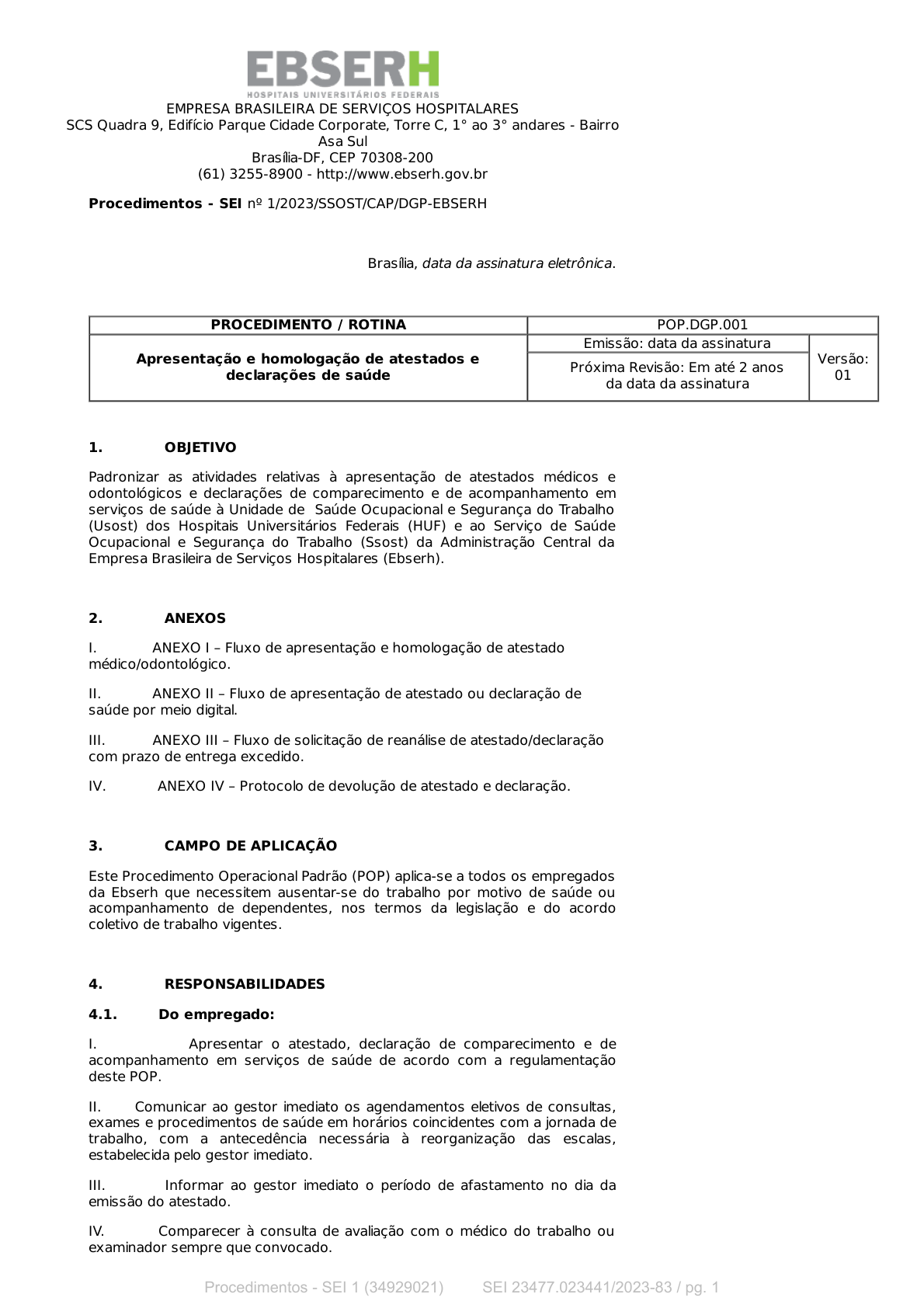 EMPRESA BRASILEIRA DE SERVIÇOS HOSPITALARES SCS Quadra 9, Edifício Parque Cidade Corporate, Torre C, 1° ao 3° andares - Bairro Asa Sul Brasília-DF, CEP 70308-200 (61) 3255-8900 - http://www.ebserh.gov.br Procedimentos - SEI nº 1/2023/SSOST/CAP/DGP-EBSERH Brasília, data da assinatura eletrônica. PROCEDIMENTO / ROTINA POP.DGP.001 Apresentação e homologação de atestados e declarações de saúde Emissão: data da assinatura Versão: 01Próxima Revisão: Em até 2 anos da data da assinatura 1. OBJETIVO Padronizar as atividades relativas à apresentação de atestados médicos e odontológicos e declarações de comparecimento e de acompanhamento em serviços de saúde à Unidade de Saúde Ocupacional e Segurança do Trabalho (Usost) dos Hospitais Universitários Federais (HUF) e ao Serviço de Saúde Ocupacional e Segurança do Trabalho (Ssost) da Administração Central da Empresa Brasileira de Serviços Hospitalares (Ebserh). 2. ANEXOS I. ANEXO I – Fluxo de apresentação e homologação de atestado médico/odontológico. II. ANEXO II – Fluxo de apresentação de atestado ou declaração de saúde por meio digital. III. ANEXO III – Fluxo de solicitação de reanálise de atestado/declaração com prazo de entrega excedido. IV. ANEXO IV – Protocolo de devolução de atestado e declaração. 3. CAMPO DE APLICAÇÃO Este Procedimento Operacional Padrão (POP) aplica-se a todos os empregados da Ebserh que necessitem ausentar-se do trabalho por motivo de saúde ou acompanhamento de dependentes, nos termos da legislação e do acordo coletivo de trabalho vigentes. 4. RESPONSABILIDADES 4.1. Do empregado: I. Apresentar o atestado, declaração de comparecimento e de acompanhamento em serviços de saúde de acordo com a regulamentação deste POP. II. Comunicar ao gestor imediato os agendamentos eletivos de consultas, exames e procedimentos de saúde em horários coincidentes com a jornada de trabalho, com a antecedência necessária à reorganização das escalas, estabelecida pelo gestor imediato. III. Informar ao gestor imediato o período de afastamento no dia da emissão do atestado. IV. Comparecer à consulta de avaliação com o médico do trabalho ou examinador sempre que convocado. Procedimentos - SEI 1 (34929021) SEI 23477.023441/2023-83 / pg. 1 V. Monitorar o registro de atestados e declarações homologados em sua frequência, no Portal do Trabalhador . VI. Solicitar, junto à Unidade de Administração de Pessoal (Uap), o cadastro de dependente, nos termos do Acordo Coletivo de trabalho (ACT) vigente, no sistema de gestão de pessoas. VII. Comparecer para exame de retorno ao trabalho após afastamento por motivo de saúde por período igual ou superior a 30 (trinta) dias. 4.2. Da Usost: I. Receber o atestado, declaração de comparecimento e de acompanhamento em serviços de saúde e seguir os procedimentos necessários à homologação, registro e demais encaminhamentos. II. Manter protocolo de registro de confirmação de recebimento de atestados e declarações, bem como de devolução daqueles em desacordo com o estabelecido neste POP. III. Realizar o registro de atestados e declarações no sistema de gestão de pessoas em período hábil à homologação da folha de frequência. IV. Convocar, para exame de retorno ao trabalho, o empregado afastado por motivo de saúde por período igual ou superior a 30 (trinta) dias. 4.3. Da Uap: I. Realizar o cadastro dos dependentes no sistema de gestão de pessoas, mediante solicitação de empregado, observadas as diretrizes do ACT vigente. II. Realizar ajustes na programação de férias dos empregados afastados por motivo de saúde, quando necessário e mediante solicitação da Usost, via processo Sei. 4.4. Do gestor imediato: I. Monitorar o registro de homologação de atestados e declarações na frequência do empregado sob sua gestão, principalmente no período de homologação da folha de frequência. II. Encaminhar para exame de retorno ao trabalho junto à Usost, o empregado afastado por motivo de saúde por período igual ou superior a 30 (trinta) dias. III. Estabelecer o período mínimo de antecedência de comunicação de agendamentos eletivos de consultas, exames e procedimentos de saúde. 5. DADOS QUE DEVERÃO CONSTAR NOS DOCUMENTOS COMPROBATÓRIOS 5.1. Atestado médico ou odontológico I. Nome, timbre e endereço do estabelecimento de Saúde; II. Nome completo do empregado; III. Período (dias) concedido de dispensa da atividade laboral, necessário para a recuperação do paciente; IV. Cid, preferencialmente; V. Local e data da emissão; VI. Nome, número do registro profissional no conselho de classe, assinatura e carimbo do profissional ou assinatura digital. 5.2. Declarações de comparecimento em serviço de saúde I. Nome, timbre e endereço do estabelecimento de Saúde; II. Nome completo do empregado; III. Descrição do motivo do atendimento; Procedimentos - SEI 1 (34929021) SEI 23477.023441/2023-83 / pg. 2 IV. Período de atendimento (matutino, vespertino, noturno ou horário inicial e final); V. Local e data da emissão; VI. Assinatura e carimbo da recepção do estabelecimento de saúde ou; VII. Nome, registro profissional no conselho de classe, assinatura e carimbo ou assinatura digital do profissional que realizou o atendimento. 5.3. Declaração de acompanhamento em serviços de saúde I. Nome, timbre e endereço do estabelecimento de Saúde; II. Nome completo do dependente que necessitou do acompanhamento; III. Nome completo do empregado acompanhante; IV. Descrição do motivo do atendimento; V. Período do atendimento (matutino, vespertino, noturno ou horário inicial e final); VI. Local e data da emissão; VII. Assinatura e carimbo da recepção do estabelecimento de saúde ou; VIII. Nome, registro profissional no conselho de classe, assinatura e carimbo ou assinatura digital do profissional que realizou o atendimento. 6. DA APRESENTAÇÃO DE ATESTADOS E DECLARAÇÕES 6.1. Da modalidade 