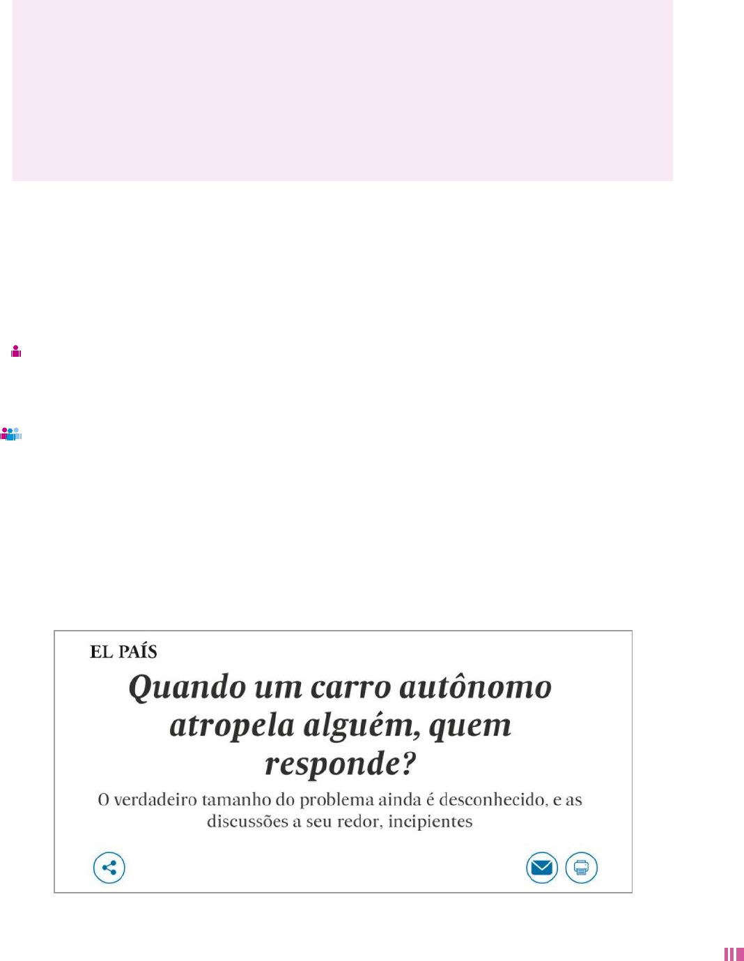 Conforme você pôde verifi car em sua pesquisa, as “quatro leis da robótica” são: Lei Zero: Um robô não pode causar mal à humanidade ou, por omissão, permitir que a humanidade sofra algum mal. 1ª Lei: Um robô não pode ferir um ser humano ou, por inação, permitir que um ser huma- no sofra algum mal. 2ª Lei: Um robô deve obedecer às ordens que lhe forem dadas por seres humanos, exceto nos casos em que tais ordens entrem em confl ito com a Primeira Lei. 3ª Lei: Um robô deve proteger a própria existência desde que tal proteção não entre em confl ito com a Primeira ou a Segunda Leis. Essas “leis da robótica” surgiram em livros de fi cção científi ca do escritor estadunidense Isaac Asimov (1920-1992) e buscam embasar em princípios éticos as ações dos robôs perso- nagens de suas histórias. Portanto, elas não fazem parte da legislação de nenhum país e não existe uma obrigatoriedade de serem cumpridas, mesmo porque as leis são feitas para que os humanos as cumpram, e não os robôs. Mesmo assim, será que as leis da robótica podem ser diretrizes importantes para resolver questões éticas nas relações entre seres humanos e robôs androides como Sophia? Vamos refl etir sobre o assunto? 1. Você considera que as leis da robótica podem ajudar a mediar confl itos reais que vêm sur- gindo com a presença cada vez maior de equipamentos com inteligência artifi cial em nos- so dia a dia e no mundo do trabalho? Como? Lembre-se de anotar suas respostas em seu Registro de bordo. 2. Reúna-se com mais dois colegas, escolham uma das quatro leis da robótica e pensem em um confl ito ético envolvendo relações entre robôs e humanos. Com base nesse confl ito hi- potético, deem um exemplo de uma decisão do(s) robô(s) envolvido(s) que respeite a lei escolhida por vocês e outro em que ela seria desrespeitada. No bonde do dilema Na atividade anterior, você e seus colegas pensaram em exemplos e contraexemplos em que as leis clássicas da robótica poderiam ser aplicadas. Mas será que há situações em que elas entrariam em confl ito? Veja o exemplo da manchete da reportagem a seguir. R e p ro d u ç ã o /h tt p s :/ /b ra s il. e lp a is .c o m ROBERTO, E.; LOPES, M. F. Quando um carro autônomo atropela alguém, quem responde? El Pa’s. Disponível em: https://brasil.elpais.com/brasil/2018/04/16/tecnologia/1523911354_957278.html. Acesso em: 21 jan. 2020. 19 PI_CIE_Candido_g21Sa_Projeto1_012a047_LA.indd 19PI_CIE_Candido_g21Sa_Projeto1_012a047_LA.indd 19 2/26/20 9:30 AM2/26/20 9:30 AM Essa manchete está muito associada ao questionamento “Será que todo mundo fi caria confortável, por exemplo, andando em um carro sem o motorista [dirigido por um robô]? Em caso de um acidente, quem seria responsabilizado?”, feito por um pesquisador e presen- te no texto da seção Leituras deste nosso lugar. Você já pensou sobre o assunto? 3. Para refl etir sobre como as leis da robótica podem entrar em confl ito, considere o caso a seguir. Uma pessoa está passeando em seu carro dirigido por um robô, cujo funcionamento baseia-se em inteligência artifi cial. Repentinamente, uma criança atravessa a rua correndo na frente do carro; porém, o robô-motorista não consegue parar devido a uma falha no freio do veículo autô- nomo. O que o robô-motorista deve fazer? Se continuar em frente, o carro atropelará a criança, que provavelmente não sobreviverá. Uma opção é ele virar bruscamente à esquerda, porém atropelará e colocará em risco a vida de cinco pessoas que estão no ponto de ônibus, além de fi car totalmente destruído. Outra opção é o carro autônomo desviar para a direita, porém baterá em um poste e possivelmente o passageiro do carro não sobreviverá e o robô-motorista acabará destruído com o impacto. Após ler o texto, refl ita sobre as questões abaixo e as responda: Respostas no Manual do Professor. ■ Você acha que as leis da robótica seriam úteis para a tomada de decisão do robô-moto- rista ou haveria um “confl ito lógico” entre elas? Por quê? ■ E se o dono do carro ordenasse que o robô-motorista realizasse uma das três opções e ele o obedecesse, o robô-motorista estaria violando alguma das quatro leis? ■ Mas e se, mesmo com o dono do carro ordenando o que o robô-motorista deveria fazer, o robô-motorista não o obedecesse e tomasse a própria decisão, ele estaria violando al- guma das quatro leis? Você deve ter sentido que, diante de tantas situações e leis, fi ca difícil pensar em todas as possibilidades relacionadas a essas perguntas. Para facilitar essa tarefa, é possível usar es- quemas para a visualização das consequências das opções escolhidas e verifi car se as leis da robótica estariam em confl ito ou sendo violadas. Dois tipos de esquemas usados pelos pro- gramadores de computador para fazer os robôs “raciocinarem” são as denominadas tabela e árvore de decisão. Veja como elas funcionam na prática fazendo as duas atividades a seguir. 4. Diante de uma situação em que pode haver confl ito entre as leis da robótica, é possível avaliá-la por meio de uma tabela de decisão ou de uma árvore de decisão. A seguir, você vai utilizar esses dois recursos para resolver a situação descrita na questão anterior. Tabela de decisão Usando uma tabela de decisão como a apresentada na próxima página, você deve reler a história e, em seguida: ■ Analisar, para cada uma das opções do robô-motorista mostrada na tabela, se a lei é vio- lada e/ou se entra em confl ito com outras leis. ■ Escolher se o robô deve realizar ou não a respectiva ação de acordo com as seguintes regras: 1. Se nenhuma lei for violada ou não entrar em confl ito com outra, o robô-motorista deve realizar a ação. 2. Caso alguma lei seja violada, o robô-motorista não deve executar a ação. ■ Assinalar X no S (sim) ou no N (não) para cada decisão que for tomada com base na análise anterior. Vej