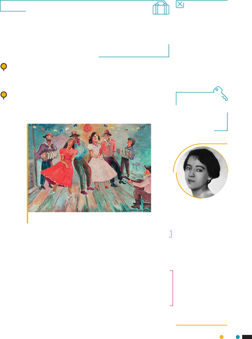 6 9CAPÍTULO 2 3 Nas pinturas de gênero, a figura humana é mostrada em contextos domésticos e cotidianos. Converse com os colegas e o professor: Que práticas corporais estão relacionadas a esses contextos? 4 A figura humana não aparece apenas na pintura de gênero. Pelo contrário, esse é um motivo recorrente nas artes visuais, retomado em obras dos mais variados períodos e estilos, independentemente de gêneros e categorizações. Observe a pintura de Anita Malfatti a seguir. Observe o espaço, a decoração, os instrumentos musicais, as vestimentas e os movimentos corporais das personagens retratadas. a) Qual é a situação retratada na obra? Descreva destacando todos os elementos que você conhece e percebe. b) A obra mostra corpos em movimento, dançando. Qual é o estilo de dança que aparece na obra? c) O que você conhece sobre essa manifestação? d) Você já participou desse tipo de manifestação? Compartilhe com os colegas. e) Há, na pintura, dois casais que dançam em posição central. Que elementos da obra permitem identificar essa interação? f) Observe a expressão corporal das personagens. Que movimentos estão sendo executados? g) Que tal reproduzir a ação das personagens da pintura com o próprio corpo? Com os colegas, procure reproduzir os movimentos observados na pintura. Festa junina, de Anita Malfatti, c. 1940 (óleo sobre tela, 47 cm × 33,5 cm – Coleção particular). Autoria desconhec id a/ Ac er vo d a ar tis ta ANITA CATARINA MALFATTI (1889-1964) nasceu na cidade de São Paulo. Começou a pintar em 1909 e realizou vários estudos na Europa e nos Estados Unidos. Em 1917, tornou-se conhecida por causa da polêmica em torno da exposição que foi alvo de críticas de Monteiro Lobato. Expôs na Semana de 1922, mas não aderiu totalmente aos ideais modernistas. Entre algumas de suas principais obras, destacam-se O homem amarelo (1917), A boba (1915- 1916), O homem de sete cores (1915-1916), A estudante russa (1915), O japonês (1915), O farol de Monhegan (1915) e Retrato de Fernanda de Castro (1922). NÃO ESCREVA NESTE LIVRO. BAGAGEM As obras A arte da pintura, de Johannes Vermeer, e O importuno, de Almeida Júnior, podem ser classificadas como exemplos de pintura de gênero. Esse gênero pictórico ganhou força na pintura holandesa, no século XVII, e foi explorado por alguns pintores acadêmicos brasileiros principalmente nos séculos XIX e XX. Caracteriza-se principalmente pelos temas das pinturas, que mostram pessoas em cenas domésticas e cotidianas, realizando ações relacionadas ao trabalho ou à vida íntima. Figurativas, as obras perseguem o ideal da imitação, procurando fazer um registro fiel do que o olho humano é capaz de captar. R ep ro du çã o/ C ol eç ão p ar tic ul ar Resposta pessoal. Incentive os estudantes a citar práticas cor- porais de caráter instrumental, relacionadas às obrigações labo- rais, domésticas e higiênicas, por exemplo. Mais à frente, essas práticas serão comparadas às práticas corporais próprias da Educação Física, vinculadas ao lazer e ao entretenimento, ao cuidado com o corpo e à saúde. 4. f) A expressão corporal dos per- sonagens evidencia a execução de dança (o mover dos pés, das mãos, a movimentação dos casais e o ba- lançar dos vestidos); o manuseio de instrumentos musicais (a postu- ra e o movimento dos braços dos sanfoneiros, além da posição do tocador da viola – sentado, com o instrumento apoiado sobre pernas e os braços em posição de quem executa os acordes). 4. e) É comum, nas festas juninas, a dança ser conduzida por casais. Na pintura, notamos isso por meio da proximidade corporal, da inclinação dos corpos, da maneira como são retratados os pés e as mãos (um pé mais no alto que ou- tro, a posição deles; as mãos para trás como ocorre nas quadrilhas) e dos olhares trocados. 4. a) Os estudantes deverão perceber que a temática da obra é uma festa junina, como revela o título. As bandeirolas, o balão, as roupas características, a maquiagem das personagens, os adereços no cabelo de uma das moças, os instrumentos musicais, os toca- dores, a dança em pares e ainda a posição das personagens que sinaliza uma roda de dança são alguns dos elementos que podem ser apontados. Provavelmente, uma dança realizada em duplas, podendo variar de cordo com a região do país: quadrilha, xote, forró, xaxado, rastapé, baião, entre outros. 4. c) Resposta pessoal. Estimule a dis- cussão entre os estudantes e que compartilhem o que sabem sobre as danças típicas de festa junina. Depois que os estudantes trocarem ideias, você pode contribuir, mencionan- do se tratar de uma manifestação cultural, de um festejo no qual a dança é uma das formas de expressão, ao lado de outras como a música e a culinária. 1. d) 4. g) Use a pintura como ponto de partida, mas se baseie no levantamento realizado com os estudantes para avaliar a prática que os deixa mais confortáveis. O objetivo é que eles possam apreciar e fruir em uma prática que já dominam. Resposta pessoal. Estimule a discussão entre a turma. V5_LINGUAGENS_Faccioli_g21At_Cap2_055a088_LA.indd 69V5_LINGUAGENS_Faccioli_g21At_Cap2_055a088_LA.indd 69 9/26/20 10:02 AM9/26/20 10:02 AM 7 0 CAPÍTULO 2 5 Agora, observe uma pintura de Vicente do Rego Monteiro (1899-1970). T•nis, Vicente do Rego Monteiro, 1928 (óleo sobre tela, 99 cm × 78,5 cm – Coleção particular). a) Que elementos da obra permitem identificar o esporte que dá título a ela? b) Qual é o tipo de partida mostrada na pintura? Explique. c) Que jogada a personagem feminina está fazendo? 6 Qual é a diferença entre as práticas corporais mos- tradas nas pinturas de Almeida Júnior e Vermeer e as que aparecem nas pinturas de Anita Malfatti e de Vicente do Rego Monteiro? Converse com os cole- gas e o professor. VICENTE DO REGO MONTEIRO (1899-1970) nasceu em Recife (PE). Além de pintor, foi poeta e professor. Iniciou sua formação art