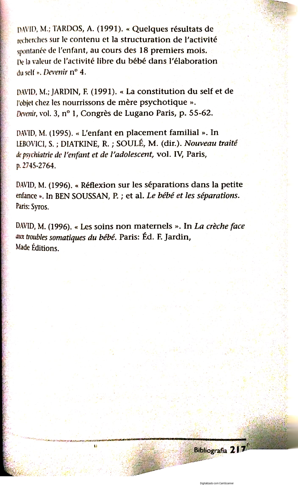 R m PE T e r e DAVID, M.; TARDOS, A. (1991). « Quelques résultats de recherches sur le contenu et la structuration de Vactivité spontanée de Venfant, au cours des 18 premiers mois. De la valeur de Vactivité libre du bébé dans l'élaboration du self ». Devenir nº 4. DAVID, M.; JARDIN, E (1991). « La constitution du self et de Vobjet chez les nourrissons de mêre psychotique ». Devenir, vol. 3, nº 1, Congrês de Lugano Paris, p. 55-62. DAVID, M. (1995). « L'enfant en placement familial ». In LEBOVICI, S. ; DIATKINE, R. ; SOULÉ, M. (dir.). Nouveau traité de psychiatrie de Venfant et de I'adolescent, vol. IV, Paris, p. 2745-2764. DAVID, M. (1996). « Réflexion sur les séparations dans la petite enfance ». In BEN SOUSSAN, P. ; et al. Le bébé et les séparations. Paris: Syros. DAVID, M. (1996). « Les soins non maternels ». In La crêche face aux troubles somatiques du bébé. Paris: Éd. F. Jardin, Made Éditions. tb Digitalizado com CamScanner 6. Videografia PIKLER, E, e sua equipe. 1959, La joie du mouvement. 1966. Le plaisir du bain. 1966. Indépendance — tout seul. 1967. Plus que du jeu. 1969. Moi-même. 1970. La promenade. Coprodução Associação Pikler Lóczy (Hungria) e Associação Pikler Lóczy da França TARDOS, A.; APPEL, G. (1990). De Vattention du bébé au cours des jeux. TARDOS, A.; APPEL, G. (1992). Attentifs Fun à Pautre: le bébé e Vadulte au cours du bain. TARDOS, A.; SZANTO, A. (1994). Se mouvoir en liberte. Instituto Emmi Pikler: dezesseis documentos em vídeo (12 a 29 min.), sem comentários, editados pelo Symposium Européen de Budapeste, 1996. Esses filmes estão disponíveis para compra na Associação Pile Lóczy França ROBERTSON, James et Joyce: 1952. Laura, un enfant de 2 ans va à Vhóôpital. 1958. À WYhópital avec maman. 1967. Kate, 2 ans 5 mois, en famille d'accueil pendant 27 jours. 1968. Jane, 17 mois, en famille d'accueil pendant 10 jours. NETO a om mm mm 218 Maternagem Insólita Digitalizado com CamScanner j i a a a d i i De ad sa d 1969, John, 17 mois, en pouponntêre pendant 9 Jours. p974. Lucy, 21 mois, en famille d'accueil pendant 19 jours. alguns desses vídeos estão disponíveis para compra no seguinte endereço: COPES 2»), Rue de Dantzlg 78015 = Paris - França centre de puériculture et de pedagogie appliquéc : Une autre naissance. pune famille à Vautre. En passant par la pouponniêre. Uenfant: sa famille d'accueil, se parents, 'équipe. Séparation et retrouvailles. Disparition - absence. Absence. Au jeu de la séparation. Todos esses filmes estão disponíveis para compra no seguinte endereço: CPPA Domaine des Chérioux 4 route de Fontainebleau 94407 - Vitry-sur-Seine — França LEMAY, M. Un entretien avec Michel Lemay: Carence affective: du préjudice à la réparation. Colection parole donnée. Prodution Anthéa/TNDI de Chateauvallon/ADSEA du Var, Ressources enfance. a DO e Ei Bibliografia 219 Digitalizado com CamScanner t. Algumas referências complementares por Ocasião da reedição em 2008. ATHANASSIOU, C.; JOUVET, A. (1987). V'enfant et la Creche, Lyon: Césura, col. « L'enfant ». BEN SOUSSAN, P. (dir.). (1996). Parents et bébés séparés. Paris: Syros. BERGER, M. (1992). Les séparations à but thérapeutique. Toulouse: Privat. DELION, P. (dir.). 2001. Le bébé et ses institutions. Toulouse: Érês. DAVID, M.; GIAMPINO, S.; RAPOPPORT, D.; RIGAUX, E; SPIESSER, G. (2000). Accueillir. Toulouse: Erês, col. « 1001 BB, nº 32. DAVID, M. (dir.). Le bébé, ses parents, leurs soignants. Le dossier de Spirale. Toulouse: Érês. DELOUVIN, D. (dir.). (2006). Des psychologues auprês des tout. petits, pour quoi faire? Toulouse: Eres, col. « 1001 BB », nº 77, DUGNAT, M. (dir.). (1997). Le monde relationnel du bébé. Toulouse: Érês. GABEL, M.; LAMOUR, M.; MANCIAUX, M. (dir.). (2005). La protection de Venfance. Maintien, rupture et soins des liens. Paris: Fleurus. GARRIGUE-ABGRALL, M. (2007). Violences en petite enfance, pour une prévention opportune. Toulouse: Érês, col. « 1001 BB», nº 87. HOUZEL, D. (dir.). (1999). Les enjeux de la parentalité. Ministére de I'emploi et de la solidarité. Toulouse: Érês. 220 Maternagem Insólita Digitalizado com CamScanner a A o N a A e a a LACROIX, M.B. ; MONMAYRANT, M. (dir.). (1995). Les liens A'émerveillement. Toulouse: Érês. LAMOUR, M. ; BARRACO, M. (1998). Souffrances autour du berceau. Des émotions au soin. Gaetan Morin. MARTINO, B. (2001). Les enfants de la colline des roses: Lóczy une maison pour grandir. Paris: J.C.Lattes. MAUVAIS, P. (2002). « Socialisation précoce et accueil du três jeune enfant en collectivité ». In Médicinte et enfance, septembre. MAUVAIS, P. (1993). « En institution, I'art du soin au service de Vintime du bébé ». In MELLIER, D. (dir.). Le bébé, Vintime et Vétrange. Toulouse: Érês, col. « 1001 BB », nº 13. MAUVAIS, P. (dir.). (2004). La parentalité accompagnée. Toulouse: Érês, col. « 1001 BB », nº 67. MELLIER, D. (dir.). (2003). Vie émotionnelle et souffrance du bébé. Paris: Dunod. OPÉRATION POUPONNIERE [obra coletiva]. (1997). L'enfant en pouponniêre et ses parents. Conditions et propositions pour une étape constructive. Paris: Ministêre de "emploi et de la solidarité/CARRÉ. PRAT, R. (2008). Maman — bébé: duo ou duel? La vie de V'enfant. Toulouse: Érês. SZANTO-FEDER, A. (dir.). (2002). Lóczy: um nouveau paradigme? Paris: PUF, col. « Le fil rouge ». VAMOS, J. (2002). « Ce que le bébé peut attendre de sa journée à la crêche ». Métiers de la petite enfance, nº 77, mars. VINCZE, M. (1991). L'auxiliaire de référence en pouponniêre. Paris: Diffusion Association Pikler Lóczy de France, BL im Em re e SO DA NES Bibliografia 221 Digitalizado com CamScanner Diálogos nº 112 - Séparations et retrouvailles chez le jeune enfant, 2º trim. 1991. nº 120 — Bébés ct jeunes enfants entre eux. Que vivent des bébés en groupe?, 2º trim. 1993. nº 128 — Penser le bébé. Le temps 