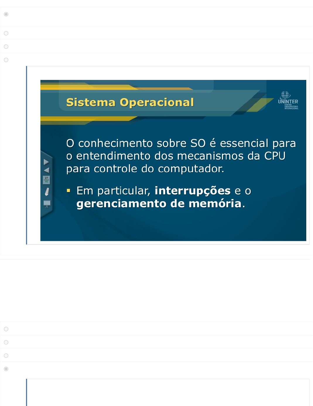 Questão 1/10 - Organização de Computadores Na Aula 5 , o autor Stallings apresenta que o conhecimento sobre Sistema Operacional é essencial para o entendimento dos mecanismos da CPU para controle do computador. Considerando os conteúdos ministrados na Aula 5 e disponibilizados no livro base e demais materias complementares de apoio didático pedagógico, assinale a alternativa que contém a resposta CORRETA da questão: Em particular, é essencial para: Nota: 0.0 Você não pontuou essa questão A Aquisição de CPUs melhores e mais velozes Você assinalou essa alternativa (A) B Acesso a novos dispositivos de interação com o usuário como telas touch screen C Em particular, conexões e meios de acesso D Em particular, interrupções e gerenciamento de memória Questão 2/10 - Organização de Computadores A aula 4 de Arquitetura de Computadores descreve: "Quando um computador para de executar o programa ou execute incorretamente, a solução adotada é o reset. Microcontrolador não possui essa solução, não há “botão reset” Assinale a Alternativa CORRETA: Para estes casos (microcontroladores) a Solução é: Nota: 10.0 A Desligar o microcontrolador B desenvolvimento de novo "tipo" de microcontrolador C introdução de um novo banco de memória RAM D introdução de um novo bloco, watchdog Você assinalou essa alternativa (D) Slide 27/40 - Aula 5 Você acertou! Slide 41/43 da Aula 4 - Arquitetura de Computadores 01/07/2024, 17:47 AVA UNIVIRTUS https://univirtus.uninter.com/ava/web/#/ava/AvaliacaoUsuarioHistorico/HOW%2Bqq%2FKKcNA9j4ewQeysA%3D%3D/novo/1/n9QEVT7iegfRCw8… 1/8 Questão 3/10 - Organização de Computadores O Nível ISA, apresentado na Aula 5, está entre o nível da microarquitetura e o nível do sistema operacional. Considerando os conteúdos ministrados na Aula 5 e disponibilizados no livro base e demais materias complementares de apoio didático pedagógico, assinale a alternativa que contém a resposta CORRETA da questão. O Nível ISA Apresenta-se ao mesmo tempo como? Nota: 10.0 A Uma importante tecnologia de barramento de expansão para os computadores B Método de padronização de componentes de Sistemas de Computação C Apresenta-se ao mesmo tempo como fronteira e/ou interface entre o Hardware e o Software Você assinalou essa alternativa (C) D Padrão da Indústria de Componentes e Periféricos Você acertou! Slide 4/40 - Aula 5 01/07/2024, 17:47 AVA UNIVIRTUS https://univirtus.uninter.com/ava/web/#/ava/AvaliacaoUsuarioHistorico/HOW%2Bqq%2FKKcNA9j4ewQeysA%3D%3D/novo/1/n9QEVT7iegfRCw8… 2/8 Questão 4/10 - Organização de Computadores Na Aula 5 , o autor Stallings apresenta que o conhecimenro sobre Sistema Operacional é essencial. Considerando os conteúdos ministrados na Aula 5 e disponibilizados no livro base e demais materias complementares de apoio didático pedagógico, assinale a alternativa que contém a resposta CORRETA da questão: - Para que o Conhecimento sobre Sistemas Operacionais é essencial? Nota: 10.0 A é essencial para o entendimento dos mecanismos da CPU para controle do computador. Você assinalou essa alternativa (A) B é essencial para a escolha da melhor e mais veloz CPU C é essencial para compreender as disferenças entre CPU móvel e dos DeskTops D é essencial para a aquisição de CPUs compatíveis entre sí e com a internet Questão 5/10 - Organização de Computadores Leio o fragmento de texto a seguir: "A operação dos computadores consiste em executar instruções sequenciais (uma após a outra)" (Slide 28/43 da Aula 4 - Arquitetura de Computadores) Assinale a alternativa CORRETA. Em quantas etapas a execução de instruções é subdividida: Nota: 10.0 A 5 B 4 C 7 Você assinalou essa alternativa (C) Você acertou! Slide 27/40 - Aula 5 Você acertou! Slides 19, 30 e 31/43 - Aula 4 01/07/2024, 17:47 AVA UNIVIRTUS https://univirtus.uninter.com/ava/web/#/ava/AvaliacaoUsuarioHistorico/HOW%2Bqq%2FKKcNA9j4ewQeysA%3D%3D/novo/1/n9QEVT7iegfRCw8… 3/8 D 6 Questão 6/10 - Organização de Computadores Apresentado e Definido na Aula 4, é considerado "o coração de todo computador" e "pode ser controlado por uma sequência que busca microinstruções em um armazenamento de controle". Assinale a alternativa CORRETA do elemento computacional que o texto se refere: Nota: 10.0 A Memória RAM B Microprocessador (CPU) C Graphic Processor Unit (GPU) D Caminho de Dados Você assinalou essa alternativa (D) Você acertou! Slide 42/43 da Aula 4 01/07/2024, 17:47 AVA UNIVIRTUS https://univirtus.uninter.com/ava/web/#/ava/AvaliacaoUsuarioHistorico/HOW%2Bqq%2FKKcNA9j4ewQeysA%3D%3D/novo/1/n9QEVT7iegfRCw8… 4/8 Questão 7/10 - Organização de Computadores Foi apresentado e definido na aula 4 o "controle do caminho de dados por Hardware". Dentre as características e vantagens na sua utilização destacam-se: I. Instruções executadas por microprograma II. Redução no conjunto de instruções III. Máquinas mais rápidas Considerando o texto apresentado na aula 4 assinale a alternativa CORRETA Nota: 10.0 A As sentenças II e III estão Corretas Você assinalou essa alternativa (A) Você acertou! Slide 21/43 da Aula 4 - Arquitetura de Computadores 01/07/2024, 17:47 AVA UNIVIRTUS https://univirtus.uninter.com/ava/web/#/ava/AvaliacaoUsuarioHistorico/HOW%2Bqq%2FKKcNA9j4ewQeysA%3D%3D/novo/1/n9QEVT7iegfRCw8… 5/8 B As sentenças I e III estão Corretas C Todas as sentenças estão Corretas D A sentença II está Correta Questão 8/10 - Organização de Computadores Na Aula 5 o Nível ISA são apresentados 2 (dois) fatores (características) essenciais a uma "boa" ISA. Considerando os conteúdos ministrados na Aula 5 e disponibilizados no livro base e demais materias complementares de apoio didático pedagógico, assinale a alternativa que contém a resposta CORRETA da questão. São fatores essenciais a uma "boa" ISA: Nota: 10.0 A 1. Acordo Comercial com os Sistemas Operacionais Móveis 2. Capacidade de utilizar novas tecnologias de acesso B