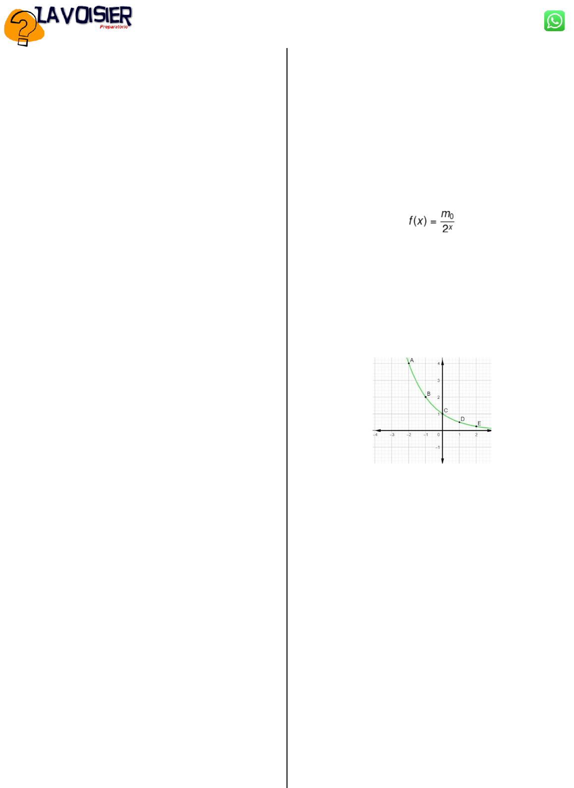 Rua 20, nº 15, Vila Viana, Grajaú-MA 99 99165-2562 MATEMÁTICA Exponencial 1. O valor de x que faz a equação 2x+1=32 é: A) 2 B) 3 C) 4 D) 5 E) 6 2. Sendo as funções g(x)=3x+2 e h(x)=92x+3 dadas no conjunto dos números reais, determine o valor de x que as torna iguais nesse ponto. A) 5 B) 7 C) 9 D) 11 E) 13 3. Dada uma função de R → R com a lei de formação f(x) = ax, em que a é um número positivo diferente de 1, julgue as afirmativas a seguir: I → Essa função será crescente se a for positivo. II → Se x = 0, então, f(x) = 1. III → Essa é uma função exponencial. Marque a alternativa correta: A) Somente a afirmativa I é falsa. B) Somente a afirmativa II é falsa. C) Somente a afirmativa III é falsa. D) Todas as afirmativas são verdadeiras. E) Todas as afirmativas são falsas. 4. Dada a função f(x) = 2x+3 + 10, o valor de x para que f(x) = 42 é de: A) 2 B) 3 C) 4 D) 5 E) 6 5. Encontre o valor de x na equação: 3x+2+3x=2430 A) x = 5 B) x = 4 C) x = 3 D) x = 2 E) x = 1 6. Durante um experimento, obteve-se a fórmula para a população de bactérias: q(t)=20⋅23t Em que t é o tempo, em hora, e q(t) é a população, em milhares de bactérias. Se a população de bactérias era incialmente de 20 mil, então após quanto tempo ela será dobrada? A) 3 horas B) 1 hora C) 30 minutos D) 20 minutos E) 10 minutos 7. Sendo h(x)=0,5x definida no conjunto dos números reais, faça os cálculos e marque a alternativa correta da expressão h(−1)+h(−2)+h(1)+h(2). A) 0 B) 6,75 C) 4,25 D) 2,35 E) 1,75 8. Dada a função exponencial f(x) = (k – 4)x, sabendo que essa função é decrescente, o valor de k está entre: A) 1 e 2 B) 2 e 3 C) 3 e 4 D) 4 e 5 E) 5 e 6 10. O número de casos de uma doença infecciosa dobra a cada 3 dias. Se houver 100 casos hoje, quantos casos haverá após 12 dias? A) 400 B) 800 C) 1200 D) 1400 E) 1600 11. Sendo uma função exponencial definida por f(x+1) = 200⋅(a+4)x, determine o valor de a para que a f(2)=400. A) 2 B) -1 C) 3 D) -2 E) -3 12. Um botânico, encantado com o pau-brasil, dedicou-se, durante anos de estudos, a conseguir criar uma função exponencial que medisse o crescimento dessa árvore no decorrer do tempo. Sua conclusão foi que, ao plantar-se essa árvore, seu crescimento, no decorrer dos anos, é dado por C(t) = 0,5 · 2t – 1. Analisando essa função, quanto tempo essa árvore leva para atingir a altura de 16 metros? A) 7 anos B) 6 anos C) 5 anos D) 4 anos E) 3 anos 13. Quando uma matéria é radioativa, é comum que a sua massa se desintegre, no decorrer do tempo, de forma exponencial. O césio 137, por exemplo, possui meia-vida após 30 anos, ou seja, se havia, inicialmente, uma massa m0 de césio, após 30 anos, haverá metade de m0. Para descrever melhor essa situação, temos a função exponencial: x→ quantidade de meias-vidas m0 → massa inicial f(x) → massa final Pensando nisso, se houver 80 gramas de césio 137, inicialmente, após 150 anos, haverá um total de: A) 2,0 gramas B) 2,5 gramas C) 3,0 gramas D) 3,5 gramas E) 5,0 gramas 14. O gráfico, a seguir, é a representação de uma função exponencial: Analisando o gráfico, a lei de formação dessa função exponencial é: A) f(x) = 5x B) f(x) = 0,2x C) f(x) = 2x D) f(x) = 0,5x E) f(x) = 0,5-x 15. Ao observar, em um microscópio, uma cultura de bactérias, um cientista percebeu que elas se reproduzem como uma função exponencial. A lei de formação que relaciona a quantidade de bactéricas existentes com o tempo é igual a f(t) = Q · 2t-1, em que Q é a quantidade inicial de bactérias e t é o tempo em horas. Se nessa cultura havia, inicialmente, 700 bactérias, a quantidade de bactérias após 4 horas será de: A) 7000 B) 8700 C) 15.300 D) 11.200 E) 5600 16. A expressão P(t) = K · 20,05t fornece o número P de milhares de habitantes de uma cidade, em função do tempo t, em anos. Se, em 1990, essa cidade tinha 300.000 habitantes, quantos habitantes, aproximadamente, espera-se que ela tenha no ano 2000? A) 352.000 B) 401.000 C) 423.000 D) 439.000 E) 441 000 17. Um paciente recebe uma injeção de material radioativo com meia-vida de 2 horas. Sabendo que foram aplicados 200 microgramas desse material, depois de 8 horas quanto ainda permanece no corpo do paciente? A) 100 microgramas B) 50 microgramas C) 25 microgramas D) 12,5 microgramas E) 6,25 microgramas Rua 20, nº 15, Vila Viana, Grajaú-MA 99 99165-2562 MATEMÁTICA Função Logarítmica 1. Seja f(x) = log2x e g(x) = log3 x a lei de formação de duas funções f(x) e g(x), então o valor de f(8) – g (9) é igual a: A) 0. B) 1. C) 2. D) –1. E) – 2. 2. O volume de um reservatório em função do tempo é dado em litros pela função: Considere que t ≥ 1, e t é dado em dias e V(t) é dado em litros. Sendo assim, após quantos dias o volume da piscina será de 284 litros? A) 12 dias B) 14 dias C) 15 dias D) 16 dias E) 17 dias 3. A expectativa de vida em anos, em uma região, de uma pessoa que nasceu a partir de 1900 no ano x ( x ≥ 1900) é dada por L(x)=12·(199log10x - 651). Considerando Log2=0,3, uma pessoa dessa região que nasceu no ano 2000 tem expectativa de viver: A) 48,7 anos. B) 54,6 anos. C) 64,5 anos. D) 68,4 anos. E) 72,3 anos. 4. A Escala e Magnitude de Momento (abreviada como MMS e denotada como MW), introduzida em 1979 por Thomas Haks e Hiroo Kanamori, substituiu a Escala de Richter para medir a magnitude dos terremotos em termos de energia liberada. Menos conhecida pelo público, a MMS é, no entanto, a escala usada para estimar as magnitudes de todos os grandes terremotos da atualidade. Assim como a escala Richter, a MMS é uma escala logarítmica. MW e M0 se relacionam pela formula: Onde M0 é o momento sísmico (usualmente estimado a partir dos registros de movimento da superfície, através dos sismogramas), cuja unidade é o dina⋅cm. O terremoto de Kobe, acontecido no dia 17 de janeiro de 1995, foi um dos terremotos que causaram maior impacto no Japão e na co