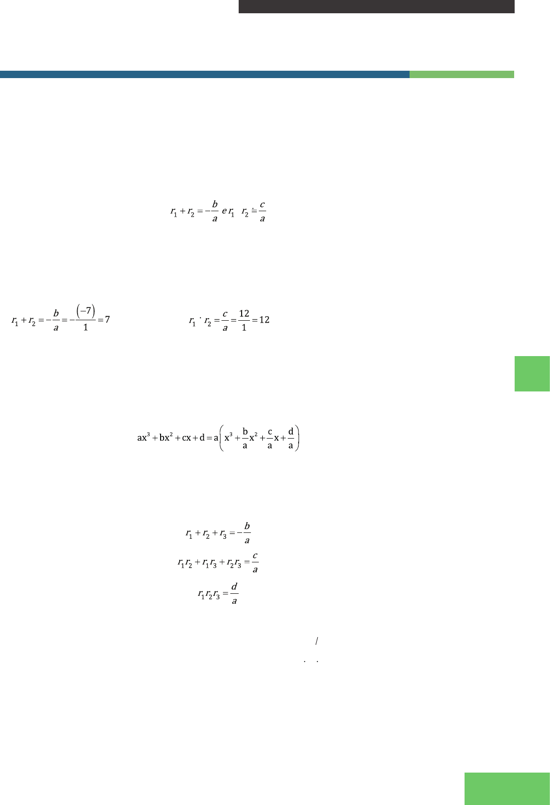III - POLINÔMIOS, MATRIZES, DETERMINANTES E SISTEMAS LINEARES 93 MATEMÁTICA BÁSICA MBAutor: Rodrigo Nogueira de Codes UN 03 As equações quadráticas ou do 2º grau são do tipo ax2 + bx + c = 0, com a ≠ 0 Essa equação possui duas raízes, nomeadas r1 e r2. Tal equação pode ser reescrita da seguinte forma ax2 + bx + c = a(x – r1)(x – r2) A partir dessa igualdade, pode-se verificar que Tais igualdades são conhecidas como relações de Girard para uma equação quadrática. Elas expressam uma relação entre coeficientes e raízes de uma equação do 2º grau. Exemplo: Considerando r1 e r2 as raízes da equação do 2º grau X2 – 7X + 12, calcule: a) b) Para um polinômio do terceiro grau do tipo P(X) = ax3 + bx2 + cx + d (a ≠ 0), o mesmo procedimento pode ser usado e este pode ser fatorado da seguinte forma: ax3 + bx2 + cx + d = a(x – r1) (x – r2) (x – r3) A partir dessa igualdade, tem-se que o primeiro membro da expressão pode ser reescrito como E o segundo membro pode ser reescrito da seguinte forma a(x – r1) (x – r2) (x – r3) = a[x3 – (r1 + r2 + r3) x2 + (r1 r2 + r1 r3 + r2 r3) x + (r1 r2 r3)] Igualando as duas novas expressões, obtém-se o seguinte: Um polinômio de grau n tem relações análogas aos de grau 2 e 3, ou seja, para P(x) = an Xn + an-1 Xn-1 + … + a1 X + a0 (an=0) an Xn + an-1 Xn-1 + … + a1 X + a0 = an .(X – r1).(X – r2) … (X – rn) Relações entre coeficientes e raízes 94 III - POLINÔMIOS, MATRIZES, DETERMINANTES E SISTEMAS LINEARES MATEMÁTICA BÁSICAMB Autor: Rodrigo Nogueira de Codes Além do mais Essas são as relações de Girard para um polinômio de grau n. EXERCÍCIO PROPOSTO 1. Sejam P(X) = 4X4 – 3X2 + 1 e Q(X) = 2X3 – 4X – 7, calcule: a) P(X) + Q(X) b) P(X) – Q(X) c) 2P(X).3Q(X) d) P(X).Q(X) e) gr(PQ) f)[P(X)]2 + [Q(X)]2 2. Determinar os valores de m e n para que os polinômios P(x) = (m² – 3m)x² + 4x – 1 e Q(x) = –2x² + (n + 3)x – 1 sejam idênticos. 3. Determine o quociente Q(X) e o resto R(X) dos seguintes polinômios: a) P(X) = 6X5 = 12X4 – 3X2 – 15 E D(X) = X2 + 2 b) P(X) = X4 – 5X2 – 3X E D(X) = X3 + 5X2 – 1 c) P(X) = 2X3 – 7X + 35 E D(X) = X – 1 4. Aplicando as relações de Girard: a) Encontre um polinômio do grau 3 cujas raízes são 1, 3 e 5. b) Encontre um polinômio de grau 4 com coeficiente líder 3 e cujas raízes sejam –2, –1, 1, 2.
