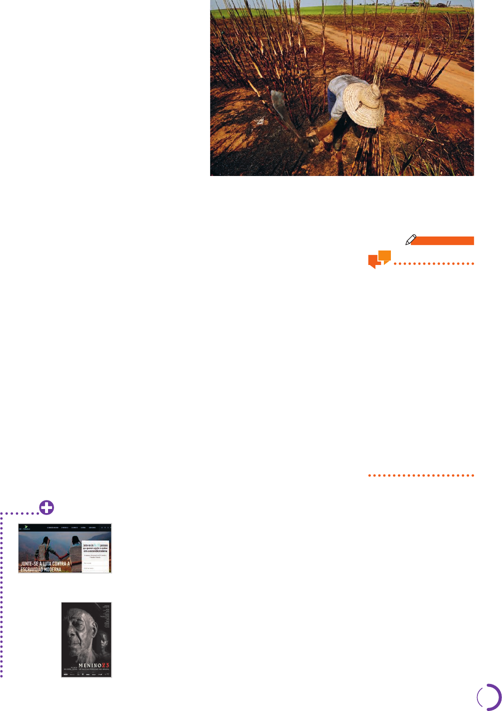 No Brasil, contratar trabalho escravo e promover o tráfico de pessoas são crimes previstos em lei. A produção de carvão vegetal, o cultivo do café e da cana-de- -açúcar, a construção civil, a indústria têx- til e o trabalho doméstico são alguns dos setores em que há maior número de casos de trabalho análogo à escravidão no país. Graças à pressão de movimentos organi- zados da sociedade civil e da assinatura de acordos internacionais, houve várias denúncias, e o Ministério Público do Traba- lho efetuou centenas de operações de fis- calização. Entre 2003 e 2018, estima-se que cerca de 45 mil trabalhadores foram resgatados e libertados do trabalho análogo à escravidão no Brasil. Leia a definição de trabalho análogo ao de escravo previsto no Código Pe- nal brasileiro. De acordo com o artigo 149 do Código Penal brasileiro, são elementos que caracterizam o trabalho análogo ao de escravo: condições degradan- tes de trabalho (incompatíveis com a dignidade humana, caracterizadas pela violação de direitos fundamentais [e que] coloquem em risco a saúde e a vida do trabalhador), jornada exaustiva (em que o trabalhador é sub- metido a esforço excessivo ou sobrecarga de trabalho que acarreta [...] danos à sua saúde ou risco de vida), trabalho forçado (manter a pessoa no serviço através de fraudes, isolamento geográfico, ameaças e violências físicas e psicológicas) e servidão por dívida (fazer o trabalhador contrair ilegalmente um débito e prendê-lo a ele). Os elementos podem vir jun- tos ou isoladamente. [...] Quando um trabalhador mantém sua liberdade, mas é excluído de condições mínimas de dignidade, temos também ca- racterizado trabalho escravo. REPÓRTER BRASIL. O que é trabalho escravo? Disponível em: https://reporterbrasil.org.br/trabalho-escravo/. Acesso em: 8 jul. 2020. Cortador de cana em fazenda que recebeu fiscalização após denúncia de trabalho escravo no sul da Bahia, em 2017. Saber 50 for freedom. Disponível em: https://50forfreedom.org/pt/. Acesso em: 6 jul. 2020. No site em português da campanha da OIT contra o trabalho escravo, é possível encontrar uma série de gráficos, mapas e fontes que esclarecem mitos e verdades sobre esse tema e alertam para a importância do combate a essa forma de exploração. Menino 23 – Infâncias perdidas no Brasil. Direção: Belisário Franca. Brasil, 2016. O documentário Menino 23 nasceu de pesquisas empreendidas por um professor de História, ao descobrir uma fazenda, no interior de São Paulo, cujos donos eram simpatizantes do nazismo durante as décadas de 1930 e 1940 e utilizaram o trabalho escravo (em situação análoga à escravidão) de dezenas de crianças afrodescendentes, adotadas em um orfanato no Rio de Janeiro. • O que possibilita a existência atual do trabalho análogo ao escravo? • Você reconhece alguma dessas características ou condições no trabalho realizado por pessoas que conhece ou em locais que visitou? • Como combater essa prática de exploração do trabalhador? Veja orientações e respostas no Manual do Professor. Conversa NÃO ESCREVA NO LIVRO K a ri m e X a v ie r/ F o lh a p re s s 5 0 fo rf re e d o m / 5 0 fo rf re e d o m .o rg R e p ro d u ç ã o /G ir o s /E lo c o m p a n y 139 V4_CIE_HUM_Claudio_g21Sa_Cap4_126a157.indd 139V4_CIE_HUM_Claudio_g21Sa_Cap4_126a157.indd 139 16/09/2020 12:0116/09/2020 12:01 O mundo do trabalho no futuro No mundo do trabalho, especialmente, as habilidades e os conhecimen- tos podem ser valorizados e remunerados de diferentes formas, variando de acordo com o contexto sócio-histórico-geográfico. Afinal, de acordo com a base técnica existente, o sistema produtivo em vigor e as condições ofe- recidas em cada lugar e em cada época, são exigidos diferentes saberes e habilidades dos seres humanos. Impulsionadas pela revolução da microeletrônica, as chamadas novas tecnologias da informação e da comunicação (TIC) vêm alterando a manei- ra como nos comunicamos, nos relacionamos e interagimos uns com os ou- tros, e também como aprendemos, estudamos, produzimos e trabalhamos. Sob o signo do novo, que surge a todo instante, o mundo é marcado pela velocidade e pela vertigem. Esse é o mundo em que vivemos, estudamos e, possivelmente, trabalharemos. Logo, se o mundo está em rápida e constante transformação, que saberes e habilidades devemos desenvolver no presente que ainda serão úteis no futuro? É possível prever o que será exigido saber e fazer no futuro? Essa é a tarefa dos chamados analistas de tendência: identificar, ou ao menos tentar, o que está por vir. Entre erros e acertos, e com base no pre- sente, é possível afirmar que o futuro que se anuncia exigirá das pessoas a obtenção de um vasto repertório de saberes e conhecimentos científicos, aprendido sobretudo nas escolas básicas e universidades, mas não apenas nesses ambientes. Entre eles, vale destacar as competências de interpreta- ção e uso de diferentes linguagens, fluência na utilização das novas tecnolo- gias, independência e autonomia para aprender e habilidades para conviver e trabalhar em grupo. A charge é uma sátira sobre a relevância da tecnologia no processo evolutivo. © 2 0 1 4 T a k B u i / D is t. b y A n d re w s M c M e e l S y n d ic a ti o n f o r U F S 140 V4_CIE_HUM_Claudio_g21Sa_Cap4_126a157.indd 140V4_CIE_HUM_Claudio_g21Sa_Cap4_126a157.indd 140 16/09/2020 12:0116/09/2020 12:01 Trajetórias possíveis Ao finalizar o Ensino Médio, uma pessoa pode dedicar-se exclusivamente ao mercado de trabalho, dar continuidade à sua educação formal, ingressan- do em um curso de ensino superior, por exemplo, ou fazer os dois ao mesmo tempo. Esta última opção, apesar de ser a mais desafiadora, é a realidade de muitos jovens brasileiros. O mundo do trabalho é diversificado e dinâmico, podendo ser qualificado como formal ou informal. Se, no primeiro grupo, estão incluídos os trabalha- dores a
