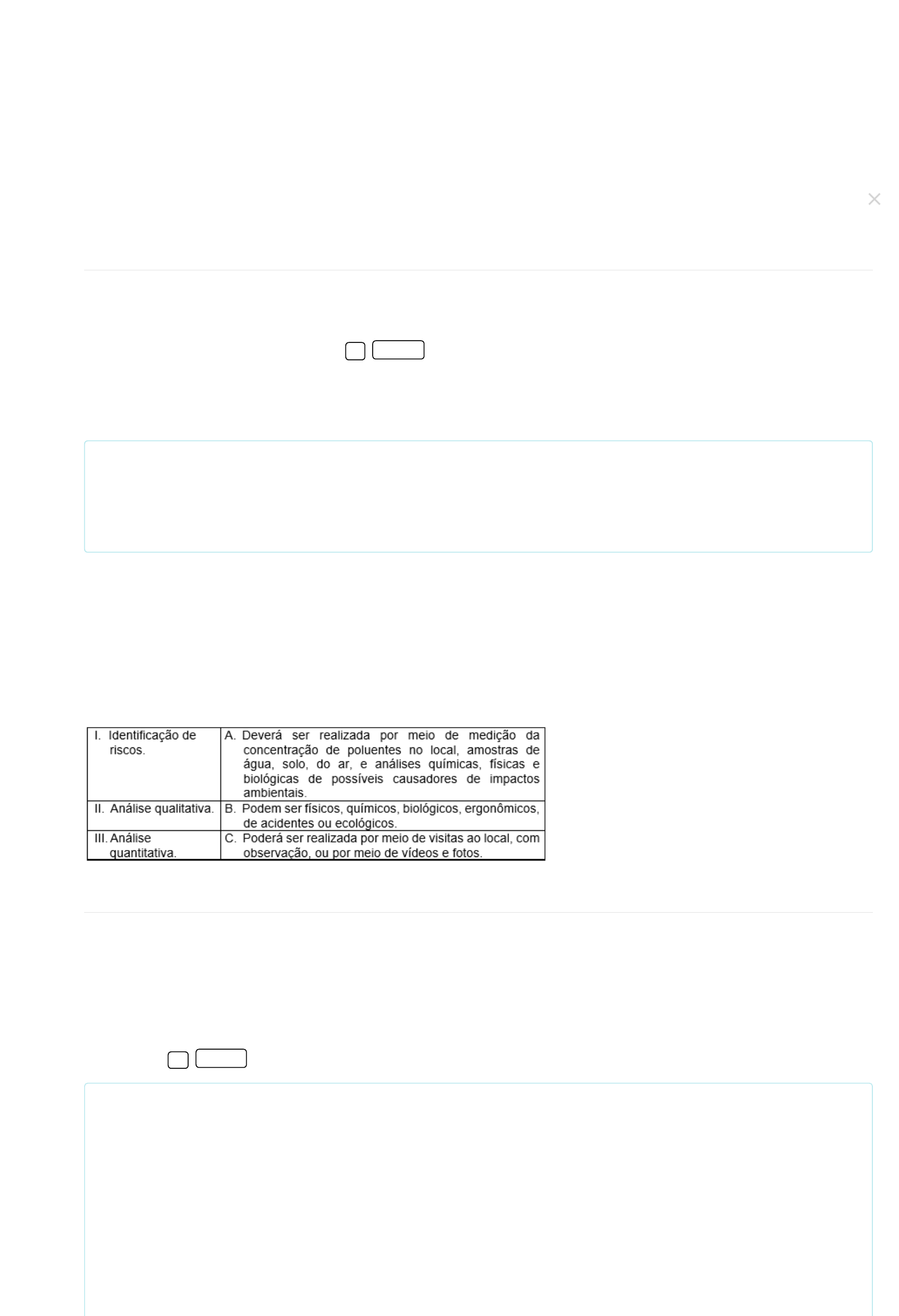 Proteção do meio ambiente Professor(a): Caroline Hatada Lima Bomfim (Mestrado acadêmico) 1) 2) Prepare-se! Chegou a hora de você testar o conhecimento adquirido nesta disciplina. A Avaliação Virtual (AV) é composta por questões objetivas e corresponde a 100% da média final. Você tem até cinco tentativas para “Enviar” as questões, que são automaticamente corrigidas. Você pode responder as questões consultando o material de estudos, mas lembre-se de cumprir o prazo estabelecido. Boa prova! A queima de resíduos é muito prejudicial à saúde da população e do meio ambiente. Sabe-se que o Brasil é o terceiro país que mais queima resíduos do mundo. Durante a queima, podem ser liberados _________ e _________, que podem contribuir para o _________ , por isso, essa prática é _________ e deve ser monitorada. Assinale a alternativa que completa adequadamente as lacunas: Alternativas: Poluentes; cheiros; aquecimento global; legal. Gases; partículas; aquecimento global; ilegal. CORRETO Gases; partículas; chuva ácida; legal. Compostos; ozônio; aquecimento da terra; permitida. Chuvas; ventos; transporte dos poluentes; perigosa Código da questão: 69053 A identificação de riscos ambientais é possível ser realizada por meio de um roteiro simples, mas eficaz. Este roteiro abrange a identificação de riscos, a avaliação de potencialidade danosa e chances de ocorrência, as análises qualitativas e quantitativas, a eliminação ou minimização dos riscos e o controle e acompanhamento dos riscos. Leia e associe as duas colunas conforme o passo a passo para a identificação de riscos ambientais. Assinale a alternativa que traz a associação correta entre as duas colunas: Alternativas: I-B; II-A, III-C. I-C; II-A; III-B. I-A; II-B; III-C. I-C; II-B; III-A. I-B; II-C; III-A. CORRETO Resolução comentada: A queima de resíduos é muito prejudicial à saúde da população e do meio ambiente. Sabe-se que o Brasil é o terceiro país que mais queima resíduos do mundo. Durante a queima, podem ser liberados gases e partículas que podem contribuir para o aquecimento global, por isso, essa prática é ilegal e deve ser monitorada. Resolução comentada: O roteiro de atividades para identificação de riscos ambientais é importante para avaliar a potencialidade danosa das atividades de uma organização. Algumas das fases podem ser descritas como a seguir: Avaliação enviada com sucesso 02/07/24, 00:30 Cosmos · Cosmos https://kroton.platosedu.io/lms/m/aluno/disciplina/index/3280769/10630844 1/5 3) 4) Código da questão: 69041 Sobre a correta destinação dos resíduos sólidos, analise as afirmativas a seguir e classifique como verdadeiras (V) ou falsas (F). ( ) A destinação final ambientalmente adequada é obrigação de todos os geradores, que têm a responsabilidade compartilhada estabelecida pela Política Nacional de Resíduos Sólidos. ( ) O aterro sanitário é a forma adequada de destinar resíduos recicláveis, rejeitos e orgânicos. ( ) O resíduo orgânico pode ser reciclado por meio da compostagem, que é uma prática que reduz o volume do resíduo, não tem cheiro e não atrai vetores quando bem executada. ( ) O lixão a céu aberto está previsto na Política Nacional de Resíduos Sólidos, e pode funcionar desde que os catadores não exerçam sua atividade laboral no local. ( ) O aterro sanitário e o industrial tem construções e finalidades exatamente iguais. Assinale a alternativa que contenha a sequência correta. Alternativas: F – V – V – F – F. V – F – V – F – F. CORRETO V – V – V – F – F. F– F – V – V – V. V – V – F – V – F. Código da questão: 69047 A Curva FN é associada ao risco _________, enquanto a Cuva Iso-risco é associada ao risco _________. A Curva FN possui as zonas negligenciável, _________ e a zona intolerável. Já a Iso-risco, leva em consideração o _________ e o período de tempo. Assinale a alternativa que completa adequadamente as lacunas: Alternativas: Físico; biológico; recusável; dia. Individual; social; negligenciadora; local. Social; individual; região ALARP; dano. CORRETO Coletivo; individual; aceitável; calor. Químico; biológico; região ALARP; efeito. Resolução comentada: A primeira e a terceira afirmativas são verdadeiras. Segunda – O aterro sanitário é a forma de destinação correta somente para os rejeitos. Quarta – A PNRS estabelece o fim dos lixões para até o ano de 2024, onde os municípios devem se adequar e fomentar o gerenciamento correto dos resíduos sólidos. Quinta – O aterro industrial possui camada dupla de impermeabilização de solo e também manta impermeabilizadora no seu fechamento. Resolução comentada: Avaliação enviada com sucesso 02/07/24, 00:30 Cosmos · Cosmos https://kroton.platosedu.io/lms/m/aluno/disciplina/index/3280769/10630844 2/5 5) 6) Código da questão: 69039 Sobre a capacitação e treinamento dos colaboradores, analise as afirmativas a seguir e classifique como verdadeiras (V) ou falsas (F). ( ) A capacitação e treinamento é sempre facultativo, devendo o trabalhador identificar se quer, ou não, realiza-lo. ( ) Em treinamentos e capacitações, a teoria é mais importante do que a prática. ( ) Na maioria dos programas de avaliação de risco, a capacitação é essencial, e deve ser periódica. ( ) O engajamento dos colaboradores é peça-chave para o alcance das metas compreendidas nos planos de avaliação ambiental e gerenciamento de riscos. ( ) O conteúdo programático a ser abordado nos treinamentos e capacitações ficam a cargo da empresa ou estão estabelecidos nas normas regulamentadoras (NRs). Assinale a alternativa que contenha a sequência correta de V e F: Alternativas: F – V – F – V – V. F – V – F – V – F. V – V – V – V – F. V – V – F – V – F. F – F – V – V – V. CORRETO Código da questão: 69061 Toda atividade econômica pode gerar algum risco ao meio ambi