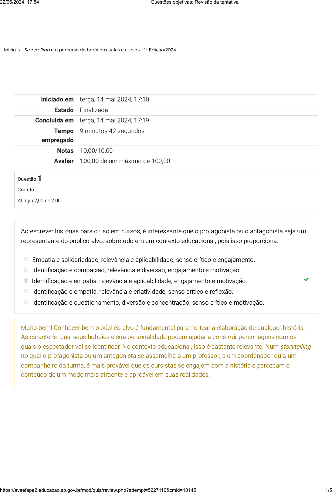 Início \ Storytelling e o percurso do herói em aulas e cursos – 1ª Edição/2024 Iniciado em terça, 14 mai 2024, 17:10 Estado Finalizada Concluída em terça, 14 mai 2024, 17:19 Tempo empregado 9 minutos 42 segundos Notas 10,00/10,00 Avaliar 100,00 de um máximo de 100,00 Questão 1 Correto Atingiu 2,00 de 2,00 Ao escrever histórias para o uso em cursos, é interessante que o protagonista ou o antagonista seja um representante do público-alvo, sobretudo em um contexto educacional, pois isso proporciona: Empatia e solidariedade, relevância e aplicabilidade, senso crítico e engajamento. Identi�cação e compaixão, relevância e diversão, engajamento e motivação. Identi�cação e empatia, relevância e aplicabilidade, engajamento e motivação. Identi�cação e empatia, relevância e criatividade, senso crítico e re�exão. Identi�cação e questionamento, diversão e concentração, senso crítico e motivação. Muito bem! Conhecer bem o público-alvo é fundamental para nortear a elaboração de qualquer história. As características, seus hobbies e sua personalidade podem ajudar a construir personagens com os quais o espectador vai se identi�car. No contexto educacional, isso é bastante relevante. Num storytelling no qual o protagonista ou um antagonista se assemelha a um professor, a um coordenador ou a um companheiro da turma, é mais provável que os cursistas se engajem com a história e percebam o conteúdo de um modo mais atraente e aplicável em suas realidades. 22/06/2024, 17:54 Questões objetivas: Revisão da tentativa https://avaefape2.educacao.sp.gov.br/mod/quiz/review.php?attempt=5227116&cmid=18145 1/5 https://avaefape2.educacao.sp.gov.br/my/ https://avaefape2.educacao.sp.gov.br/course/view.php?id=307 https://avaefape2.educacao.sp.gov.br/course/view.php?id=307 Questão 2 Correto Atingiu 2,00 de 2,00 Levando em consideração o que aprendemos sobre a evolução da contação de histórias, da tradição oral aos tempos modernos, assinale a alternativa correta. Segundo antropólogos, as histórias contadas ao redor de fogueiras correspondiam a cerca de 80% das conversas de nossos ancestrais, servindo como um modo essencial de aprendizado e compartilhamento de experiências. O storytelling como conhecemos hoje, um poderoso meio de conectar e in�uenciar pessoas, só foi possível com o surgimento e a popularização das redes sociais. A invenção da escrita restringiu as possibilidades de expressão do storytelling, con�nando as narrativas ao formato escrito. O termo storytelling foi criado por antropólogos, utilizado para descrever a prática de desenhar nas paredes das cavernas. A prática de contar histórias, também conhecida como storytelling, se originou somente após a invenção da escrita pelos sumérios, substituindo completamente a tradição oral. Muito bem! Compreender a evolução do storytelling é fundamental para entendermos como chegamos à forma atual de compartilhar histórias e por que elas são tão importantes para várias áreas atualmente, inclusive a da educação. “Contar e ouvir histórias é muito mais do que uma técnica ou um simples processo de transmissão de informações entre um emissor e um receptor. […] Foi ouvindo e contando histórias que o ser humano se constitui e continua se constituindo. Assim, as histórias que chegam até nós também dizem muito sobre relações de poder, sobre como valores foram sendo �rmados e como povos se organizaram e se mantiveram no transcorrer do desenvolvimento da humanidade” (JÚNIOR, 2019, [s. p.]). 22/06/2024, 17:54 Questões objetivas: Revisão da tentativa https://avaefape2.educacao.sp.gov.br/mod/quiz/review.php?attempt=5227116&cmid=18145 2/5 Questão 3 Correto Atingiu 2,00 de 2,00 “A estrutura é a consequência [...] das palavras que escolhemos e da ordenação dos elementos da cena, das cenas em si (‘momentos em que’), dos capítulos, das partes da história ou de quaisquer outros elementos sintáticos da trama que venhamos a criar para comunicar nossa história ao outro” (MCSILL, 2017, [s. p.]). Assinale os tipos de estruturas que você conheceu ao longo deste módulo. A jornada do herói. Estrutura não linear. Estrutura de três atos. Estrutura de cinco atos. Estrutura linear. Muito bem! Você identi�cou corretamente as estruturas que conhecemos ao longo do módulo. Cada uma delas sugere uma organização da narrativa. A de três atos, por exemplo, divide a história em apresentação, desenvolvimento e resolução, enquanto a não linear diz que uma história não precisa começar necessariamente pela “cena inicial”, mas requer planejamento para que a história faça sentido mesmo sendo contada fora de ordem. A estrutura é um recurso, não uma regra; você pode adaptá-la para atender às necessidades da sua história. 22/06/2024, 17:54 Questões objetivas: Revisão da tentativa https://avaefape2.educacao.sp.gov.br/mod/quiz/review.php?attempt=5227116&cmid=18145 3/5 Questão 4 Correto Atingiu 2,00 de 2,00 Leia atentamente as histórias �ctícias a seguir. Qual delas não é um exemplo efetivo de storytelling como metodologia ativa de aprendizagem? Em uma aula de Biologia, o professor contou uma história, repleta de efeitos sonoros, sobre a viagem de um vírus dentro do corpo humano. Ao concluir a narração, o docente dividiu a turma em grupos: cada um deles teria que criar um capítulo para a narrativa, explicando o que acontece quando o vírus encontra diferentes células e tecidos. Para explicar a Grécia Antiga aos alunos do Ensino Médio, o professor de História usa uma versão da Odisseia em quadrinhos a �m de ajudar os alunos a entenderem como aquela civilização se organizava e vivia. Ao término da aula, a turma foi convidada a debater o conteúdo exposto e compará-lo com o que já tinham aprendido sobre Roma. Em uma aula de Biologia, o professor contou a história de dois pesquisadores que, dedicados a conhecer o tipo de 