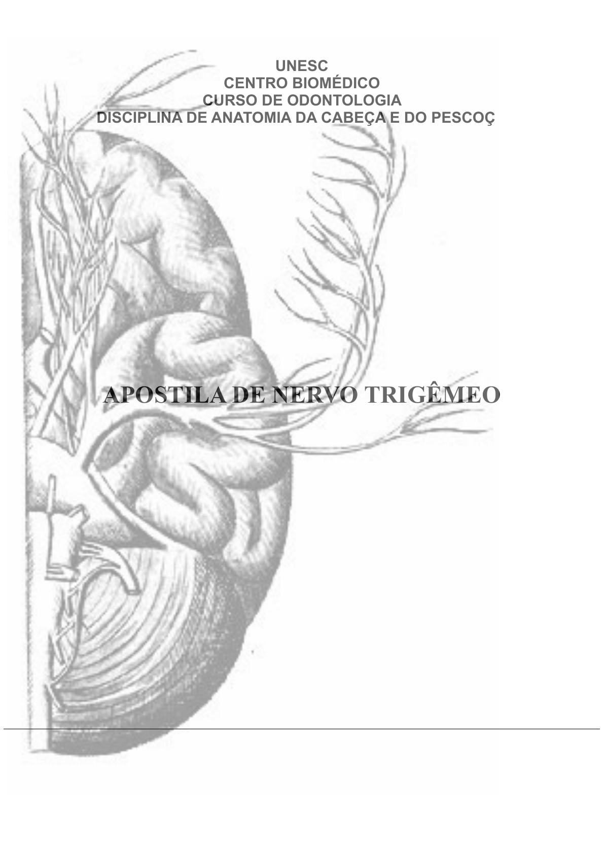UNESC CENTRO BIOMÉDICO CURSO DE ODONTOLOGIA DISCIPLINA DE ANATOMIA DA CABEÇA E DO PESCOÇO APOSTILA DE NERVO TRIGÊMEO Professor Dr. Bruno Machado de Carvalho APOSTILA DE NERVO TRIGÊMEO INTRODUÇÃO O nervo trigêmeo (fig. 1), ou quinto par craniano (V) é assim denominado por possuir 3 ramos calibrosos, distribuídos por áreas extensas na face, tanto superficiais quanto profundas (RIZZOLLO e MADEIRA, 2011). É o maior dos pares cranianos. Atribui-se a Claudio Galeno, médico grego que viveu, provavelmente, entre os anos 129 a 200 (APUZZO, 2000), a primeira descrição do nervo trigêmeo (STEINBERG, 2002). Ao identificar 10 dos 12 pares de nervos cranianos, Galeno erroneamente acreditava que o V par era formado por outros dois pares distintos, denominados por ele de terceiro e quarto pares (FLAMM, 1967; SHAW, 1992). De maneira acertada, Galeno notara que o nervo trigêmeo está envolto pelas camadas da dura-máter, porém, não fez nenhuma observação acerca do nervo alveolar inferior. Andrea Vesalius (1510-1564), tanto em suas ilustrações (Fig. 2) quanto em seu texto, não acrescentou nada de novo às descrições de Galeno, dividindo o V par da mesma maneira que seu antecessor (FLAMM, 1967). Figura 1 - Primeiras ilustrações do V par craniano e seus ramos No século XVII, Thomas Willis (1621-1675) descreveu o nervo trigêmeo e seus ramos sem, entretanto, acrescentar novas informações, como fez seus antecessores. Sua maior contribuição foi nomear as estruturas trigeminais de maneira mais acertada, como designar o nervo trigêmeo como o V par craniano, além de utilizar o termo nervo oftálmico para uma de suas divisões (FLAMM, 1967). Johann Friedrich Meckel (1781-1833), o ancião, foi precursor ao dedicar todo um estudo ao nervo trigêmeo, na publicação Dissertatio inauguralis medica anatomico physiologica de quinto pare nervorum cerebri, onde fornece importantes informações até então não esclarecidas acerca do V par. Pela primeira vez fez-se o uso correto dos termos oftálmico e maxilar para se referir, respectivamente, ao primeiro e segundo ramos do nervo trigêmeo; todavia, ao descrever o nervo mandibular utilizou a mesma nomenclatura de seus antecessores, ramo terceiro do quinto par (MECKEL, 1748). Não obstante, o pioneirismo na utilização do termo nervo trigêmeo para o V par craniano atribui-se a Jacques-Bénigne Winslow (1669-1760), que também denominou de nervo maxilar inferior toda a sua terceira divisão, terminologia utilizada por Meckel (1748) apenas para o nervo alveolar inferior (WINSLOW, 1754). O nervo trigêmeo recolhe toda a sensibilidade da face (superficial e profunda) e da parte mais anterior do couro cabeludo, assim como do pavilhão auricular, incluindo dentes, boca, cavidade nasal e seios paranasais, com exceção da pele dos ângulos da mandíbula, de cuja inervação é proveniente do nervo auricular magno (ramo do plexo cervical). O componente motor é responsável pela motricidade dos principais músculos da mastigação (RIZZOLLO e MADEIRA, 2011). Existe algum entrecruzamento de fibras nervosas na linha mediana da face pelo V nervo, mas menos do que é encontrado nos nervos que suprem o tronco. ORIGEM REAL E APARENTE DO NERVO TRIGÊMEO E SEUS TRAJETO INTRACRANIANO De acordo com os clássicos Testut (1922), Testut e Latarjet (1930) e Williams et al. (1995), o nervo trigêmeo tem sua origem aparente no tronco encefálico, na parte lateral da face anterior da ponte, medialmente ao pedúnculo cerebelar médio, em uma área denominada ângulo cerebelopontino (GARDNER, GRAY e O`RAHILLY, 1988). Essa origem se faz por duas raízes: uma posterolateral, volumosa e funcionalmente sensitiva e a outra delgada, de situação anteromedial (2 a 5mm medial e anterior) e funcionalmente motora, que também contém fibras sensitivas proprioceptivas da raiz central mesencefálica do nervo (GRAY, 1988). Figura 2 - Origem aparente do n. trigêmeo As duas raízes assumem direção anterior e ligeiramente lateral, para cruzarem a margem superior da parte petrosa do osso temporal, local onde se relacionam inferiormente com o seio petroso superior; nesse ponto, a raiz motora muda de direção e relaciona-se, agora, com a face inferior da raiz sensorial (fig. 3). N. trigêmeo Figura 3 - Percurso anterior do n. trigêmeo. Continuando em seu trajeto anterior, as duas raízes atravessam uma larga chanfradura, a incisura do nervo trigêmeo, que se transforma em um forame ovalado pelo tentório do cerebelo, por onde o V par penetra na cavidade trigeminal. Esse espaço, situado entre as duas camadas da dura-máter, além de pia-máter e aracnoide-máter, é denominado cavo trigeminal, que se prolonga e se dilata no sentido anteroinferior, para acomodar o gânglio trigeminal (de Gasser, ou semilunar), e seus três ramos. O gânglio trigeminal é a maior massa ganglionar de nosso corpo. É o único gânglio localizado no interior do crânio (RIZZOLO e MADEIRA, 2011) (fig. 4 e 5). A massa ganglionar é chata e semilunar na forma, medindo aproximadamente 1cm X 2cm, com os prolongamentos centrais dos neurônios deixando a concavidade e as fibras periféricas, a convexidade do crescente (GRAY, 1988). Figura 4 - Cavo e gânglio trigeminais. 105 Br ai n St em 4 8 10 75 6 14 15 1316 10 11 24 25 26 17 9 13 912 22 23 27 19 20 21 1 18 2 3 Base of the Skull A Base of the skull, viewed from above (preparation by Professor Platzer) Kahle, Color Atlas of Human Anatomy, Vol. 3 © 2003 Thieme All rights reserved. Usage subject to terms and conditions of license. Figura 5 - Cavo e gânglio trigeminais (NATSIS e PIAGKOU, 2015) Sua parede medial é delgada e se relaciona com a face lateral do seio cavernoso, sendo a parede superior espessa e reforçada por fibras provenientes do tentório do cerebelo. No interior do cavo trigeminal, encontra-se líquor, que ajuda na proteção do gânglio. O cavo trigeminal localiza-se na fossa média do crânio, alojado em uma depressão encontrada próxi