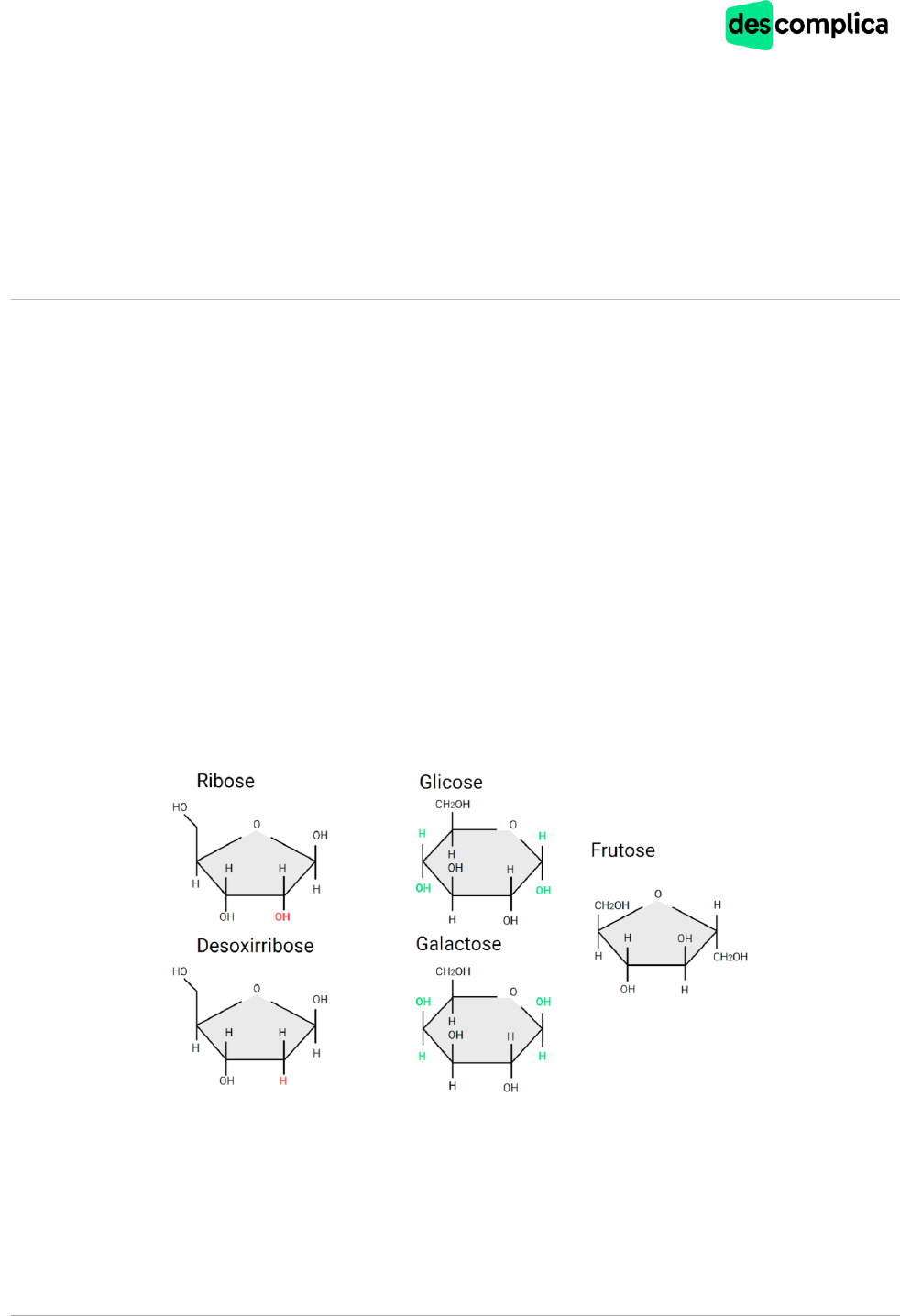 Biologia Glicídios: aprofundamento Teoria Os glicídios (também conhecidos como carboidratos) são compostos orgânicos, e têm função de fornecer energia ou compor estruturas. São constituídos basicamente de carbono, hidrogênio e oxigênio, e podem ser encontrados nas seguintes formas: Monossacarídeos São a menor estrutura glicídica, considerada uma estrutura básica (monômero). São absorvidos diretamente pela célula. Sua fórmula química básica é Cn(H2O)n. Entre os principais monossacarídeos, podemos citar as pentoses e as hexoses: ● Pentoses: apresentam cinco átomos de carbono. Têm fórmula C5H10O5 para a ribose (que forma o RNA) e C5H10O4 para a desoxirribose (que forma o DNA) — nota-se que há perda de um oxigênio; ● Hexoses: possuem seis átomos de carbono. Têm fórmula química C6H12O6. Exemplos de hexoses: frutose, glicose e galactose, todos com fórmula química C6H12O6. O que os difere é o posicionamento de alguns átomos — são estruturas isômeras; ou seja, apresentam a mesma fórmula, mas são diferentes entre si). Estruturas químicas das pentoses (desoxirribose e ribose) e das hexoses (glicose, frutose e galactose). Oligossacarídeos São a junção de dois a seis monossacarídeos. Entre eles, os mais importantes são os dissacarídeos, formados pela ligação glicosídica entre dois monossacarídeos. São exemplos deles: sacarose (frutose + glicose), maltose (glicose + glicose) a lactose (galactose + glicose). Biologia Estruturas químicas dos dissacarídeos. Polissacarídeos A junção de muitos monossacarídeos gera polímeros chamados de polissacarídeos. Têm função energética ou estrutural: ● Energética: apresentam moléculas que serão utilizadas na obtenção de energia para o metabolismo. São exemplos de polissacarídeos energéticos: amido (que é uma reserva energética encontrada em plantas) e glicogênio (uma reserva energética encontrada em animais e fungos). Esses polissacarídeos se diferenciam, principalmente, pelo tamanho e quantidade de ligações — o glicogênio é maior que o amido. ● Estrutural: apresentam moléculas resistentes, que formam estruturas físicas. São exemplos de polissacarídeos estruturais: celulose (presente na parede celular de algas e plantas), quitina (presente na parede celular de fungos e no exoesqueleto de artrópodes) e peptideoglicanos (presentes na parede celular de algumas bactérias). Estruturas químicas dos polissacarídeos. Biologia Em nossa nutrição, os polissacarídeos são digeridos graças à ação enzimática, e formam dissacarídeos — estes também podem ser digeridos, para formar os monossacarídeos, ao rompermos as ligações glicosídicas. O rompimento é importante, para que os monossacarídeos sejam absorvidos pelo nosso trato digestivo e, assim, possamos utilizá-los no metabolismo. O principal monossacarídeo energético é a glicose, usada diretamente no processo de respiração celular. Ela pode ser encontrada circulante no nosso sangue ou armazenada no fígado e nos músculos, sob a forma de glicogênio. A celulose não é digerida pelo nosso corpo, então, a ingestão desse polissacarídeo ajuda na formação do bolo fecal, auxiliando na eliminação das fezes. Fotossíntese A fotossíntese é um processo de síntese de matéria orgânica que ocorre na presença de luz, transformando a energia luminosa em energia química. A principal estrutura responsável por esse processo, nos organismos eucariontes, é o cloroplasto, estrutura que se assemelha às bactérias, com DNA circular, ribossomos 70s e membrana dupla. Já nos procariontes, como as cianobactérias, a fotossíntese acontece no citoplasma celular. Representação da equação da fotossíntese. A fotossíntese é a transformação de energia luminosa em matéria orgânica, a partir de uma reação de gás carbônico e água, formando a glicose e liberando água e oxigênio. Quimiossíntese A quimiossíntese é um processo de produção de matéria orgânica, que ocorre por meio da oxidação de substâncias inorgânicas, e não utiliza a energia solar. Alguns exemplos de bactérias quimiossintetizantes são as ferrobactérias, as sulfobactérias e as nitrobactérias, que oxidam, respectivamente, ferro, enxofre e nitrogênio. As nitrobactérias são importantes para o ciclo do nitrogênio, participando do processo de nitrificação. A quimiossíntese tem a equação geral mostrada a seguir: Biologia Na primeira etapa, temos a oxidação de substâncias que liberam prótons (H+), elétrons (e-), além da produção de ATP – pela fosforilação do ADP – e redução do NADP+ em NADPH. A segunda reação representa a síntese das substâncias orgânicas, utilizando a energia química liberada durante a oxidação. Controle Glicêmico A glicemia é a taxa de glicose no sangue. Quando a taxa de glicose está muito elevada, chamamos de hiperglicemia, e quando está muito baixa, chamamos de hipoglicemia. A glicose é a principal molécula energética no nosso organismo, sendo utilizada no metabolismo energético para produção de ATP. O controle glicêmico, ou seja, a regulação da taxa de glicose no sangue, é dada por 4 hormônios principais, que podem aumentar ou reduzir a glicemia: ● Hormônios que aumentam a glicemia: Glucagon, Cortisol e Adrenalina; ● Hormônio que reduz a glicemia: Insulina. A insulina e o glucagon são produzidos pelo pâncreas, enquanto o cortisol e a adrenalina pelas glândulas suprarrenais. O hormônio insulina atua em receptores de insulina (1) das células, ligando-se ao seu receptor e induzindo a incorporação de um transportador de glicose, conhecido como GLUT4 (3). Ao entrar na célula, a glicose pode ser utilizada no metabolismo energético, com a formação de piruvato (5), seguido da entrada desse composto na mitocôndria, para a respiração celular. A insulina também induz (2) os processos de armazenamento de energia na forma de glicogênio (glicogenogênese)