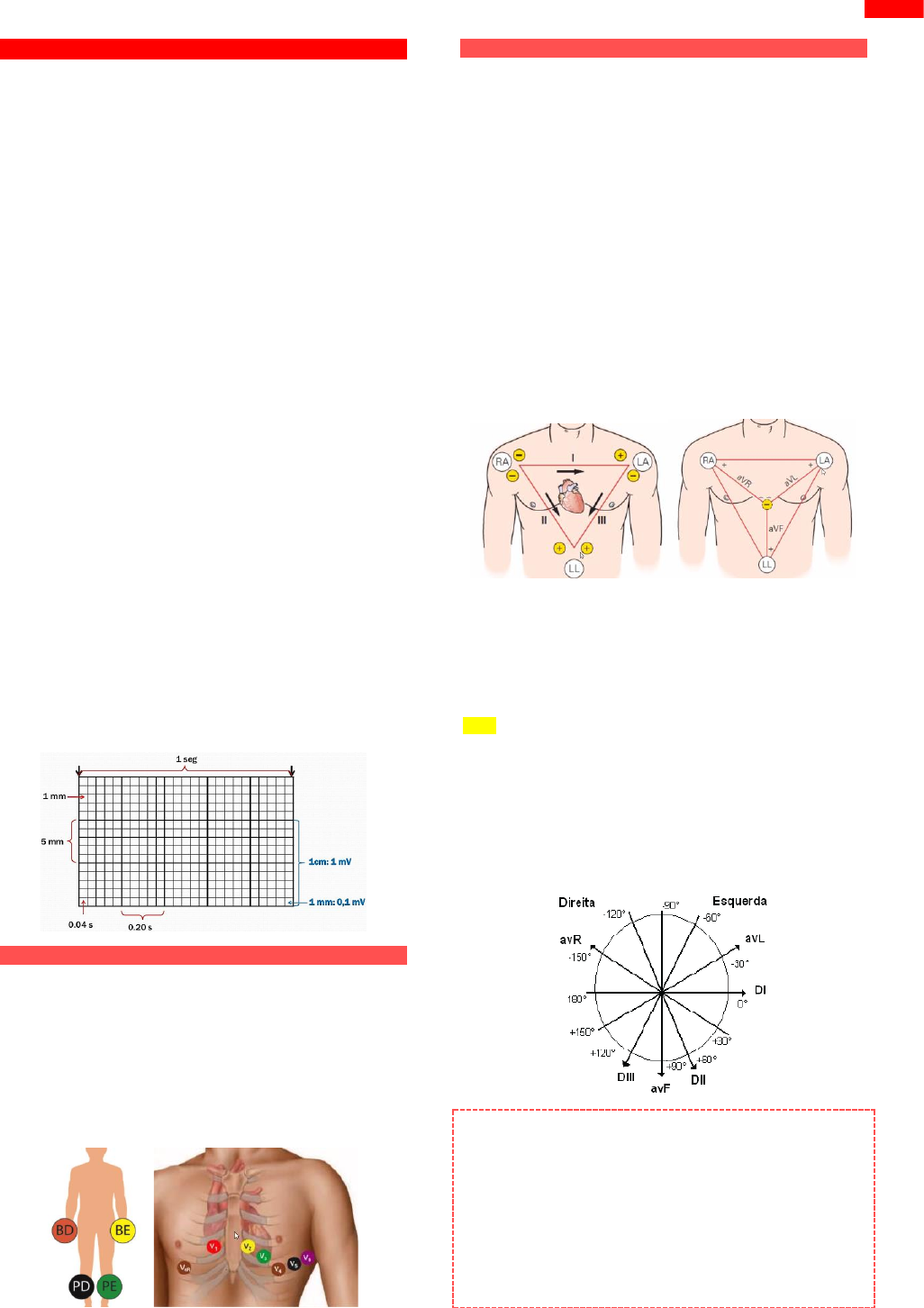 1 ECG NORMAL ELETROCARDIOGRAMA NORMAL É o registro da combinação de diversos eletrodos (4 nos membros e 6 no tórax) que fornecem dados sobre a geração e a condução do estímulo elétrico no coração. O ECG representa a soma da atividade elétrica de todas as células do coração registradas na superfície corporal. É importante para realização de diagnósticos, além de ser rápido, indolor e não invasivo. Avalia: ECG normal; Bradicardia e taquicardia; Arritmias cardíacas; Sobrecargas atriais e ventriculares; Bloqueios atrio-ventriculares (BAV 1º, 2º e 3º graus); Bloqueios de ramos e hemibloqueios; Coronariopatias agudas e/ou crônicas (isquemia, lesão, necrose); Miocardiopatias; Pericardites / Tamponamento cardíaco; Canalopatias; Marcapasso; Disturbios eletrolíticos (potassemia, calcemia, etc); Intoxicações exógenas; Hipotermia. Sistema cartesiano: Eixo das abcissas = tempo em segundos. Eixo das ordenadas = DDP em milivoltagem ou milímetro. O aparelho de ECG deve estar calibrado em 10 mm (= N), a velocidade em que o papel corre deve ser 25 mm/s e o filtro devem ser aplicados a fim de evitar interferencias (oleosidade da pele, tremores, pelos corporais, protetor solar, hidratante e suor). COLOCAÇÃO DOS ELETRODOS NO PACIENTE: Cabo vermelho no braço direito + cabo preto na perna direita. Cabo amarelo braço esquerdo + cabo verde perna esquerda. V1 – 4º espaço intercostal do lado direito do esterno. V2 – 4º espaço intercostal do lado esquerdo do esterno V3 – na diagonal entre V2 e V4 V4 – 5º espaço intercostal na linha medioclavicular esquerda V5 – 5º espaço intercostal esquerda na linha axilar anterior. V6 – 5º espaço intercostal esquerda na linha axilar média. DERIVAÇÕES DO ECG DE 12 DERIVAÇÕES: O ECG convencional tem 12 derivações: D1, D2, D3, aVR, aVL, aVF, V1, V2, V3, V4, V5 e V6. Convenção: Quando o estímulo se dirige para o eletrodo, ou seja, quando o eletrodo ‘’vê’’ o estímulo chegando com força nele, a onda sobe (ONDA POSITIVA). Quando o estímulo se dirige em diração oposta ao eletrodo, isto é, quando o eletrodo ‘’vê’’ o estímulo indo embora, a onda desce (ONDA NEGATIVA). Plano Frontal (periféricas): Bipolares: pega de um ponto a outro; mede atividade elétrica de um membro a outro; D1, D2 e D3. Unipolares: não pega de um ponto a outro; mede atividade elétrica de um membro a um eletrodo; pega do meio à direita (aVR), do meio para esquerda (aVL) e do meio pra baixo (aVF). RA = braço direito; LA = braço esquerdo; LL = perna esquerda. Convencionalmente, D1 é positivo para esquerda (mesmo sentido da força resultante de contração). Caso o paciente tenha alguma doença que faça o estímulo ir para direita e para cima (vetor indo embora), D1 será negativo (lado direito). Já D2 e D3 são positivos para baixo e negativos para cima. Obs.: perna direita funciona como fio terra, tirando a interferência. Todas as derivações tendem a ser positivas com exceção de aVR que tem sua onda positiva para o lado oposto ao vetor resultante. Força resultante de contração do coração = p/ esquerda e p/ baixo. Plano Horizontal (precordiais): V1, V2, V3, V4, V5 e V6. A atividade elétrica de todas as células do coração em um certo momento pode ser representada por um vetor resultante. Deflexão para cima no ECG significa que o fluxo de corrente está indo em direção ao lado positivo do eletrodo – estimulo se aproximando do eletrodo. Já uma deflexão para baixo significa que o vetor do fluxo do fluxo de corrente está indo em direção ao lado negativo do eletrodo – estimulo se afastando do eletrodo. Um vetor resultante que está perpendicular ao eixo do eletrodo não causa deflexão positiva nem negativa (fica na linha de base). Emmanuel Pacheco 2 ECG NORMAL ECG NORMAL COM RITMO SINUSAL Onda P: despolarização atrial, contração atrial, sístole atrial, soma do trabalho do VD e VE. Segmento P-R: período de latência para fechamento da valva AV Intervalo P-R: do início da onda P até chegar no QRS; é a ativação atrial. Onda P + segmento P-R. Não pode ser curto nem longo demais. Complexo QRS: despolarização ventricular, contração ventricular. Pode ser estreito, mas não pode ser largo pois significaria que o ventrículo está demorando demais para se despolarizar e contrais (insuficiência cardíaca, bloqueio no ramo). Obs.: Enquanto há sístole ventricular, há diástole atrial. Segmento S-T: período de fechamento das valvas semilunares (aorta e pulmonar) após a contração ventricular. Onda T: repolarização ventricular (onda positiva pois ocorre no mesmo sentido da despolarização, força resultante, vetores). No eletro normal, não se vê a repolarização atrial. Onda U: despolarização das fibras de Purkinje. Pode ser visível ou não. INTERPRETANDO O ECG 1. Identificar a frequência cardíaca. 2. Analisar o ritmo cardíaco (sinusal ou não sinusal). 3. Onda P (duração, amplitude e morfologia). 4. Intervalo PR (duração). 5. QRS (duração, amplitude e morfologia). 6. Determinar o eixo QRS. 7. Verificar o segmento ST. 8. Onda T (morfologia e direção). 9. Intervalo QT. 10. Encontrar anormalidade se houver. DETERMINAÇÃO DA FREQUENCIA CARDÍACA A frequência cardíaca medida em batimentos por minuto (bpm) pode ser calculada pela divisão de 300 pelo número de quadrados grandes (de 5 mm) entre duas ondas R seguidas, ou seja, entre duas sístoles. Ou seja → 300, 150, 100, 75, 60, 50, 43, 38, 33. RITMO CARDÍACO O ritmo cardíaco pode ser sinusal ou não sinusal. O ritmo sinusal é aquele que é determinado pelo nó sinusal. Se o vetor do ritmo sinusal sempre se dirigirá para baixo e para esquerda do paciente, ele estará sempre se aproximando de DI, D2 de aVF, ou seja, será positivo nessas derivações. Critérios para definir um ritmo sinusal: Morfologia e orientação de P normal, ou seja, positiva em D1, D2 e aVF e negativo em aVR; Ondas P com mesma morfologia; A